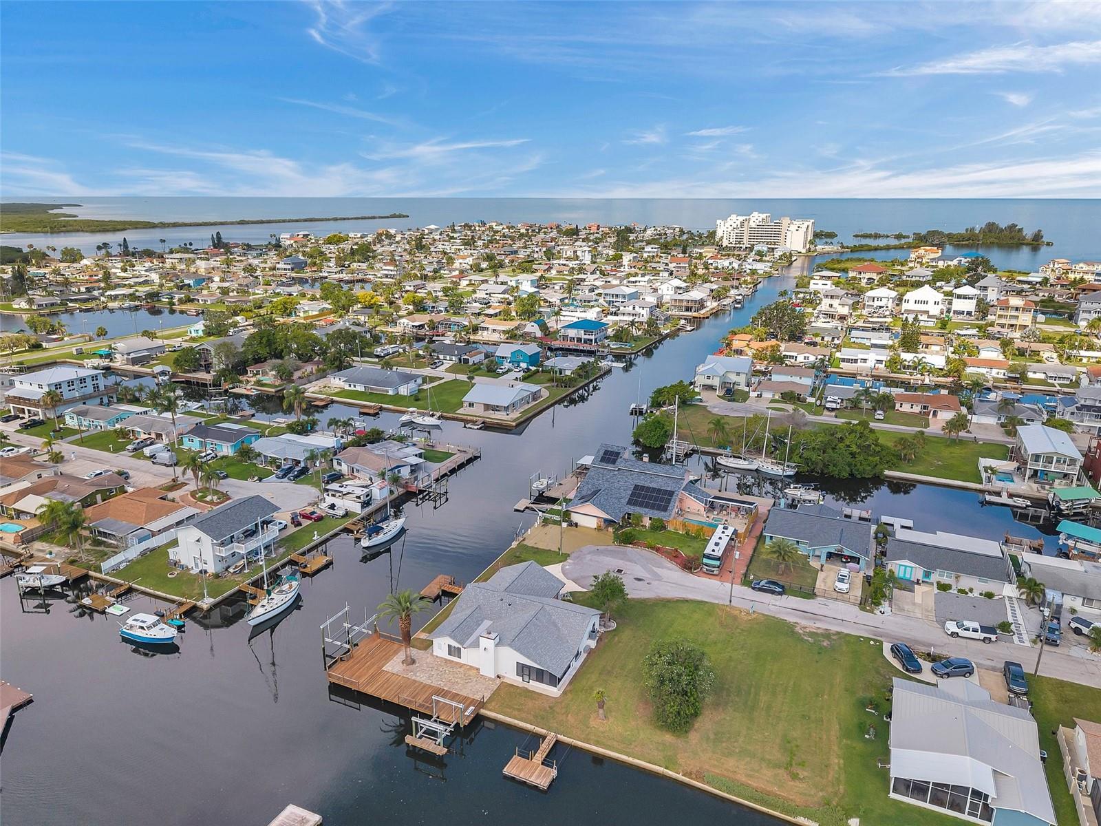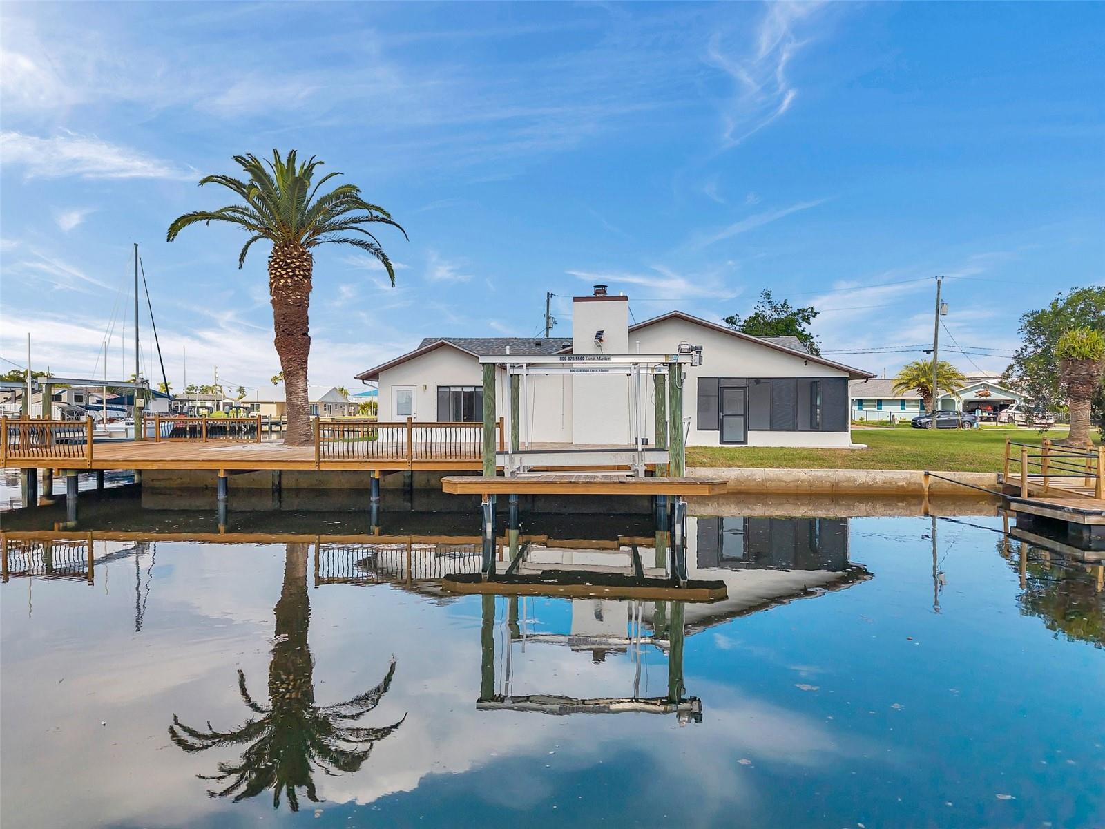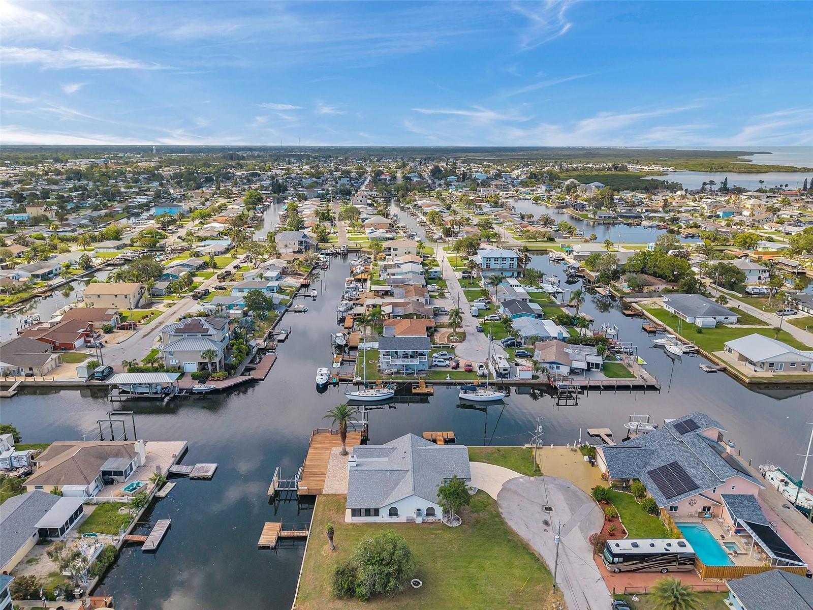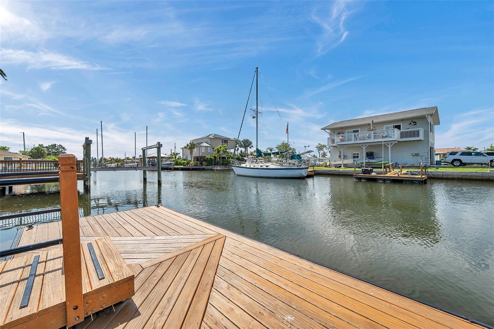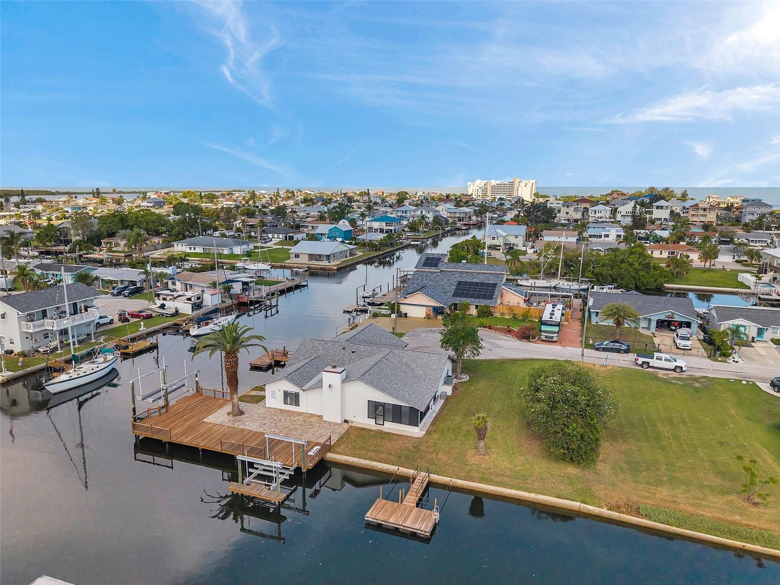 One or more photo(s) has been virtually staged. Welcome to your dream home in the sought-after coastal community of Hudson Beach Estates. Situated at the end of a quiet cul-de-sac on an oversized 0.27-acre lot, this waterfront stunner boasts 270-degree panoramic water views and over 200 feet of waterfront—a rare gem perfect for boaters and sunset lovers alike. This home features two floating docks, 2 boat lifts (one 16K and one 10K), and an expansive wraparound deck for entertaining, lounging, and taking in the views. Minutes to the open Gulf, only 5 canals away, this is a boater’s paradise. Step inside this newly remodeled home to an open-concept layout that seamlessly blends indoor and outdoor living. The kitchen offers beautiful quartz countertops, stainless steel appliances and white cabinets for that classic coastal feel. The spacious primary bedroom has a private ensuite, with walk-in shower, and two large closets. There are two additional bedrooms and a bathroom in a split-floor plan design offering privacy and comfort. The family room boasts a wood burning fireplace to snuggle up while enjoying the water views. There is a covered screen porch off the family room and a bonus room off the primary suite, ideal as a home office, guest lounge or game room. New roof installed in 2022. Bring all your toys! This waterfront community has sailboat deep water and is RV and golf cart friendly. There is a public beach just a short ride on your golf cart with waterfront restaurants and marinas. A 45-minute ride to Tampa International Airport. Close to New Port Richey’s historic downtown, rich with dining, culture and family-friendly activities. Come enjoy the Florida Waterfront lifestyle in this beautiful move in ready home. Schedule your private showing today! Home is also listed for rent, please see MLS # W7877100