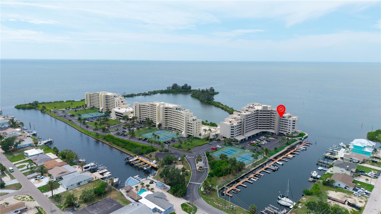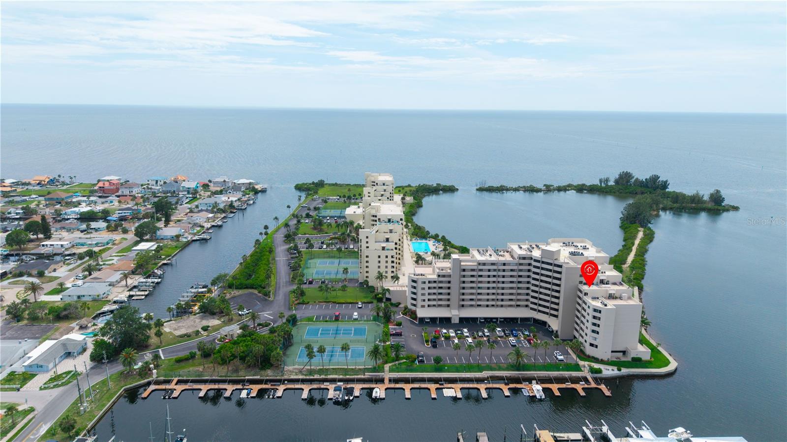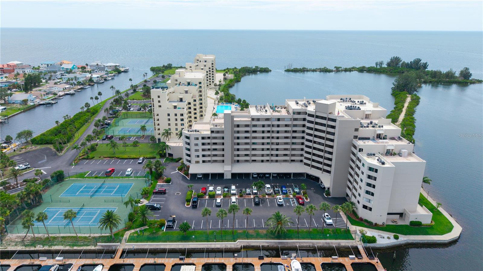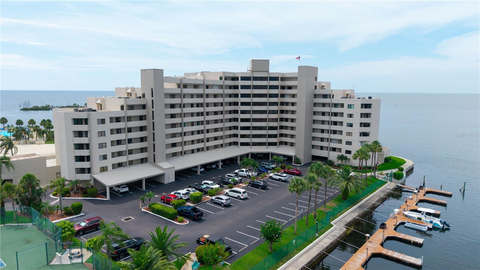 Welcome to Sea Ranch at Gulf Island Beach & Tennis Club—where luxury, leisure, and lifestyle come together in this impeccably maintained 2-bedroom, 2-bath waterfront retreat with a parking garage spot. Perched on the 4th floor, this stunning residence offers panoramic Gulf views from nearly every room, framed by expansive sliding glass doors that invite the outdoors in. Enjoy breathtaking sunsets from your private balcony, overlooking the tranquil lagoon and resort-style pool. The light-filled open-concept layout includes a bonus room at the front—ideal for a stylish home office or cozy den. The spacious primary suite showcases a newly updated bathroom with a step-in shower, double sinks, and custom storage. The guest bath has also been tastefully refreshed, featuring a soaking tub and shower combination. For your convenience, the unit includes a stackable washer and dryer. This exclusive guard-gated community offers more than just stunning views—it’s a vibrant coastal lifestyle. Residents enjoy access to tennis courts, pickleball, waterfront, and frequent social events. Whether you're looking for active recreation or quiet relaxation, there’s something for everyone to enjoy. Optional boat slips for purchase, on-site storage, storm shutters included, and close proximity to upscale dining, shopping, and endless Gulf Coast adventures—this is Florida living at its finest. Live where others vacation—your luxurious slice of paradise awaits.