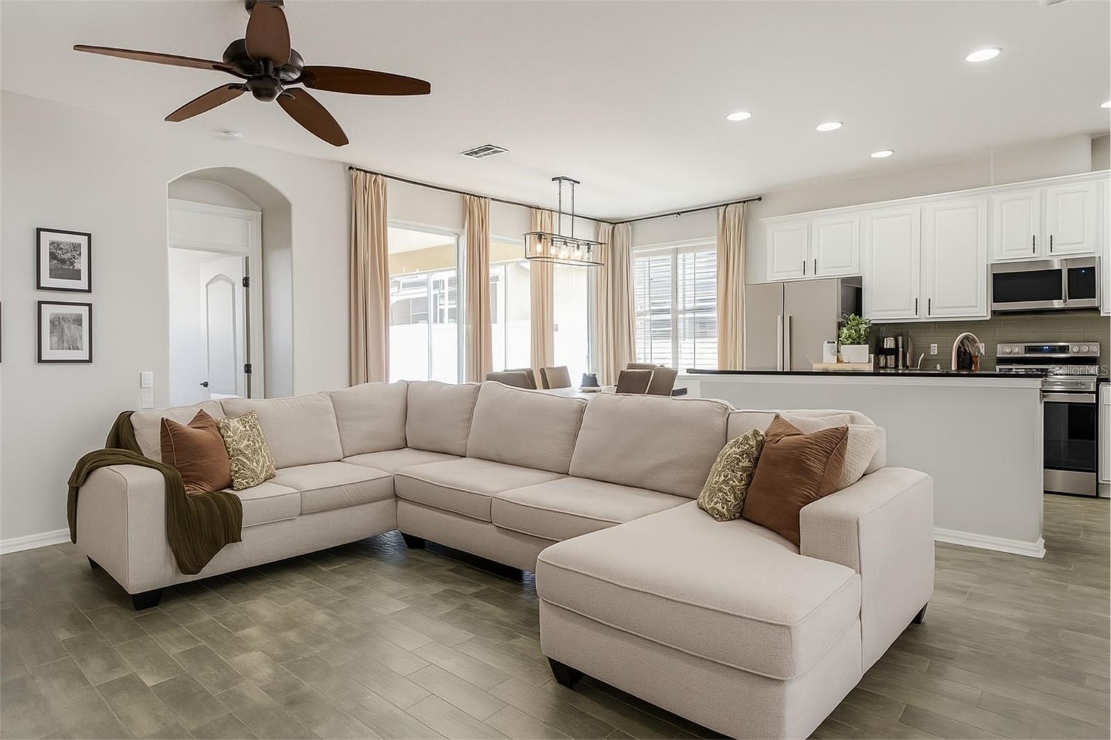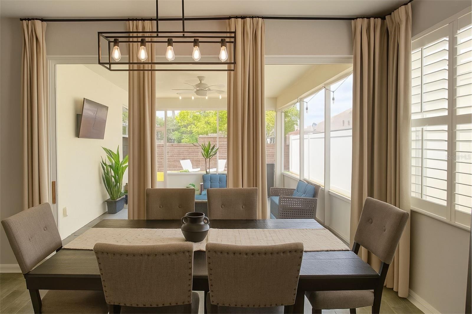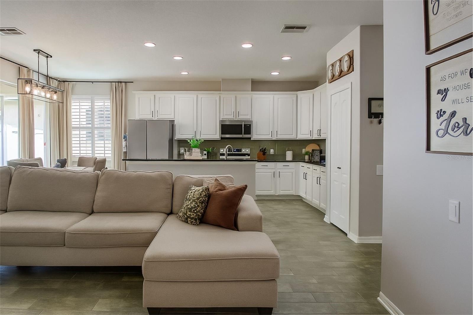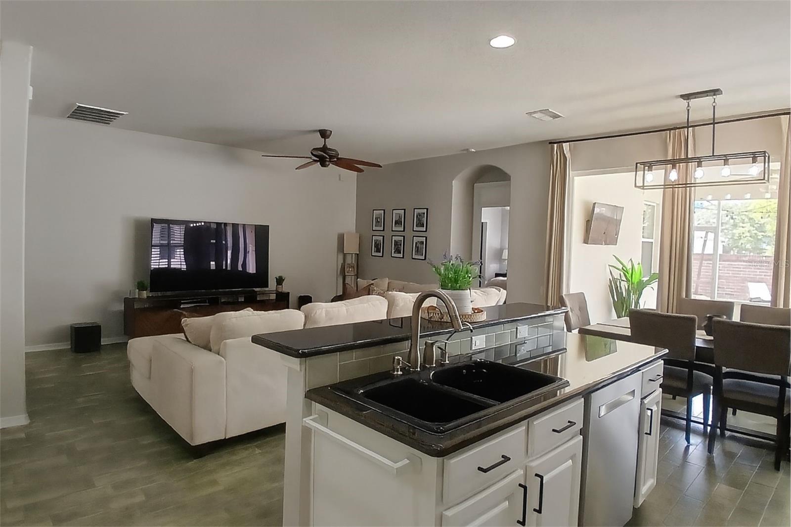 One or more photo(s) has been virtually staged. Welcome to this beautifully upgraded gem in the desirable Highlands gated community of Hudson! Step inside to discover a formal living and dining space just off the entry — the perfect flex area to adapt as a home office, kids’ playroom, or second family room. High ceilings, timeless plantation shutters, and upgraded wood-look tile flooring run throughout, creating a cohesive and stylish feel. The heart of the home is a stunning, magazine-worthy kitchen featuring crisp white cabinetry, granite counters, sleek stainless appliances, a designer green subway tile backsplash, and a large prep island. An adjacent eat-in dining area boasts a modern chandelier and looks out to the backyard through sliding glass doors, blending indoor and outdoor entertaining with ease. The spacious primary suite includes an elegant tray ceiling, abundant natural light, and a relaxing ensuite bath with a soaking tub, separate glass-enclosed shower, and dual-sink vanity — all accented by plantation shutters and updated lighting for a fresh, spa-like vibe. Two additional bedrooms and a tastefully updated secondary bath provide plenty of space for family or guests. Step out to the oversized screened lanai, where stylish tile flooring, string lighting, and ample room for seating or grilling invite you to unwind in true Florida style. The backyard is partially enclosed with low-maintenance PVC fencing on one side and a brick community fence at the rear, adding a private, polished touch rarely found in comparable homes. Just a short half block stroll brings you to the community pool, enhancing the resort-style amenities. Additional peace of mind comes with a newer AC system (2018), plus the seller is willing to replace the original 2005 roof prior to closing with an acceptable offer — no surprises for the next owner. Ideally located just off Little Road, you’ll have quick access to shops, dining, top-rated schools, parks, and commuter routes for an easy lifestyle. This move-in-ready home truly checks every box: flexible spaces, high-end finishes, and a prime gated community location. Don’t miss the chance to make it yours — schedule your showing today!
