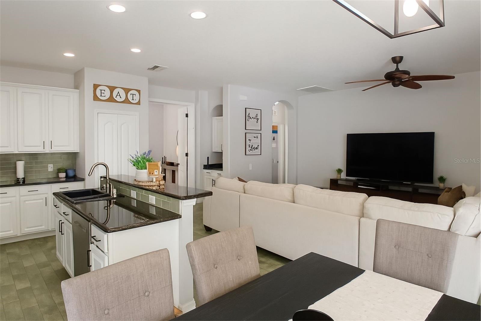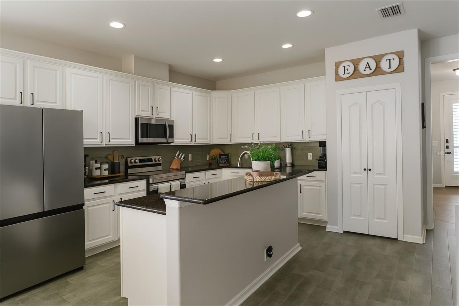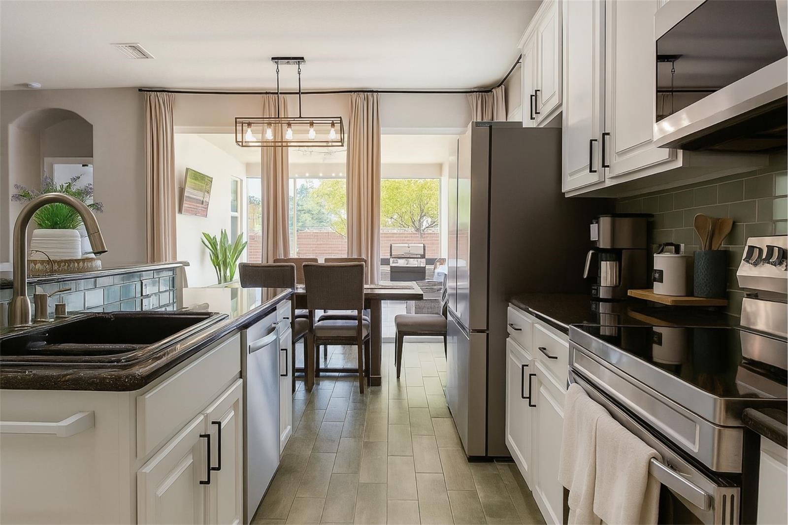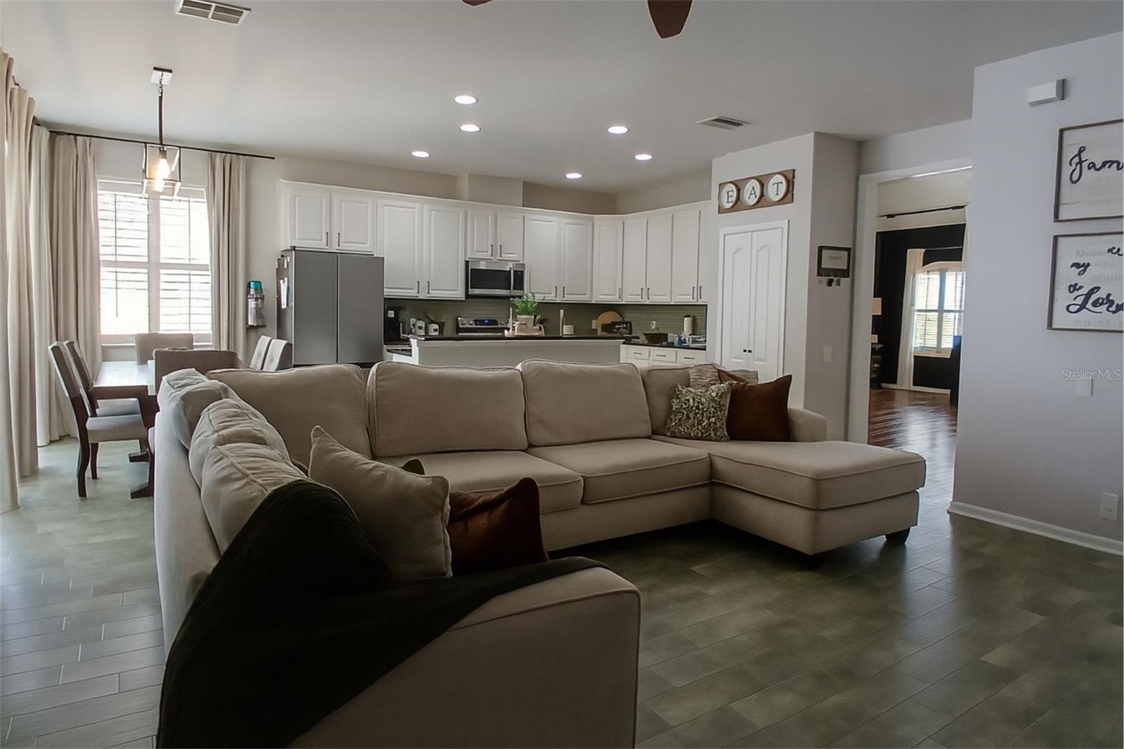 One or more photo(s) has been virtually staged. Welcome to this beautifully upgraded gem in the desirable Highlands gated community of Hudson! Step inside to discover a formal living and dining space just off the entry — the perfect flex area to adapt as a home office, kids’ playroom, or second family room. High ceilings, timeless plantation shutters, and upgraded wood-look tile flooring run throughout, creating a cohesive and stylish feel. The heart of the home is a stunning, magazine-worthy kitchen featuring crisp white cabinetry, granite counters, sleek stainless appliances, a designer green subway tile backsplash, and a large prep island. An adjacent eat-in dining area boasts a modern chandelier and looks out to the backyard through sliding glass doors, blending indoor and outdoor entertaining with ease. The spacious primary suite includes an elegant tray ceiling, abundant natural light, and a relaxing ensuite bath with a soaking tub, separate glass-enclosed shower, and dual-sink vanity — all accented by plantation shutters and updated lighting for a fresh, spa-like vibe. Two additional bedrooms and a tastefully updated secondary bath provide plenty of space for family or guests. Step out to the oversized screened lanai, where stylish tile flooring, string lighting, and ample room for seating or grilling invite you to unwind in true Florida style. The backyard is partially enclosed with low-maintenance PVC fencing on one side and a brick community fence at the rear, adding a private, polished touch rarely found in comparable homes. Just a short half block stroll brings you to the community pool, enhancing the resort-style amenities. Additional peace of mind comes with a newer AC system (2018), plus the seller is willing to replace the original 2005 roof prior to closing with an acceptable offer — no surprises for the next owner. Ideally located just off Little Road, you’ll have quick access to shops, dining, top-rated schools, parks, and commuter routes for an easy lifestyle. This move-in-ready home truly checks every box: flexible spaces, high-end finishes, and a prime gated community location. Don’t miss the chance to make it yours — schedule your showing today!