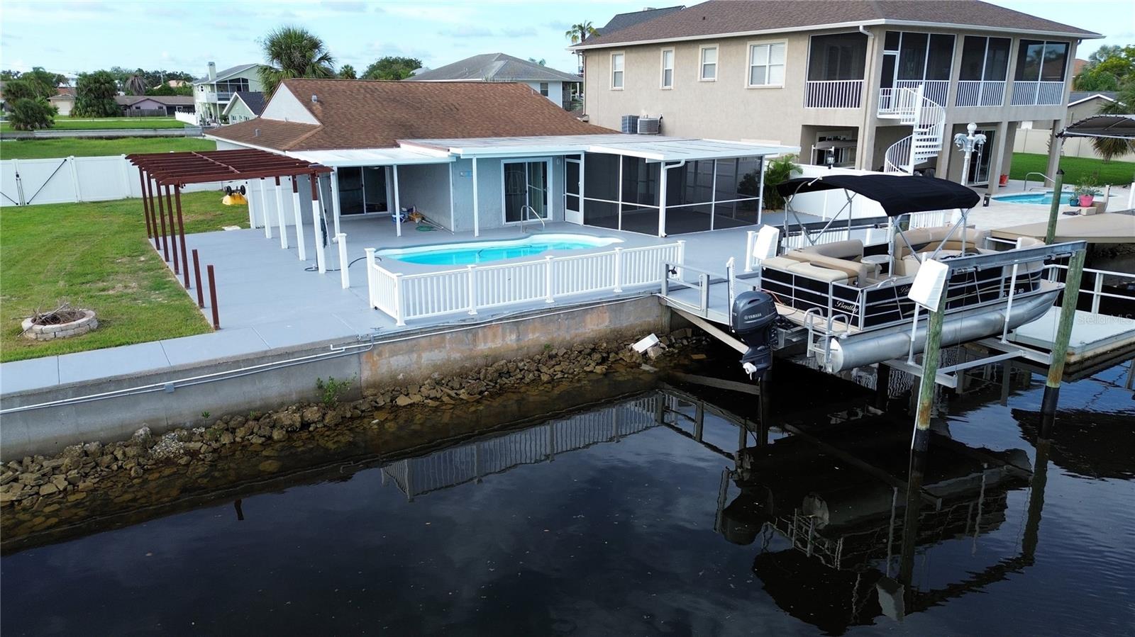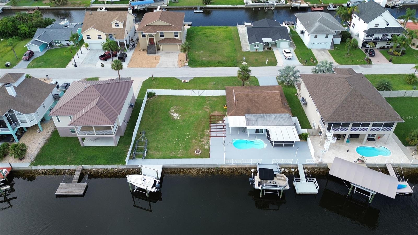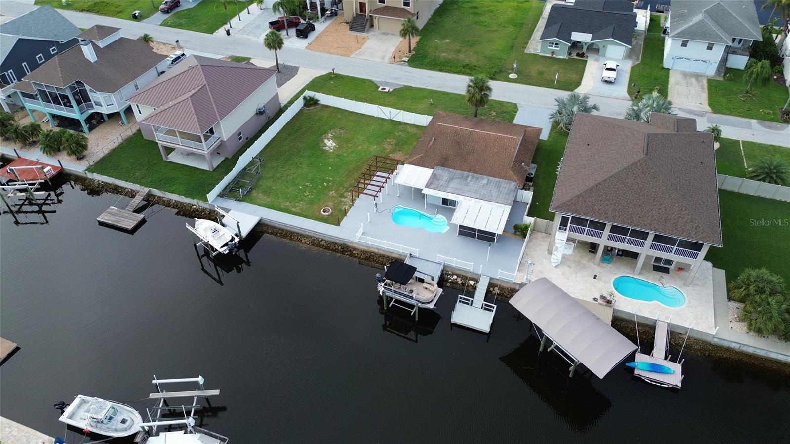 Embrace the ultimate boater’s lifestyle with DOUBLE LOTS, DOUBLE BOAT LIFTS, and DOUBLE the WATERFRONT FOOTAGE! (approximately 120 feet of sea wall!) This charming 2 bedroom, 2 bath POOL home will become your private piece of heaven. Step into a bright, open floor plan that offers effortless flow and modern comfort. Beautiful fluid tile flooring runs throughout enhancing the spacious feel and tying each room together seamlessly. The heart of the home is the beautifully appointed kitchen featuring stainless steel appliances and a granite island, perfect for gatherings, prepping or serving up dinner. Step out to the screened in patio, your own private retreat to enjoy ocean breezes, morning coffee or sunset cocktails. Around the pool there is plenty of space to sunbath, entertain and BBQ (an additional covered porch off the master bedroom offers shaded shelter as well as screened patio) or take a refreshing dip in the pool after a relaxing day on the water. For the boater in the family there are TWO BOAT LIFTS, (as well as an additional floating dock) each capable of supporting up to 10,000 lbs, you’ll have effortless water access right from your backyard. Each boat lift conveniently has water and power to make post boating clean up a snap. The home sits on a direct Gulf-access saltwater canal where you can be in the Gulf of America in just a few minutes. Love Florida wildlife? Don’t be surprised to see dolphins or manatees right in your backyard canal! The expansive backyard spans a second, fully privacy-fenced lot—offering a rare blend of space and seclusion. Whether you envision a garden, fire pit or just need room to store your boat, trailer or toys, the possibilities are truly endless. It's a private coastal retreat with all the room you need to live the lifestyle you’ve been dreaming of. If you don’t need the added space, the lots can be DIVIDED and you can sell it or BUILD on it, the choice is yours.