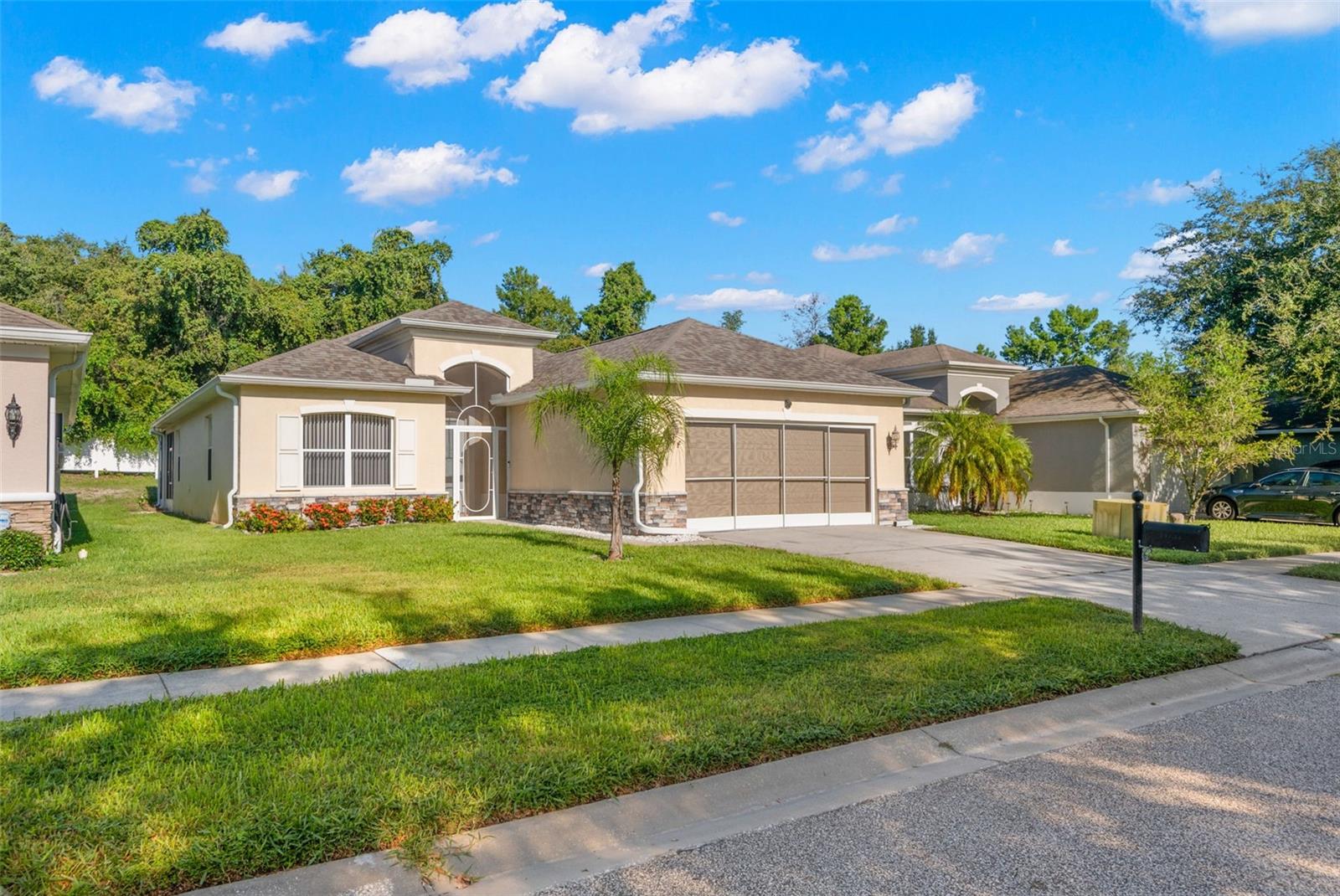Welcome to Highlands — a desirable gated community in Hudson with a beautifully landscaped, elegant entry. This 3-bedroom, 2-bathroom 2 car garage Pioneer-built block home offers 1,979 sq. ft. of quality construction, thoughtful design, and upscale finishes. From the moment you step inside, you’ll notice the soaring 9-ft ceilings, premium trim package with elegant radius corners, and the warm beauty of upgraded Saltillo tile flooring — no carpet anywhere. The open-concept layout is perfect for everyday living and entertaining, with the spacious great room at the heart of the home flowing seamlessly into the dining area and well-appointed kitchen. Here you’ll find durable Corian countertops, custom tile work, and abundant cabinet space for storage. The formal dining room offers flexibility for hosting dinner parties or creating a home office, hobby space, or playroom. The private primary suite is a true retreat, featuring an upgraded ceramic-tile surround above the jetted tub, separate tiled shower (walls plus tile floor), dual-sink vanity, privacy door to toilet and a generous walk-in closet. Two additional bedrooms and a full guest bath are located on the opposite side of the home for comfort and privacy. Step outside to enjoy the custom rock façade, screened door on the oversized garage, an extended screened lanai and a peaceful backyard perfect for outdoor gatherings. Recent updates provide added peace of mind, including a new roof (2024), complete AC system change out (2020), and a 3-year-old water heater. Solid block construction, cast iron tub in main, and quality finishes speak to the craftsmanship of this home. This home has lots of electrical outlets and handicapped counter height and switches. Highlands offers secure gated entry and a prime location just minutes from shopping, dining, parks, and major commuter routes. Offered at $325,000 and complete with a home warranty, this move-in-ready property combines comfort, style, and location — the perfect place to call home. Seller will consider owner financing with one third down.