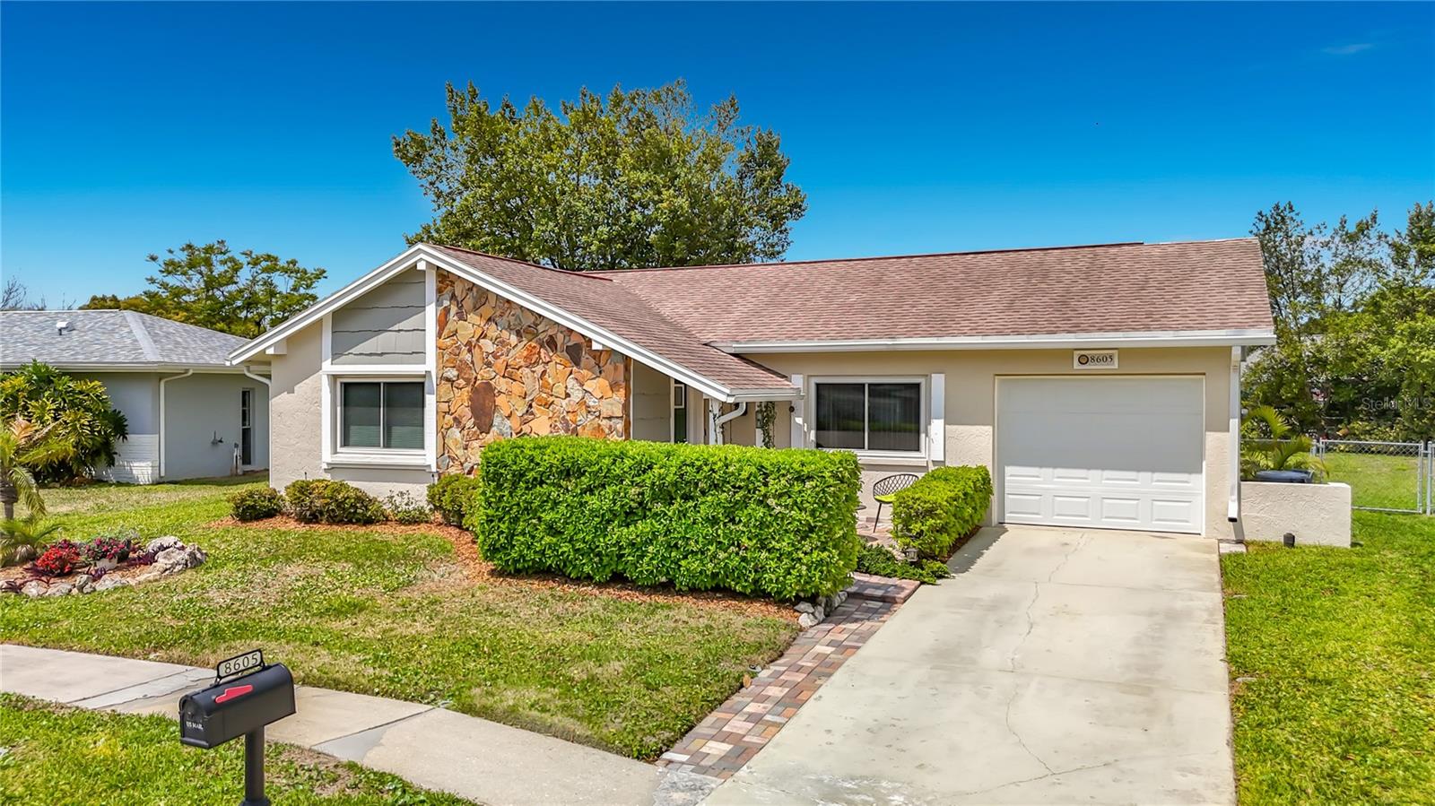 This 3 bedroom, two bath home is a fantastic find where you can live the Florida Lifestyle with financial peace of mind knowing this is NOT a flood zone, there are NO CDD fees, and extremely low HOA fees. This lovely home has it all: a modern kitchen with quartz counter tops and integrated sink, luxury vinyl plank flooring, the combination of a private front courtyard and screened lanai overlooking the large fenced back yard. Beacon Woods East is a designated Bird Sanctuary with ample sidewalks to enjoy walking and biking. The Clubhouse offers a huge salt water pool, tennis courts and scheduled activities. All of this within a short distance of the Suncoast Highway, giving you quick access to the Tampa Airport, world class beaches and many attractions such as Busch Gardens and Adventure Island.