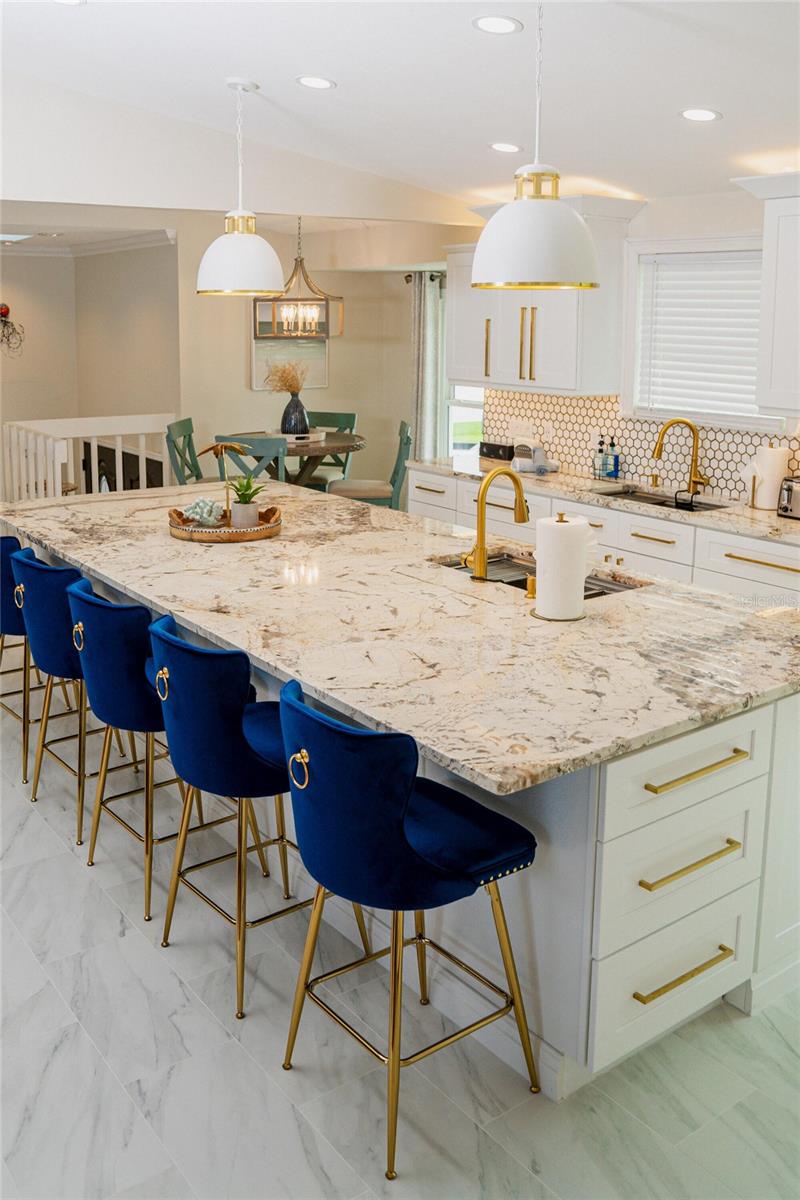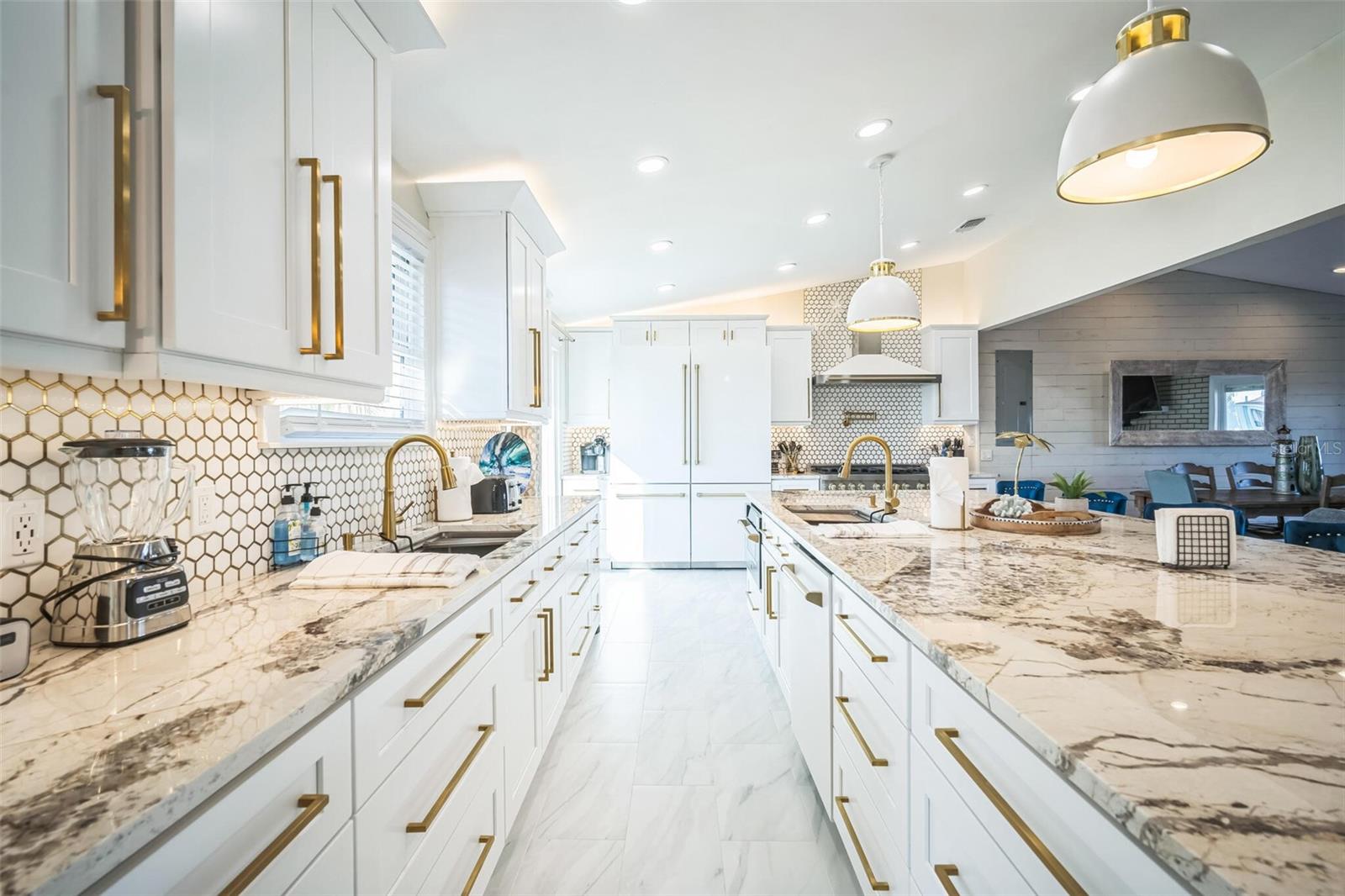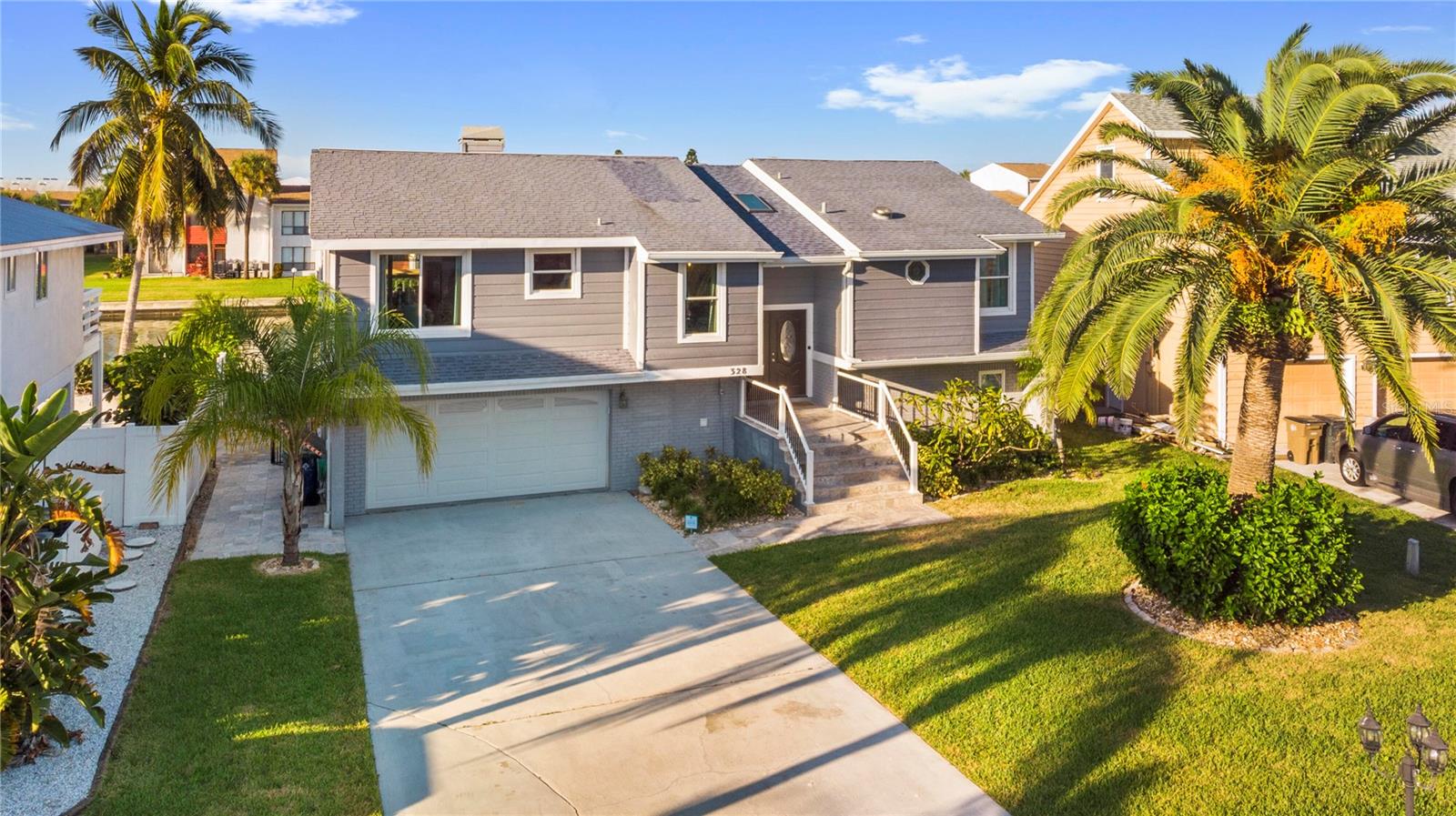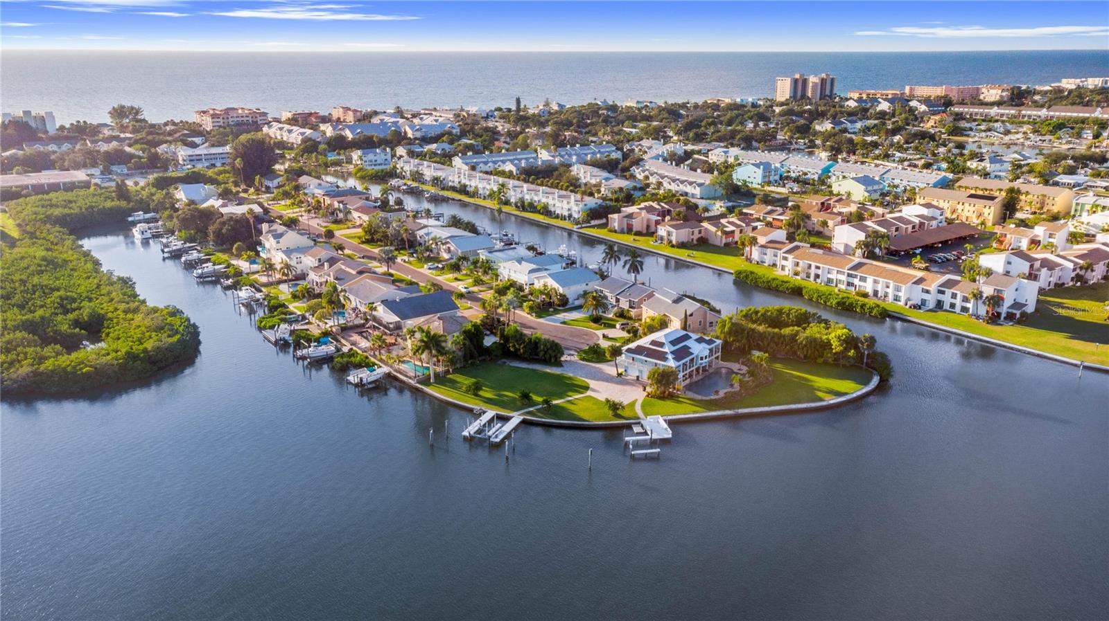 This is an extremely rare home, it has incredible water views from both the front and back of the home. It’s fully furnished and managed by a top-tier operator. It boasts a multiyear proven track record as a rental. It features a spectacularly remodeled, stunning chef’s kitchen featuring a 60” wide fridge, double sinks, a 48” dual fuel gas range and electric double ovens and a massive 13’ x 5.5’ island with bar seating for 7. Positioned on a saltwater canal, the property features a heated pool and a dock equipped with both above and underwater lighting. The seawall has been recently updated, and the boat access has been newly dredged, complemented by a whole-home generator for added convenience. Nestled on a quiet, dead-end street alongside other upscale residences, this home has a balanced blend of tranquility and accessibility, being just moments away from the beach, dining, nightlife, shopping, and a water park. Enjoy leisurely strolls to witness stunning sunsets or dine at nearby beachside restaurants. For the fishing enthusiast, cast a line off your dock or set sail to the Gulf, which is only minutes away via the Clearwater Inlet. This location is great for families of all ages seeking enjoyment. Upon entry through the covered double doors, you are greeted by a marble-tiled foyer leading to a thoughtfully designed interior. The expansive 27-foot family room features a fireplace, built-in shelves, and panoramic water views, with double sliding doors on both sides of the fireplace, that open to a spacious balcony. The kitchen showcases elegant, all wood shaker cabinetry, granite countertops, finished stainless steel appliances, a marble tile backsplash and ceramic tile flooring. Adjacent to the kitchen, the dining room is a part of the great room that has the kitchen, dining and family room, all has views of the intracoastal waters. Even the loft/breakfast area provides additional water views. High end LVP waterproof flooring extends through the family room, hallway, and bedrooms, complemented by ceramic tiles in the kitchen and bathrooms. The master en-suite boasts a walk-in closet with French doors leading to a luxurious master bath, which includes a double vanity with granite countertops, a tiled walk-in shower with a glass enclosure, dual shower heads, a stained glass window, and a jacuzzi tub. The guest bath features a beautifully tiled walk-in shower with a glass door and a stylish vanity. Downstairs, a generous 24'x16' bonus room with sliding glass doors opens to the pool and lanai area. The pool, heated and surrounded by elegant travertine pavers, overlooks the dock and waterway. Additional features include a brand new Generac natural gas full house generator, brand new roof, a new gas pool heater, and a tankless gas water heater. The expansive backyard offers ample space for both covered and uncovered entertaining. Numerous enhancements and upgrades to this home are too extensive to list. This property is a must-see! Your dream of Florida living awaits!.