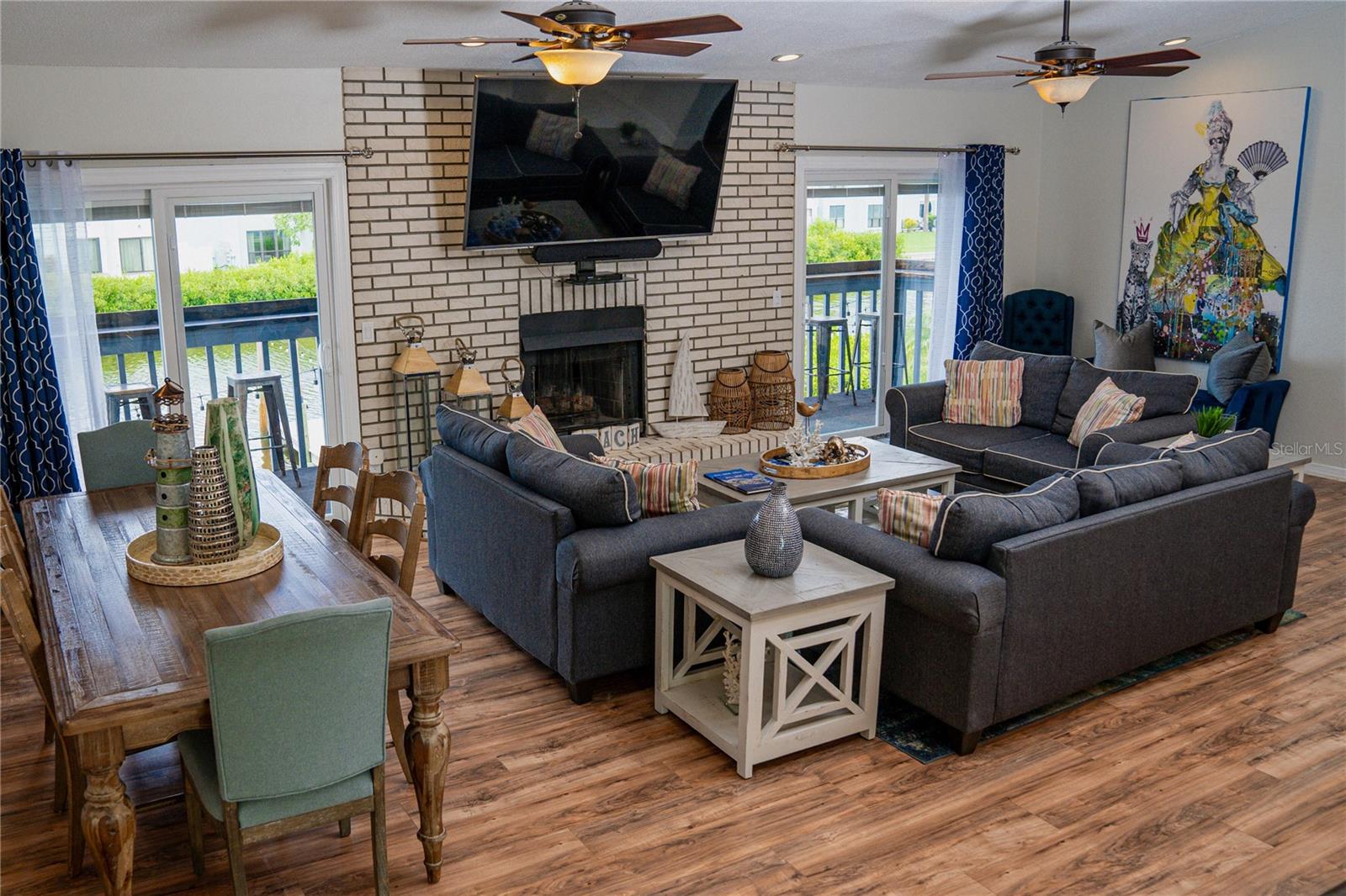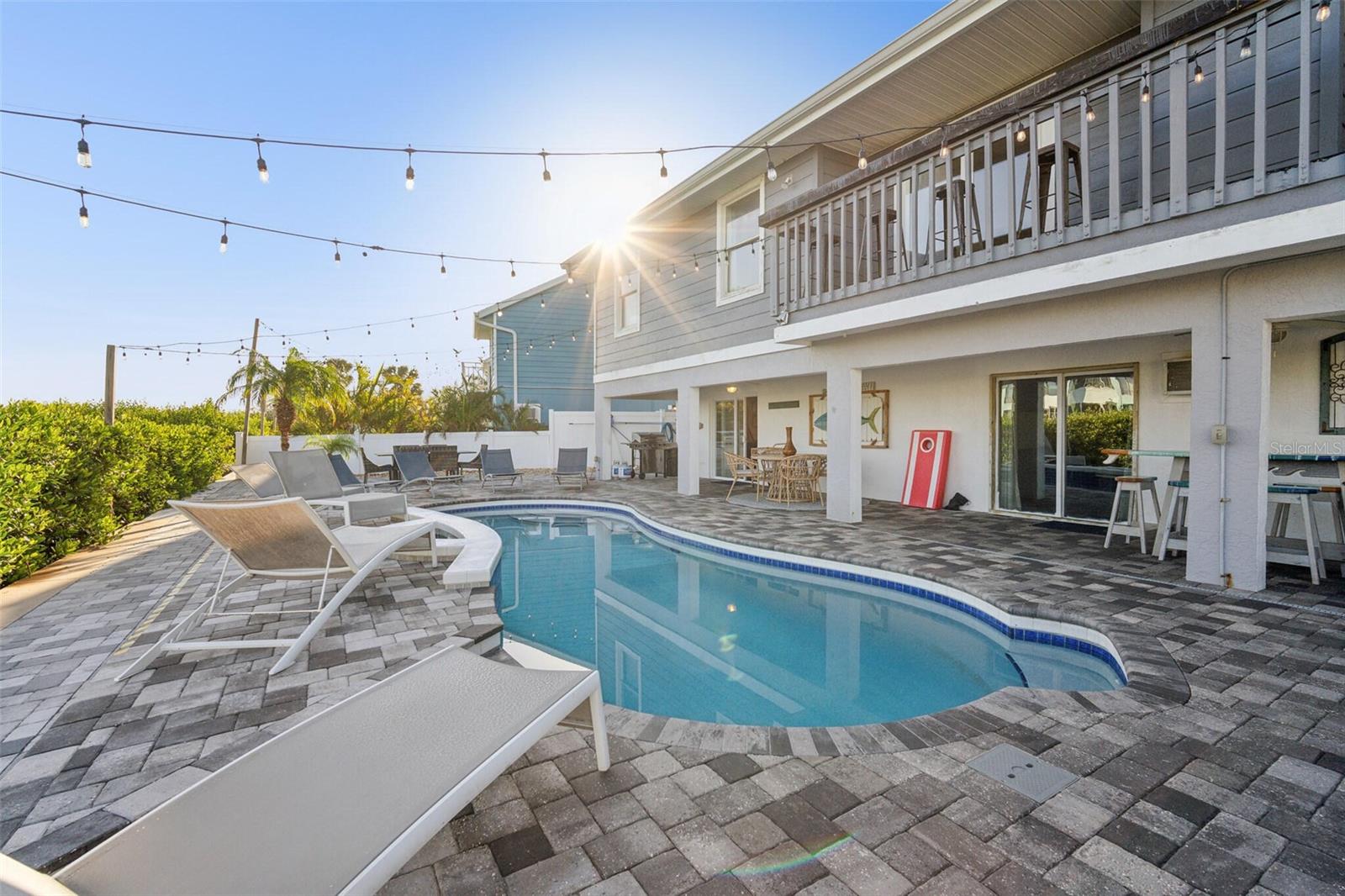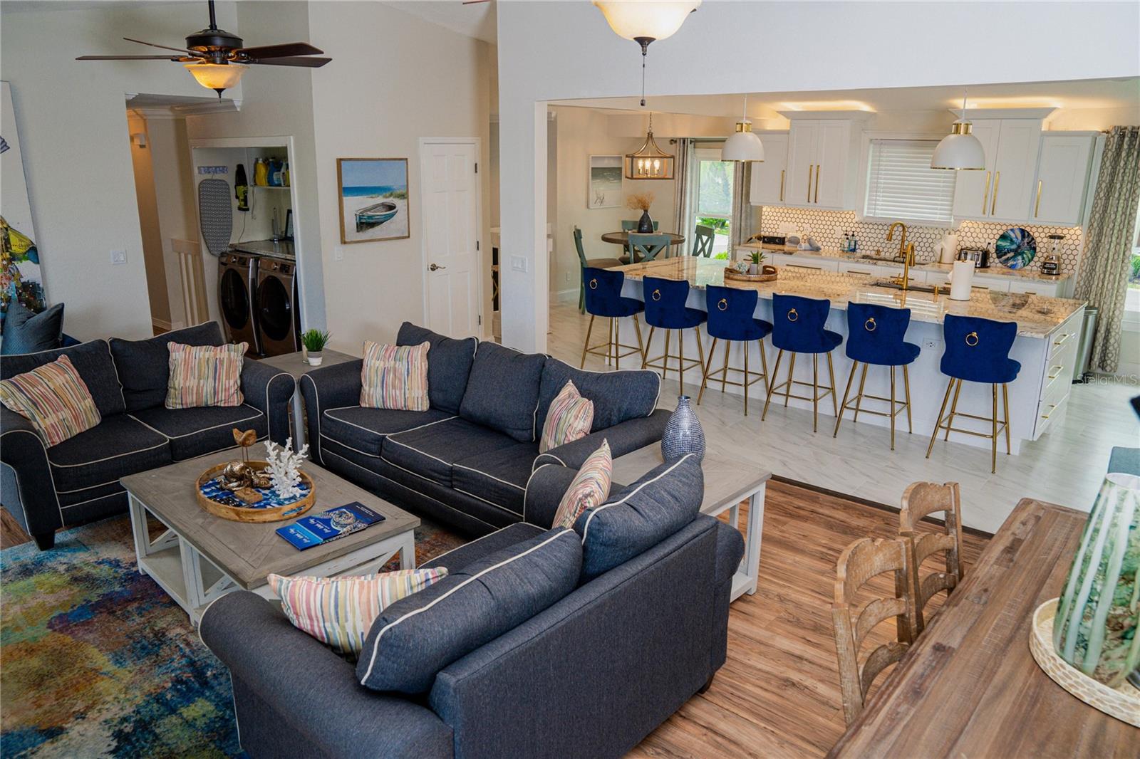 This is an extremely rare home, it has incredible water views from both the front and back of the home. It’s fully furnished and managed by a top-tier operator. It boasts a multiyear proven track record as a rental. It features a spectacularly remodeled, stunning chef’s kitchen featuring a 60” wide fridge, double sinks, a 48” dual fuel gas range and electric double ovens and a massive 13’ x 5.5’ island with bar seating for 7. Positioned on a saltwater canal, the property features a heated pool and a dock equipped with both above and underwater lighting. The seawall has been recently updated, and the boat access has been newly dredged, complemented by a whole-home generator for added convenience. Nestled on a quiet, dead-end street alongside other upscale residences, this home has a balanced blend of tranquility and accessibility, being just moments away from the beach, dining, nightlife, shopping, and a water park. Enjoy leisurely strolls to witness stunning sunsets or dine at nearby beachside restaurants. For the fishing enthusiast, cast a line off your dock or set sail to the Gulf, which is only minutes away via the Clearwater Inlet. This location is great for families of all ages seeking enjoyment. Upon entry through the covered double doors, you are greeted by a marble-tiled foyer leading to a thoughtfully designed interior. The expansive 27-foot family room features a fireplace, built-in shelves, and panoramic water views, with double sliding doors on both sides of the fireplace, that open to a spacious balcony. The kitchen showcases elegant, all wood shaker cabinetry, granite countertops, finished stainless steel appliances, a marble tile backsplash and ceramic tile flooring. Adjacent to the kitchen, the dining room is a part of the great room that has the kitchen, dining and family room, all has views of the intracoastal waters. Even the loft/breakfast area provides additional water views. High end LVP waterproof flooring extends through the family room, hallway, and bedrooms, complemented by ceramic tiles in the kitchen and bathrooms. The master en-suite boasts a walk-in closet with French doors leading to a luxurious master bath, which includes a double vanity with granite countertops, a tiled walk-in shower with a glass enclosure, dual shower heads, a stained glass window, and a jacuzzi tub. The guest bath features a beautifully tiled walk-in shower with a glass door and a stylish vanity. Downstairs, a generous 24'x16' bonus room with sliding glass doors opens to the pool and lanai area. The pool, heated and surrounded by elegant travertine pavers, overlooks the dock and waterway. Additional features include a brand new Generac natural gas full house generator, brand new roof, a new gas pool heater, and a tankless gas water heater. The expansive backyard offers ample space for both covered and uncovered entertaining. Numerous enhancements and upgrades to this home are too extensive to list. This property is a must-see! Your dream of Florida living awaits!.