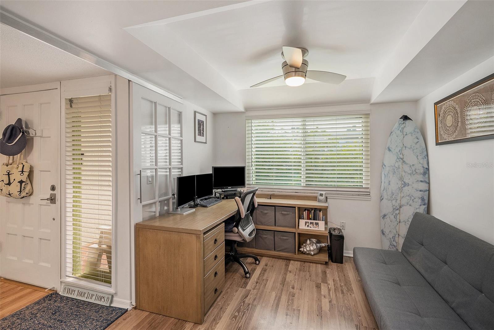 This unique unit offers a rare five private parking spaces—four directly under the unit and one adjacent to the staircase—enhancing both livability and rental potential. This beautifully maintained 3-bedroom, 2.5-bathroom condo, spanning 1,390 sq. ft. and built in 1980. The third bedroom offers versatile use as a guest room or home office, perfect for remote work. The primary bedroom boasts multiple closets, including a spacious walk-in closet. Enjoy newer wood laminate flooring throughout, with tiled bathrooms upstairs for added elegance. Recent updates include a newly replaced flat roof and a 2016 HVAC system. Relish the convenience of being just minutes away from Indian Rocks Beach, and unwind on your large balcony with a stunning view of the pool. The kitchen features sleek quartz countertops and stainless steel appliances, complemented by gray wash wood laminate flooring. Additionally, the condo is compliant as a short-term rental (STR) and benefits from tuck-under parking, making it a desirable two-story complex. Don't miss out on this exceptional opportunity!