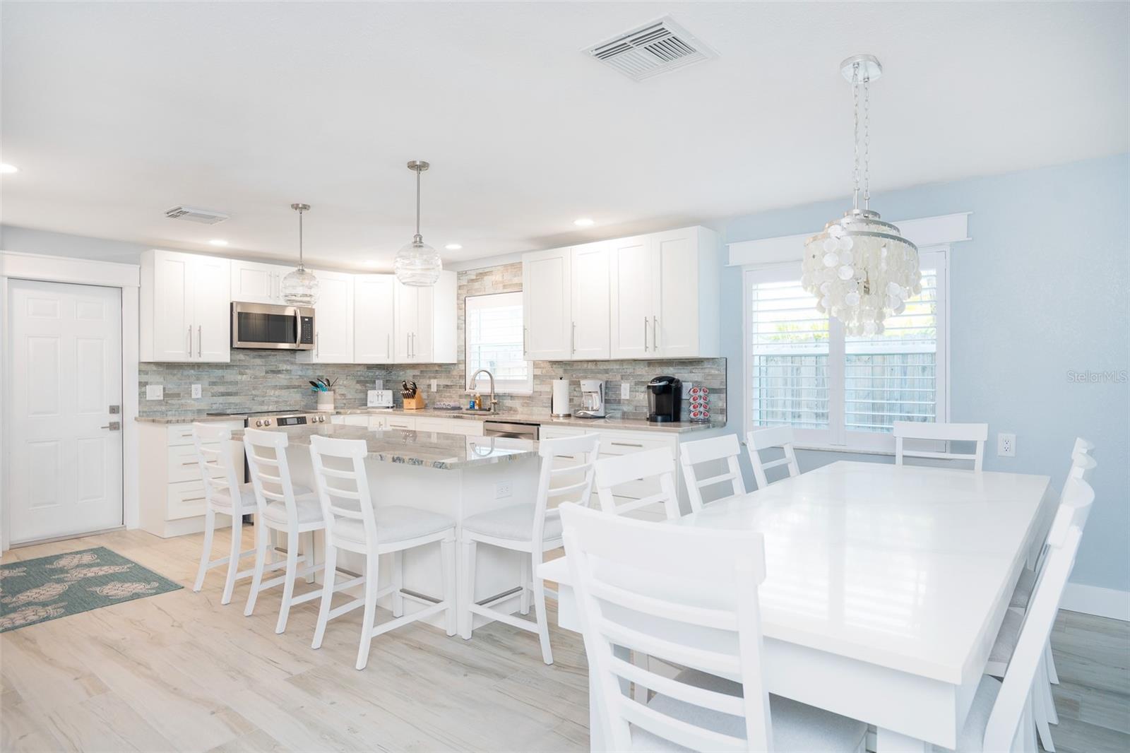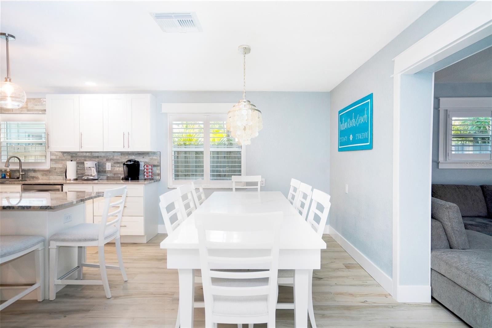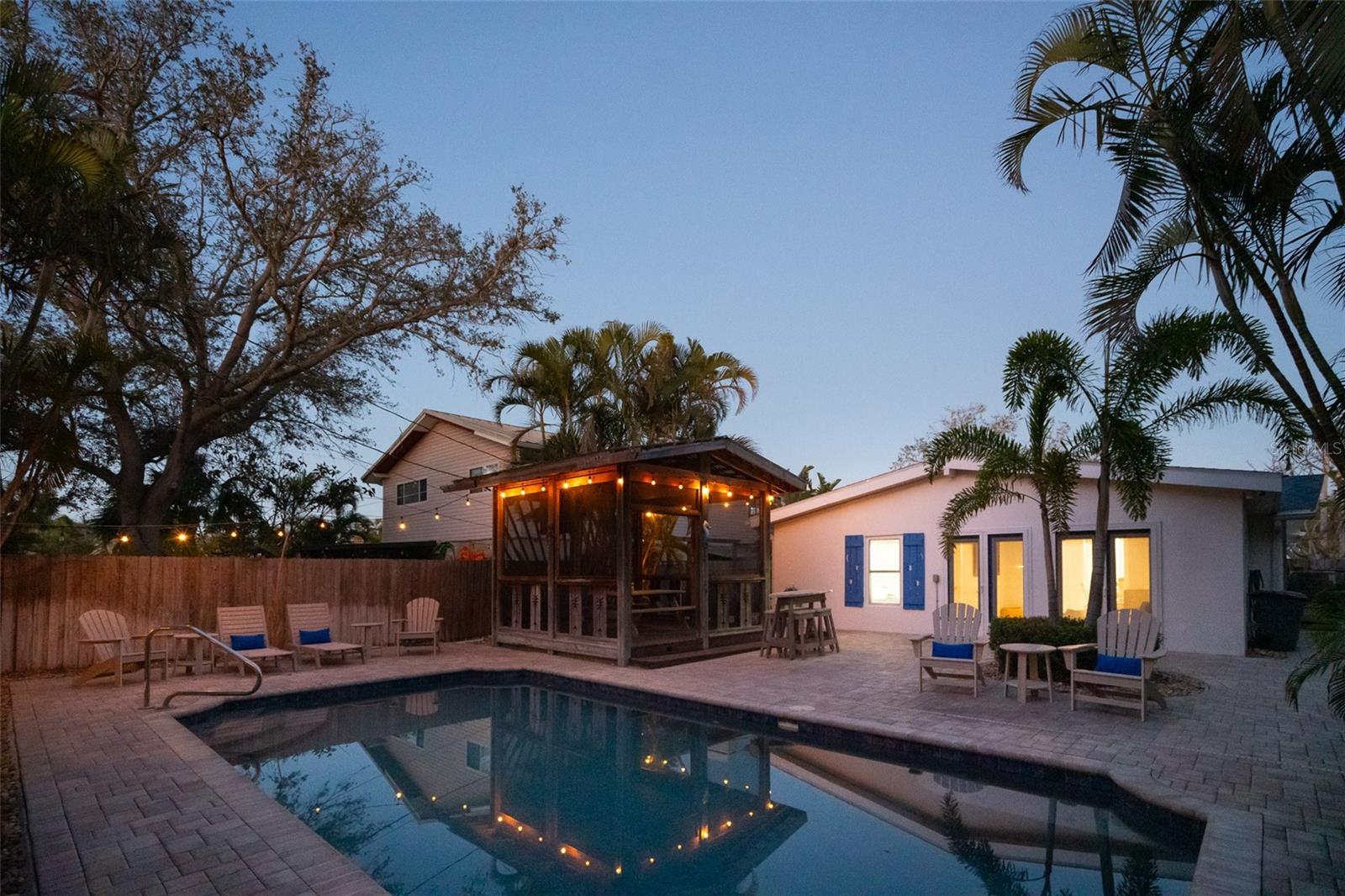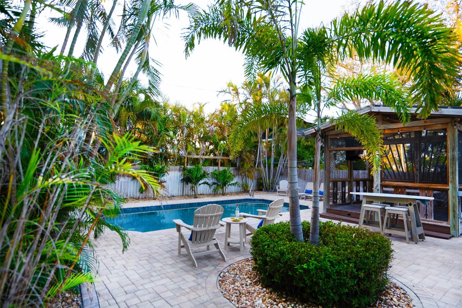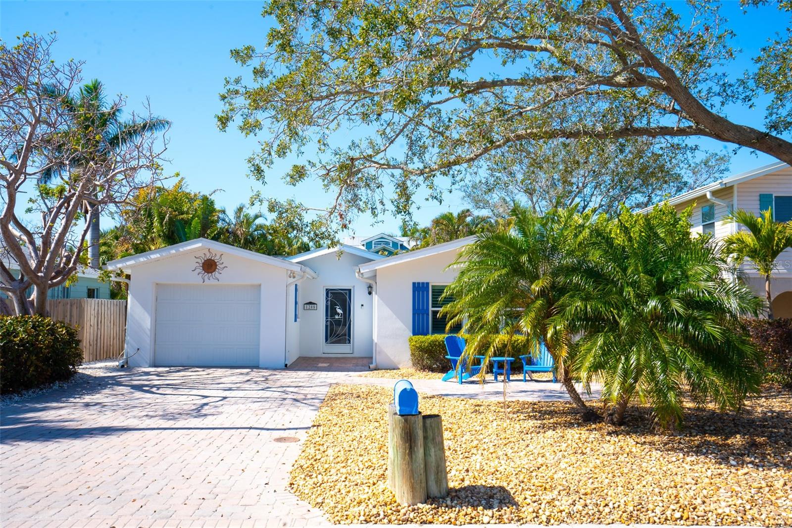 This beautifully renovated beach home is just a short walk to enjoy the sunset over the Gulf of Mexico on the beautiful sands of Indian Rocks Beach. This three bedroom, three bath home sits in a friendly community of beach homes nestled between the Gulf of Mexico and the Intracoastal Waterway. The fully pavered driveway, front patio and walkway welcome you to the front door which opens to an inviting foyer. The many windows and French doors allow significant natural light and take advantage of the backyard oasis with tropical landscaping, inviting pool, screened Gazebo and pavered lanai creating a peaceful, private and cozy space. The central focal point of the home is the Eat In Kitchen with Granite countertops a large island and is open to the light and bright Living room. Wood look Porcelain tiled floors throughout the home keep it cool and are easy to maintain. The French doors from the Living room are perfect for enjoying the coastal breeze or entertaining when you open all the doors to create an indoor/outdoor living space. The generously sized primary bedroom has an ensuite and walk in closet, it also has a mini split AC unit of its very own. Bedrooms two and three share the second full bath with dual sinks. Bath three has a large shower and laundry space boasting both a full size washer and full size dryer and includes a large granite folding table and is conveniently located off the Living room and close to the pool. The backyard is completely fenced and the low maintenance landscaping contributes to the beach house feel of the property. The pool was built in 2016, the roof replaced in 2021, appliances replaced in 2025.
