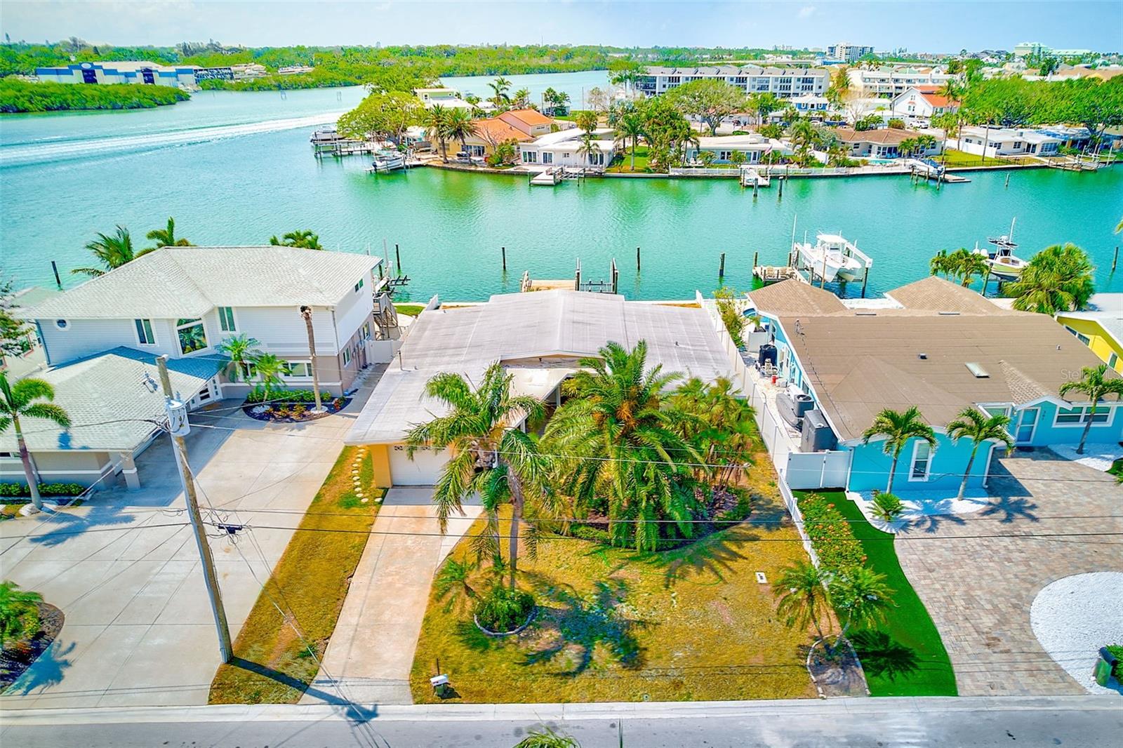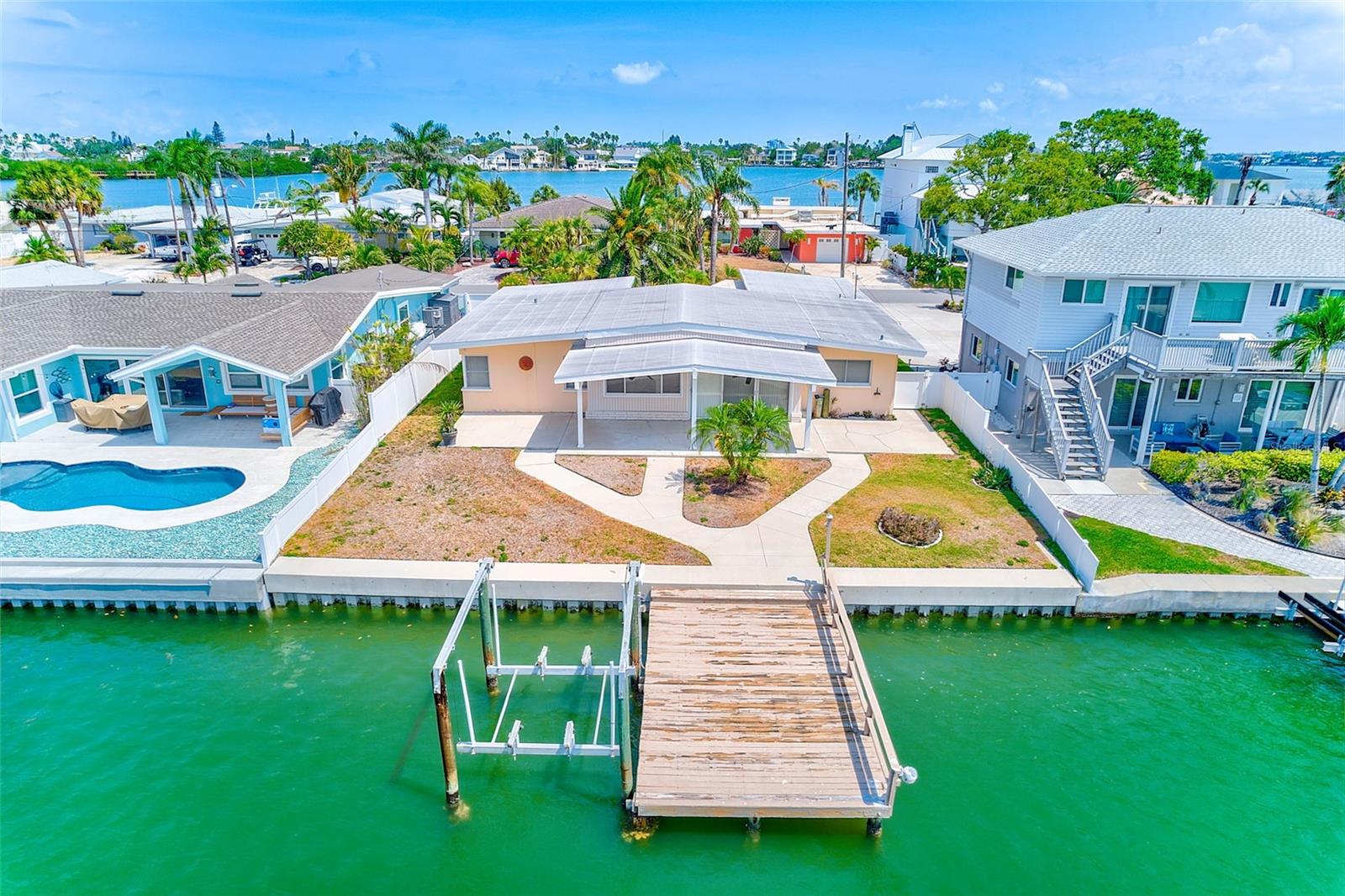 Rare Waterfront Opportunity in Indian Rocks Beach! A beautiful, large lot with southern exposure on a wide, deep canal, right at the turn from the intracoastal waterway, provides stunning views, light and easy boating access from this beautiful location. Just a few minutes walk to the most beautiful sands and waters of Indian Rocks Beach. The front and back yards are professionally landscaped and maintained with a reclaimed water sprinkler system. The existing home, 2 bedrooms/2 baths, built with solid block construction, sustained some damages during 2024 hurricane Helene, but has been professionally remediated—offering a rare chance to renovate or build your dream waterfront home from the ground up. The home has its original Terrazzo floors under the ceramic tiles. Newer Roof and Ac's units ( 3 split units). Large kitchen, Living room/office/den combo space. Inside laundry room. Another area for dining room and a family room. Large covered back porch is the perfect spot for watching the boats go by, dolphins play, manatees and more. Seawall was recently rebuilt. Deeded Dock and lift need some updates. This generous lot is ideally situated in most sought after beautiful residential street in Indian Rocks Beach. It is also an great investment opportunity as short term rentals are allowed. This a dream location for a full time residence on the most beautiful beach, a part time beach retreat or a great investment opportunity. Indian rocks Beach is known for its welcoming atmosphere, beautiful beach and waters, great restaurants and parks. Don’t miss this exceptional piece of paradise in one of Florida’s most desirable beach communities! Sold As Is. Caution walking round the poperty as floors has some broken ceramaic tiles/damage.