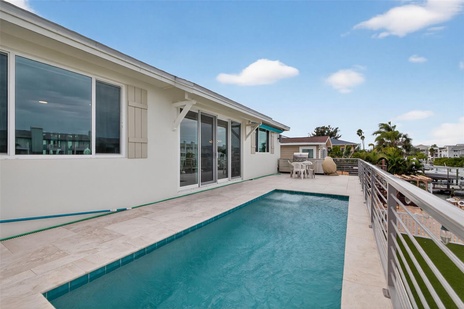 Modern Coastal Masterpiece | New 2024 Concrete Construction in Indian Rocks Beach Experience elevated coastal living in this custom, all poured-in-place concrete home built in 2024, ideally located in the heart of Indian Rocks Beach. Designed for durability, efficiency, and modern luxury, this 2-bedroom( with den), 2-bath elevated residence offers exceptional craftsmanship and thoughtful upgrades throughout. Soaring 9+ foot ceilings and 8-foot interior doors create a bright, open atmosphere, complemented by luxury vinyl plank flooring and hurricane impact-rated windows and doors for peace of mind. The chef’s kitchen features custom cabinetry, stainless steel natural gas appliances, and designer finishes—perfect for both entertaining and everyday living. The primary suite is a private retreat with custom built-in closets, dual vanities, and a spa-inspired curb-less shower. Every detail has been curated, from the high-end finishes to the seamless indoor-outdoor flow. Step outside to your own second-floor PebbleTec saltwater pool, complete with automation and heater, ideal for year-round enjoyment. This home is built for modern coastal living with 32 owned solar panels, a natural gas whole-house generator, brand new seawall, outside shower, natural gas tankless water heater, and four-car parking—a rare find at the beach. Constructed entirely of poured-in-place concrete and elevated for longevity, this home blends cutting-edge construction with timeless coastal style. Whether as a primary residence, second home, or investment (short-term rental friendly), this is a turn-key luxury property just minutes from the sugar-sand beaches of the Gulf. This home is priced below lot plus construction cost, this one will not last! Schedule your private showing today and experience Indian Rocks Beach living at its finest.