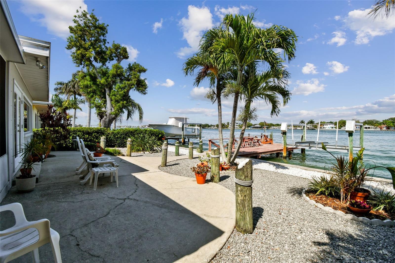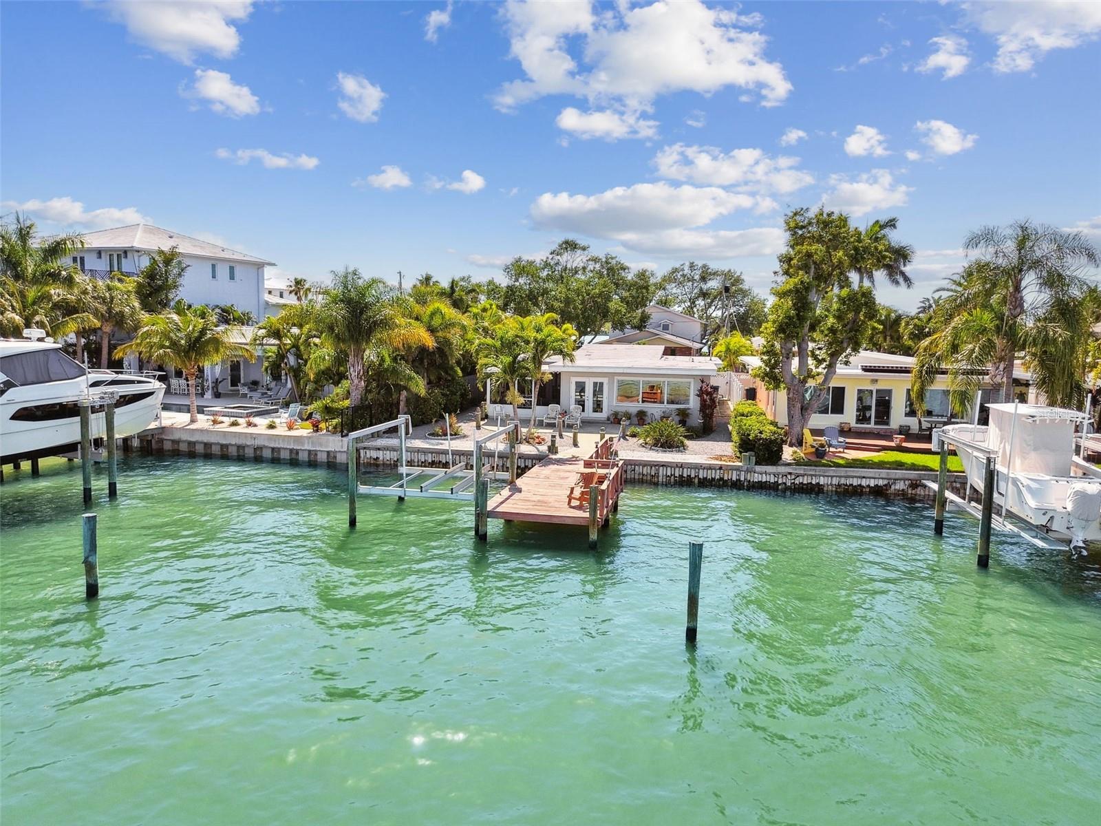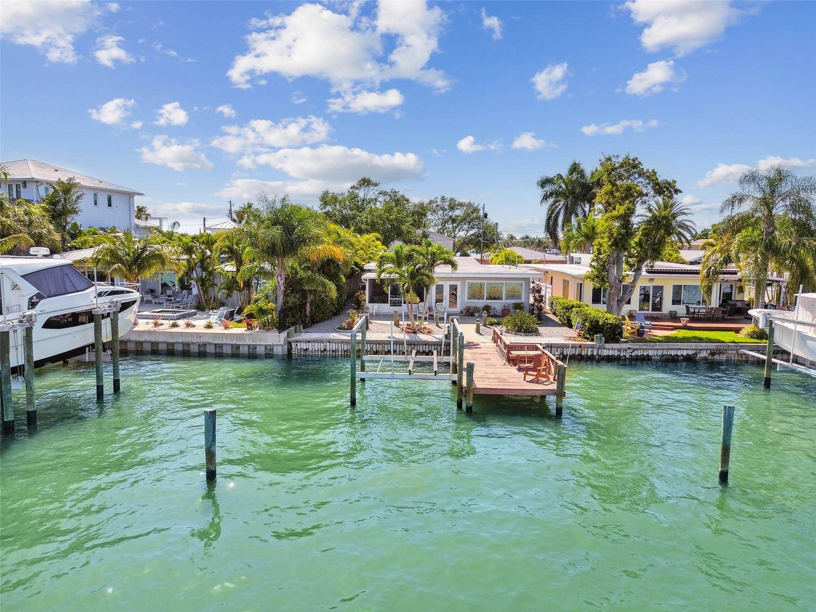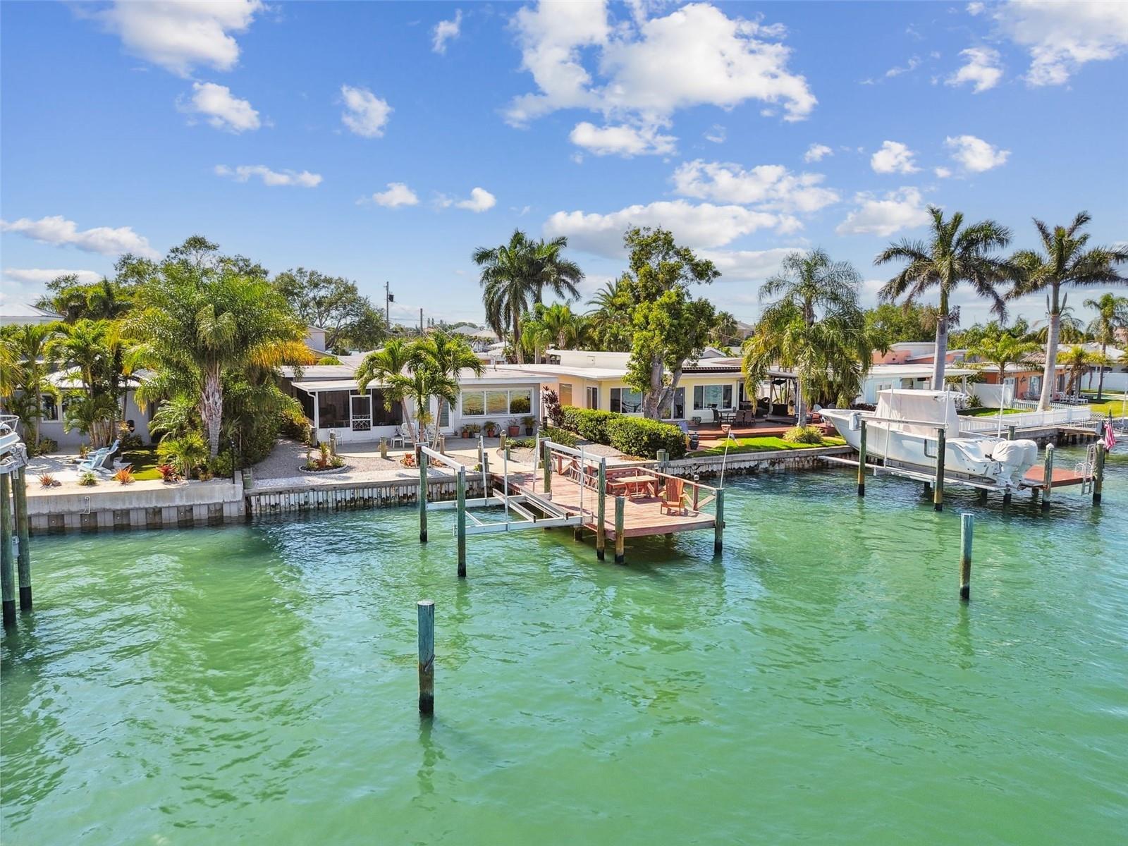 Amazing open and direct Intracoastal waterfront view from the front door to the back. This home offers an open plan with views of the water from the kitchen, living, and dining areas, plus the Master Bedoom. With a covered screen porch and single-car garage, it is easy to add two or more sleeping rooms to this 2-bedroom house. The backyard has ample room for a pool and currently offers a large patio, from where to see dolphins, passing boats, and open water. With a steel seawall, a large dock, and an updated 10k boat lift with a remote, this home offers the Florida lifestyle everyone desires. Recent updates include, Water Softener-2022, AC 2022, and Roof 2023. The separate laundry room off the garage can easily be another bathroom. Whether your goal is to find the ideal lot for future construction, have a great vacation or short-term rental property, or enjoy the Florida lifestyle, this home is ideal. Walking distance to the beach, Indian Rocks Beach offers great beach parks, dog parks, and a friendly community that offers activities for everyone to enjoy. Great entertainment, dining, shopping, and more are just minutes away by foot, golf cart, or r. Indian Rocks Beach is in the heart of Tampa Bays best beaches and offers easy access to many of Pinellas County's finest museum and arts districts, plus the Bay area's many professional sports venues and world renown theme parks. Tampa International Airport and PIE are also easily traveled to and fro. If beach living is on your list, come check out this great Florida home.
