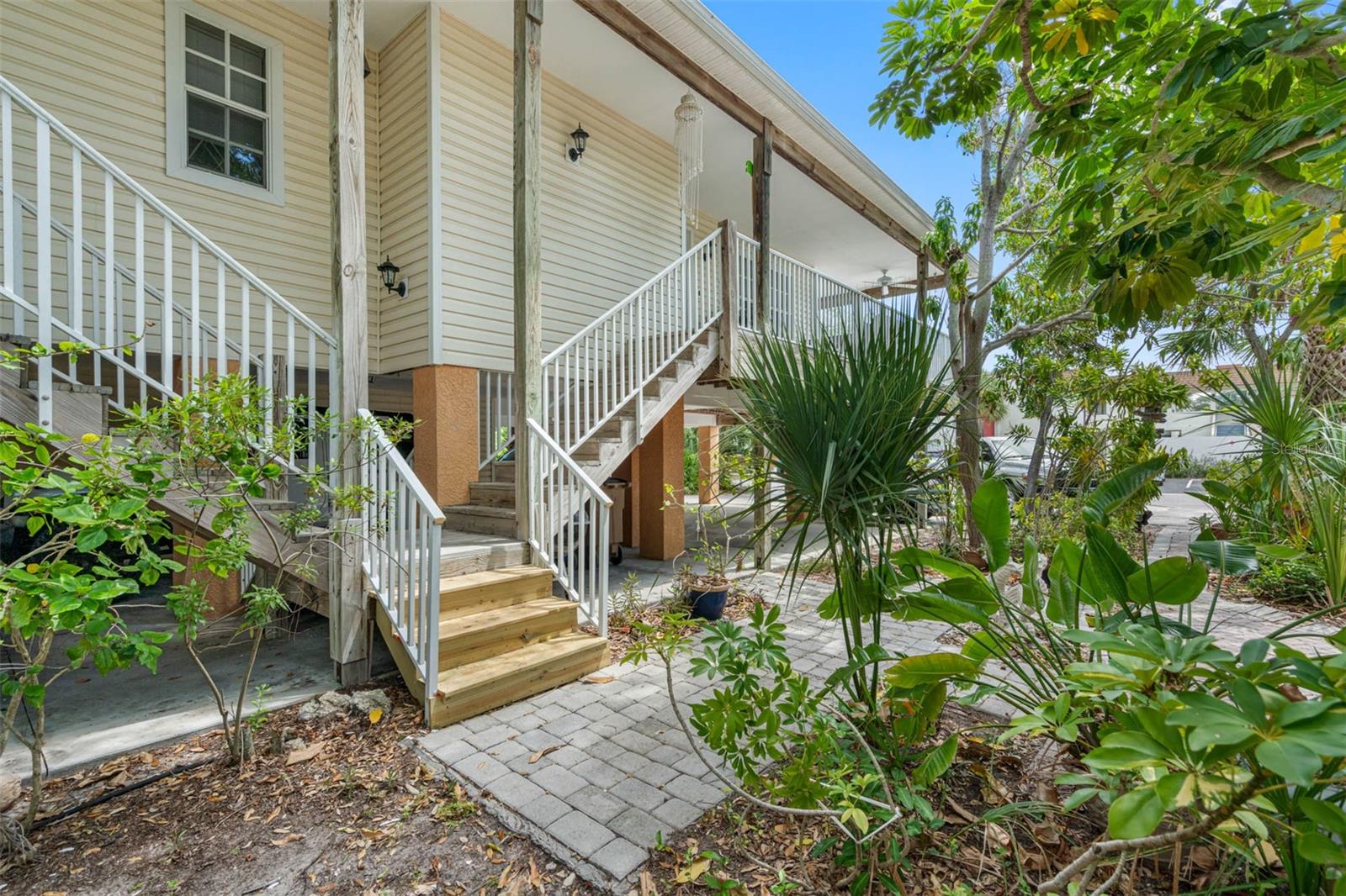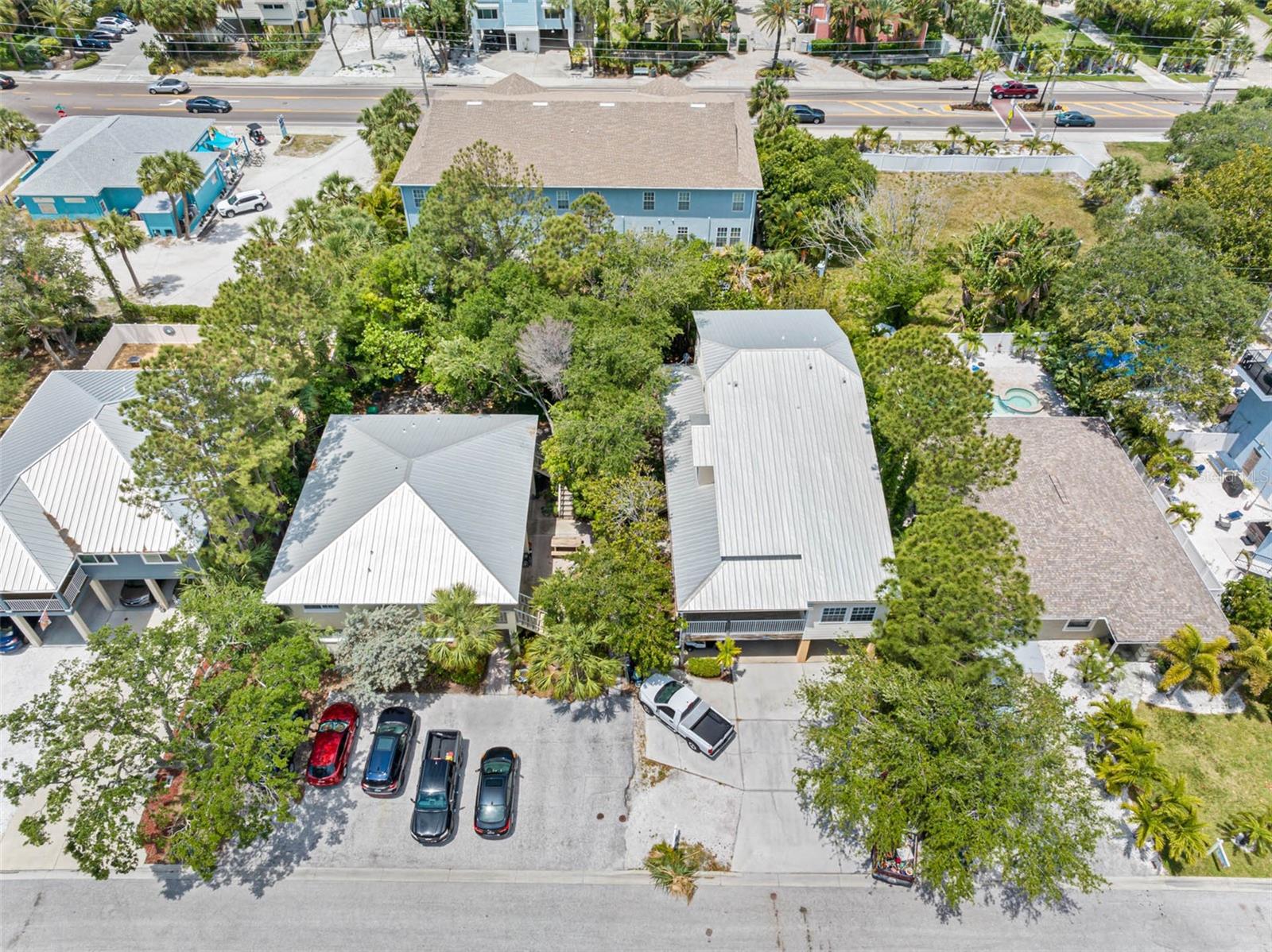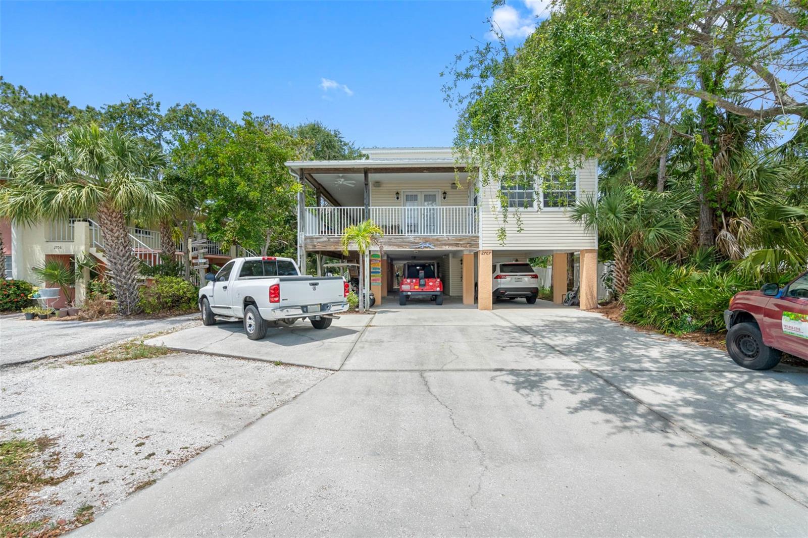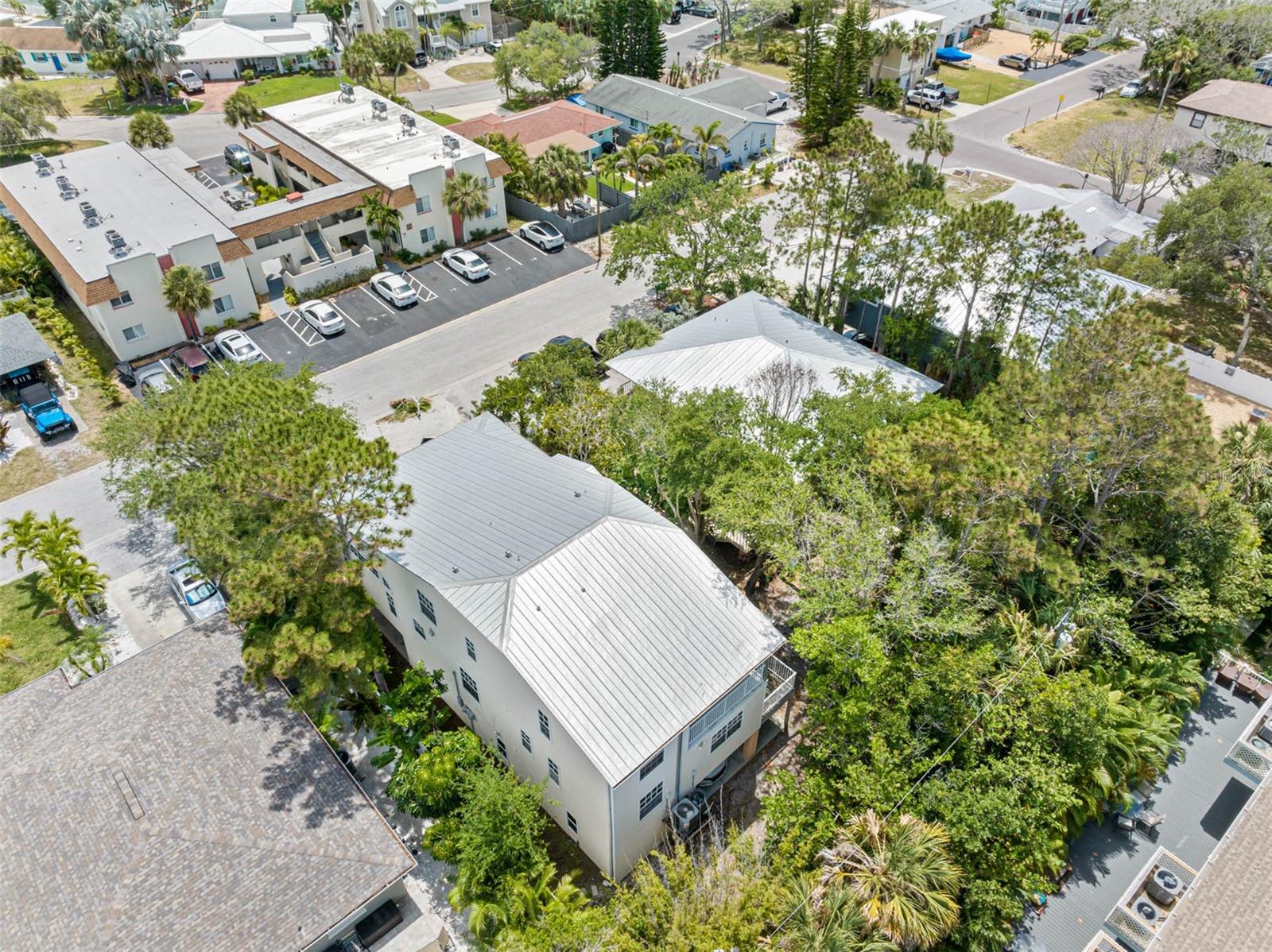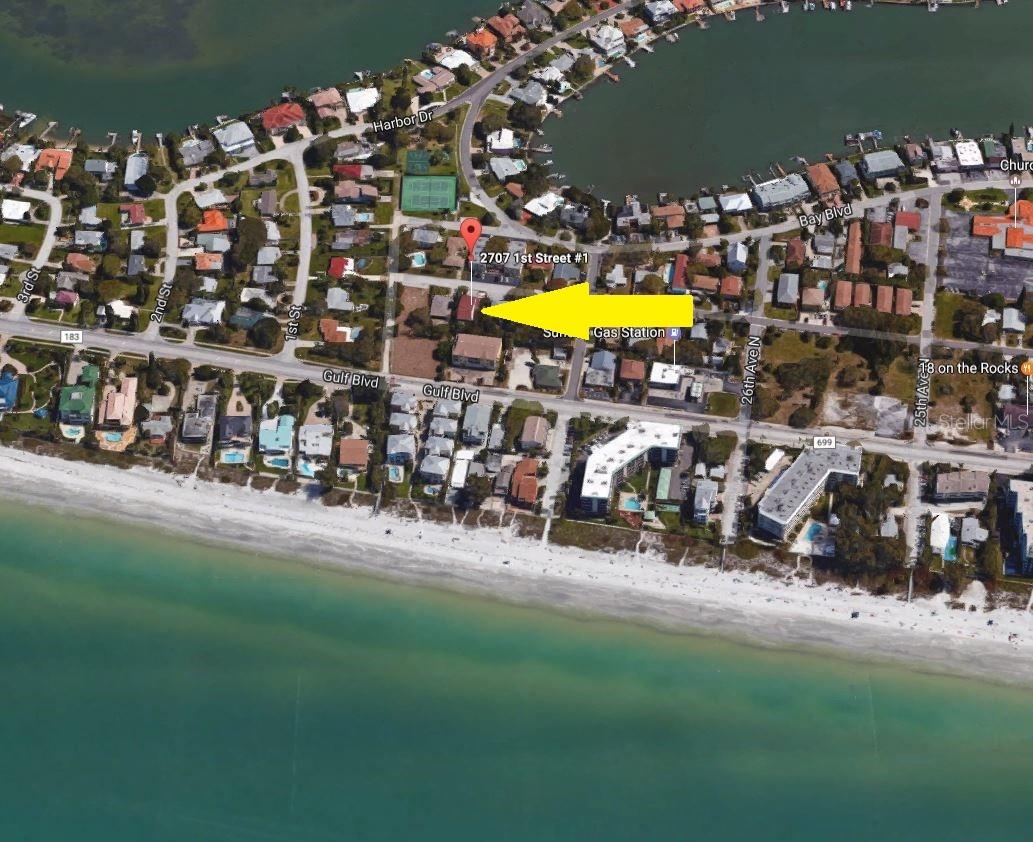 TROPICAL KEY WEST STYLE HOME WITH SPACIOUS MOTHER IN LAW APT- INDIAN ROCKS BEACH! ONLY 2 BLOCKS TO THE BEACH! UNIQUE OPPORTUNITY to live in a breathtaking home with an extra apt/mother-in-law home. Lovingly built and occupied by IRB's past Mayor, the main house (#1/east side) is almost 2000 sq ft with 3 bedrooms + enclosed office, 2.5 bathrooms, 3 car garage and 4 under bldg parking. Stunning great room with high vaulted ceiling, custom Mexican Saltillo style tile floors, built-in shelving and lots of large windows, French doors accessing private wrap around porch. Private office/den located right off Great room with light & bright atmosphere with more windows and French pocket doors opening to the Great room. Apt Home #2 (west side) is generous 2 bedrooms, 2 bathrooms about 900 sq ft. Featuring a great room plan plus a private porch overlooking the tropical garden. UPDATES: new metal roof 2017, some feature newer hot water heater, new AC, new fridge, dishwasher. GARAGE / STORAGE / WORKSHOP AREA is almost 2000 sq ft. About 800 sq ft of covered porches. BOTH homes have central heat & air, private covered porches, extra guest parking outside, inside laundry closets with full size washer dryer in each side. See attached list of upgrades & FAQs. WEST side of property has room for pool, hot tub, gazebo/tiki hut - check with City of IRB for permitting requirements. ***SELLER FINANCING OPTIONS***Highly desirable location, newer construction, elevated building, over 20 years steady rental income! Currently rented to long term, very nice tenants at below market rent due to being listed for sale. Live in one and rent out other! SHORT TERM RENTALS ALLOWED. ADJACENT south quadplex property for sale as well. Great chance to have a fantastic vacation resort! Or knock down and build new. Unlimited opportunities and income for the right beach loving owner! Located within walking distance to local restaurants, attractions including the IRB Nature Preserve, many parks with tennis/pickleball, basketball, baseball field, skateboard park, playground. EASY, convenient access to the beautiful Gulf beaches via 27th Ave beach access, perfectly situated for both leisure and ease of commuting. BRING YOUR BOAT - community boat ramp! The beach community offers waterfront activities, dining, and shopping, making it an ideal location. IRB is golf cart friendly. Many options with this unique property as primary residence with mother in law apt, 2nd home getaway with short term rentals (STR) - NO minimum rental in IRB. AIRDNA estimates $240K gross rental as a STR. Well maintained, new owners will enjoy a worry-free lifestyle! VERY unique building design and opportunity! ***DO NOT DISTURB TENANTS***