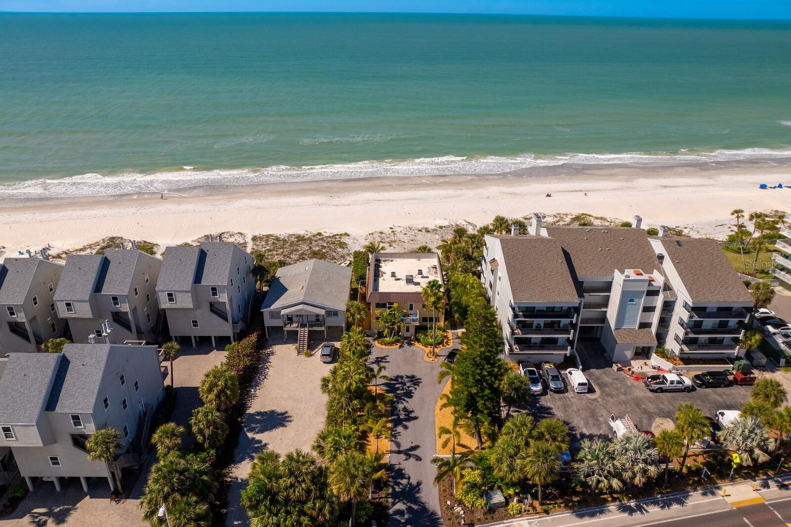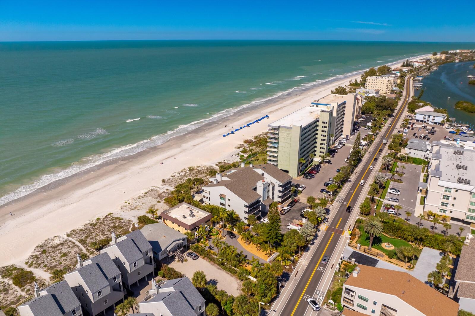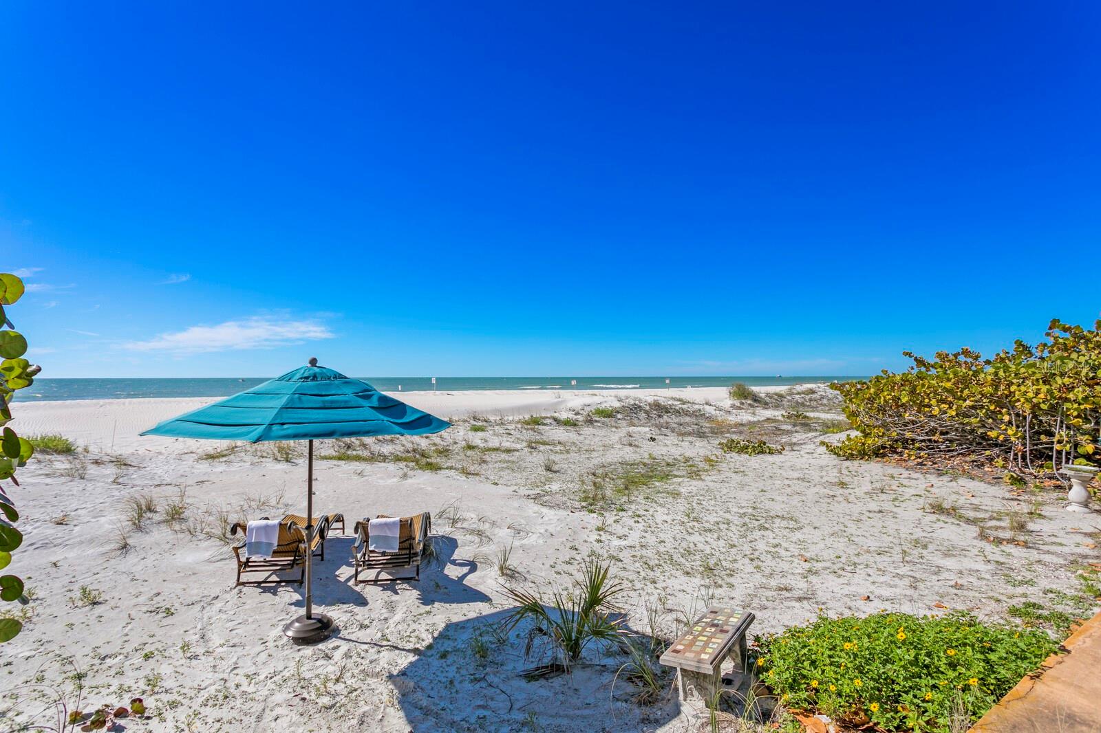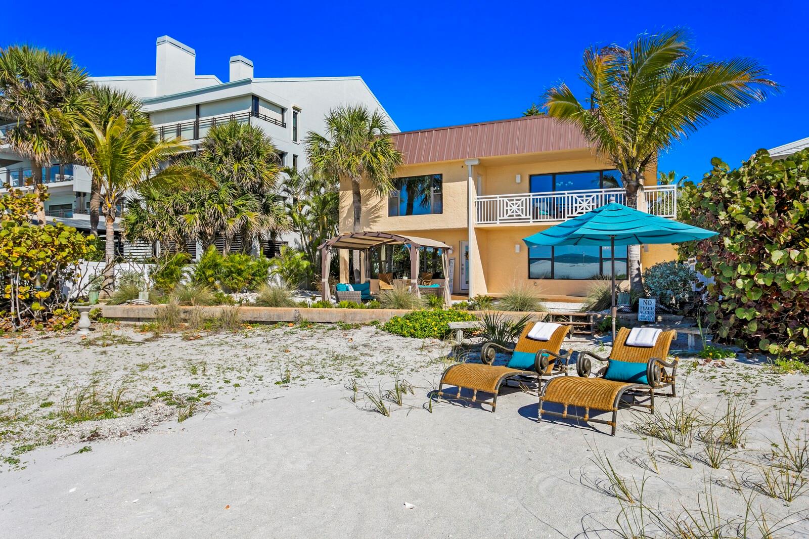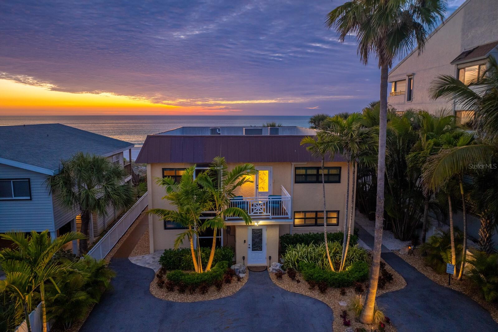 Nestled along the pristine shores of the Gulf, this captivating beach house seamlessly blends coastal elegance with relaxed charm, all while offering remarkable versatility and potential. The priceless views and location offer an appreciation of the beauty of nature. Arrive at your private beachside haven and enter through a custom remote gate with a separate pedestrian entrance. Inside, discover an open-concept design bathed in natural light from the NEW custom windows and doors, inviting the awe-inspiring beauty of sunsets, salty breezes, and sunrises into your living space. The two kitchens, both overlooking the beach, showcase modern appliances and marble countertops, creating an ideal setting for entertaining. Upstairs, a tranquil sanctuary awaits, with two private balconies offering sweeping views of the Gulf of Mexico and partial Intracoastal vistas. Direct access to sandy shores makes this beach house a haven for those seeking the quintessence of coastal living—where every moment is a celebration of sun, surf, serenity, and spectacular sunsets. Cherished by a single family for decades, this residence has undergone meticulous updates and upgrades both inside and out, along with new landscaping featuring coastal tropical Florida plants and palms. Set on a generously large lot of .39 acres with 63ft of beach frontage, this home, with its solid concrete construction provides durability and opportunity. The rare ability to walk directly out to the powdery sands of the beach is a sought-after benefit of living the coastal life. This charming home offers panoramic ocean views and an immediate connection to the tranquil Gulf waters. This beach retreat is a rare find, offering the flexibility to serve as your primary residence, a duplex, or as a canvas for building a new home directly on the Gulf. Private entrances with an elevator or stairs welcome you to the second level, with the upstairs unit doubling as a spacious in-law suite or separate rental. With an open-concept design, five bedrooms, and four baths, the first floor features a 2/2 floor plan, while the second floor offers a 3/2 design, both with large living areas, private entrances, kitchens, and interior utility rooms. Recent upgrades include all newer custom windows and doors, and newer balcony railings, enhancing the property's allure. Two AC units and the roof were replaced in 2019 and 2018, along with the installation of remote shades on the oversized west facing windows, Plantation shutters, and crown molding. Whether for investment, development, or family living, this property is a one-of-a-kind gem in Indian Shores, boasting two full condo-like floors, each with its distinct charm. Whether you choose to develop, convert it to rentals, use the second floor as an in-law suite, or make it all your own, this beach house epitomizes coastal living, where every moment is a celebration of sun, surf, and serenity, coupled with the added allure of potential and versatility. Conveniently located near restaurants, medical facilities, esteemed schools, interstates, and two international airports, this private seaside haven awaits your arrival!