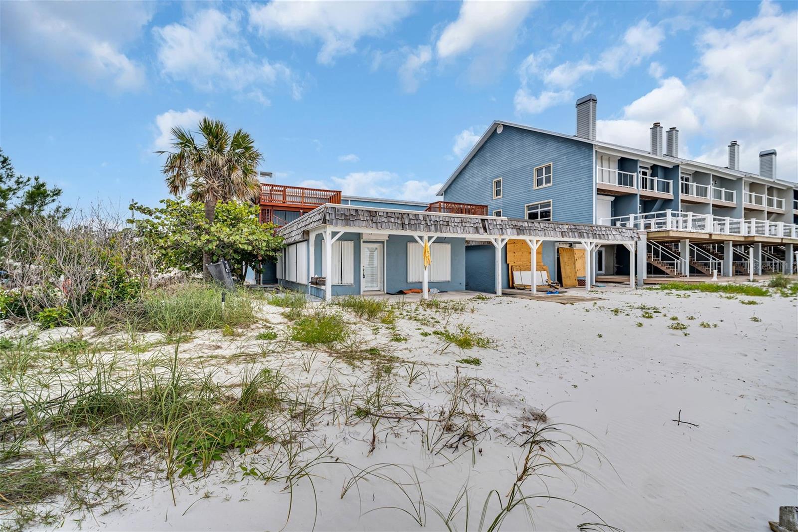 A truly unique, one-of-a-kind, beachfront opportunity, one of only 4-units. This is a must-see 2 bedroom, 2 full bath inside plus a full bath to be used anexed to the garage for showers after a beach day, 1 car garage townhome with breathtaking views, modern updates, a prime location, and an affordable HOA that you can customize and truly make your own. This property was damaged in the past storms but has been mitigated and is just waiting for you to put your personal touches on it to make it your own! This property will meet all of your beach-going wants and needs. Upon arrival, at the front of the property, the property for sale is located to the right with the front-facing arched balcony. Walking down the pathway you’ll enter the property from the two double doors. The main floor is light and bright with an open concept kitchen, dining room, and living room combination. There is an oversized wood-burning fireplace in the living room that also extends to the primary bedroom upstairs. Off the dining room is a set of sliders leading to your own gated private multi-use space along the side of the property which allows for outdoor grilling, gardening and/or storage of your favorite beach toys, your choice! Heading upstairs you will find the primary bedroom facing west with a stunning open ocean view. Walking through the sliders to an open-air covered balcony, with seating and additional stairs leading up to a bonus third-story observation and sunning deck. You have a view like no other! Heading back inside to the primary bedroom which boasts a wood-burning fireplace, updated flooring, and a walk-in closet, this spacious bedroom will meet all of your beachfront living dreams. The primary ensuite with updated oversized vanity, quartz countertops, standup shower, and separate water closet provides all the privacy you will ever need. Across the hall is the second bedroom with an oversized space and plenty of storage including two separate closets. The guest bathroom is neighboring with a updated vanity and a bathtub. Off the garage is an additional bathroom - great for those beach days when you want to rinse off before you head inside. Tons of parking! Leaving the property to head out to the beach you walk down the hallway passing the laundry room. The 4-units share this laundry room, although if a private laundry room is desired, there is plenty of storage space in the garage to put in your own unit. Just steps from the sandy beach of Indian Shores there is also a communal picnic table and a small pathway to open water. With the added bonus - there are NO rental restrictions on this property! You may enjoy it as you please. Welcome to the beachfront Florida lifestyle of your dreams!
