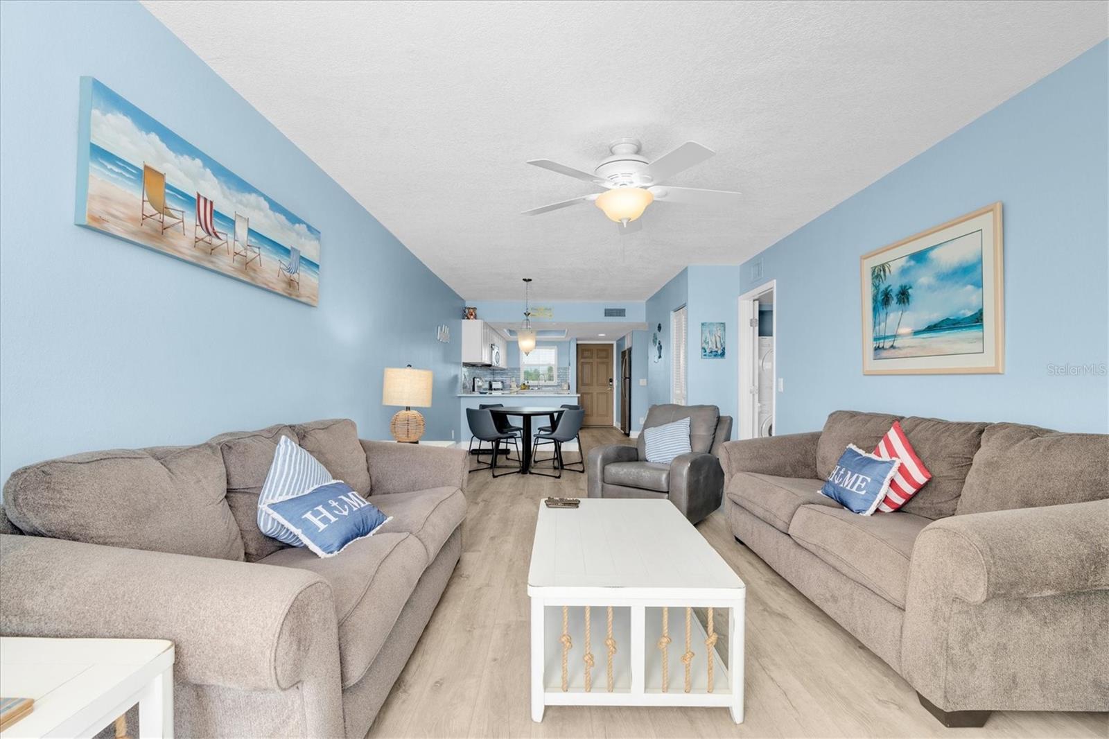 Enjoy direct beachfront living at 18650 Gulf Blvd #203 in Indian Shores. This updated and fully furnished 2-bedroom, 2-bath condominium showcases MILLION DOLLAR VIEWS of the Gulf and beach from your private covered balcony! FULLY FUNDED and there are NO OUTSTANDING ASSOCIATION ASSESSMENTS FOR 2025. Inside, you'll find a modern kitchen with quartz countertops, a tiled backsplash, and a spacious breakfast bar. Additional highlights include luxury vinyl tile flooring, hurricane-rated windows and sliding glass doors (2023), and a new A/C system (2023)—all contributing to a comfortable, coastal design. The unit features an in-unit stackable washer and dryer (2023), with additional laundry facilities available on the first floor. Gulf Shores Condominiums allows 30-day minimum rentals, making it ideal for seasonal use or investment. Community amenities include a pool, clubhouse, guest parking, elevators, stairwells, and private storage. Monthly condo fees of $765 cover water, sewer, trash, cable, Wi-Fi, exterior insurance, and maintenance. Reserved parking space (#212) and dedicated storage unit (#203) are included. Located directly on the beach and across from the Intracoastal Waterway and Pinellas County boat ramp, with easy access to Tampa International Airport, St. Pete–Clearwater Airport, dining, shopping, medical facilities, and local attractions.