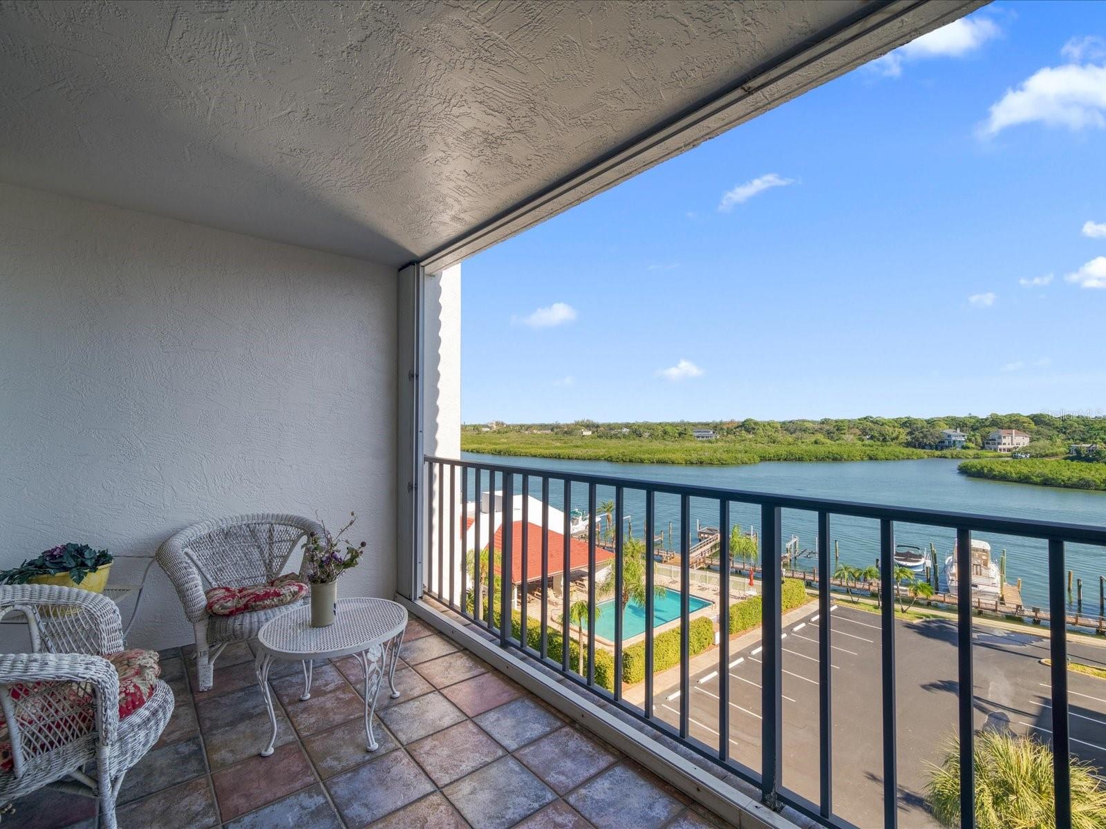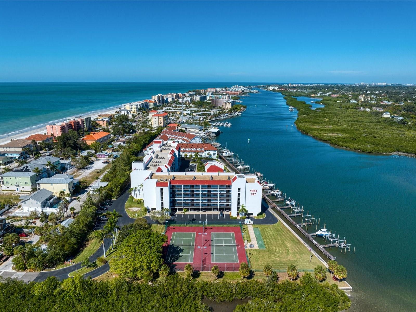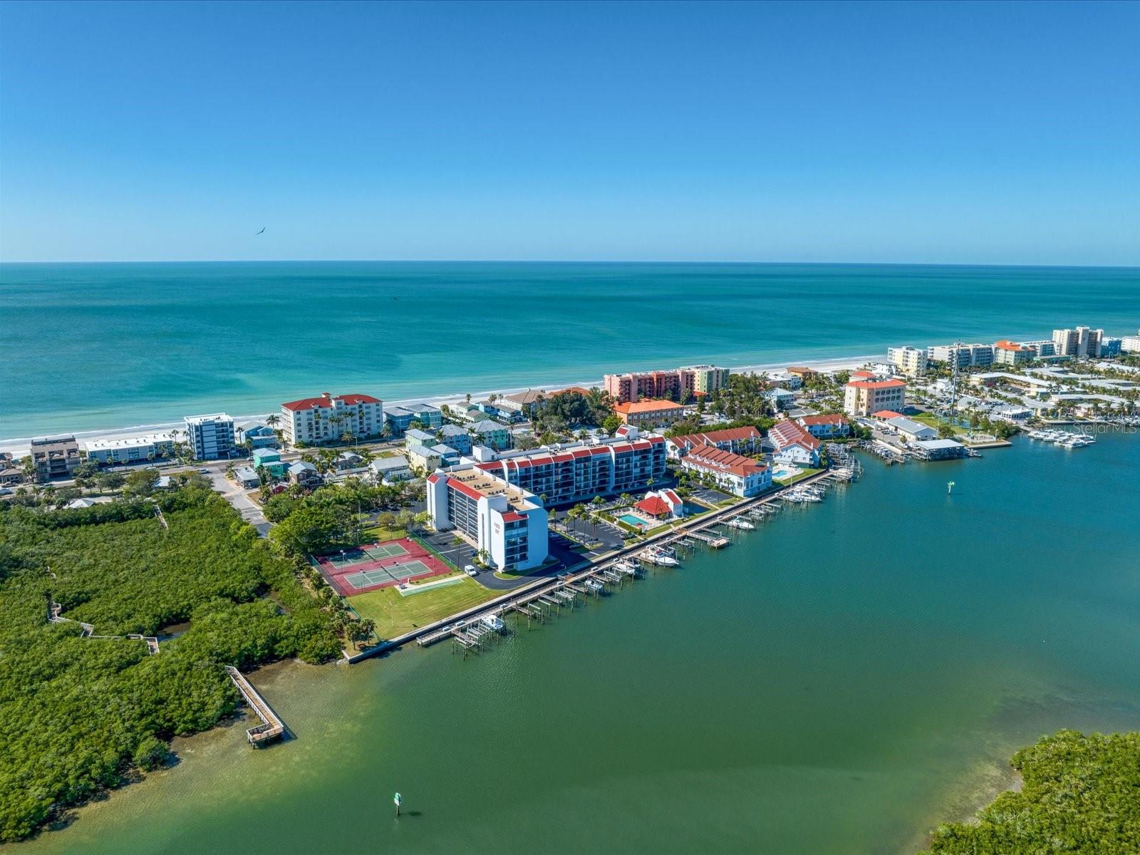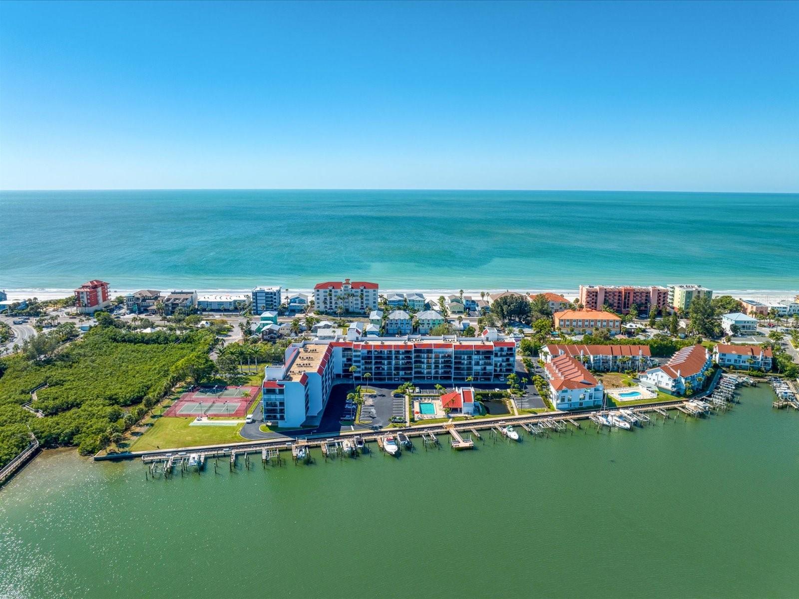 Discover the pinnacle of coastal living in this lovely penthouse condo overlooking the enchanting Narrows of Indian Shores. Nestled between the Gulf and the Intracoastal, just 2 blocks from the beach and adjacent to a serene nature preserve, this location offers tranquility and convenience. The secure lobby guides you to the 6th floor, where this unit awaits with awe-inspiring views. The beautifully renovated kitchen, equipped with new appliances (2021), boasts white shaker style soft-close cabinets, quartz counters, a pantry, and a pass-through to the spacious living room/dining room combo. Custom built-ins in the dining room provide a perfect display space, while the living room is bathed in natural light with sliders opening to a large, covered balcony offering breathtaking water and pool views. The primary bedroom is a retreat with ample closet space featuring a California closet system, double sinks, and a walk-in shower. The second bedroom is equally spacious and shares a hall bath with a tub/shower combo. Hurricane shutters and panels offer peace of mind, complemented by plantation shutters throughout, a brand-new AC (2023), water softener/filtration system, in-unit laundry, and a storage closet just across the hall. Rentals are permitted but are limited to a minimum of 3 months, twice a year. Enjoy the community's amenities, including a heated pool, fishing pier, tennis courts, shuffleboard, and a deeded boat slip for easy access to dockside restaurants. This is an unparalleled opportunity to indulge in coastal luxury with every convenience at your fingertips.