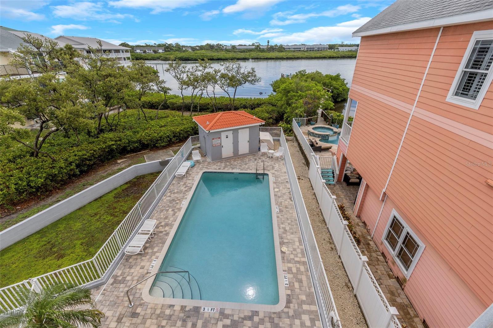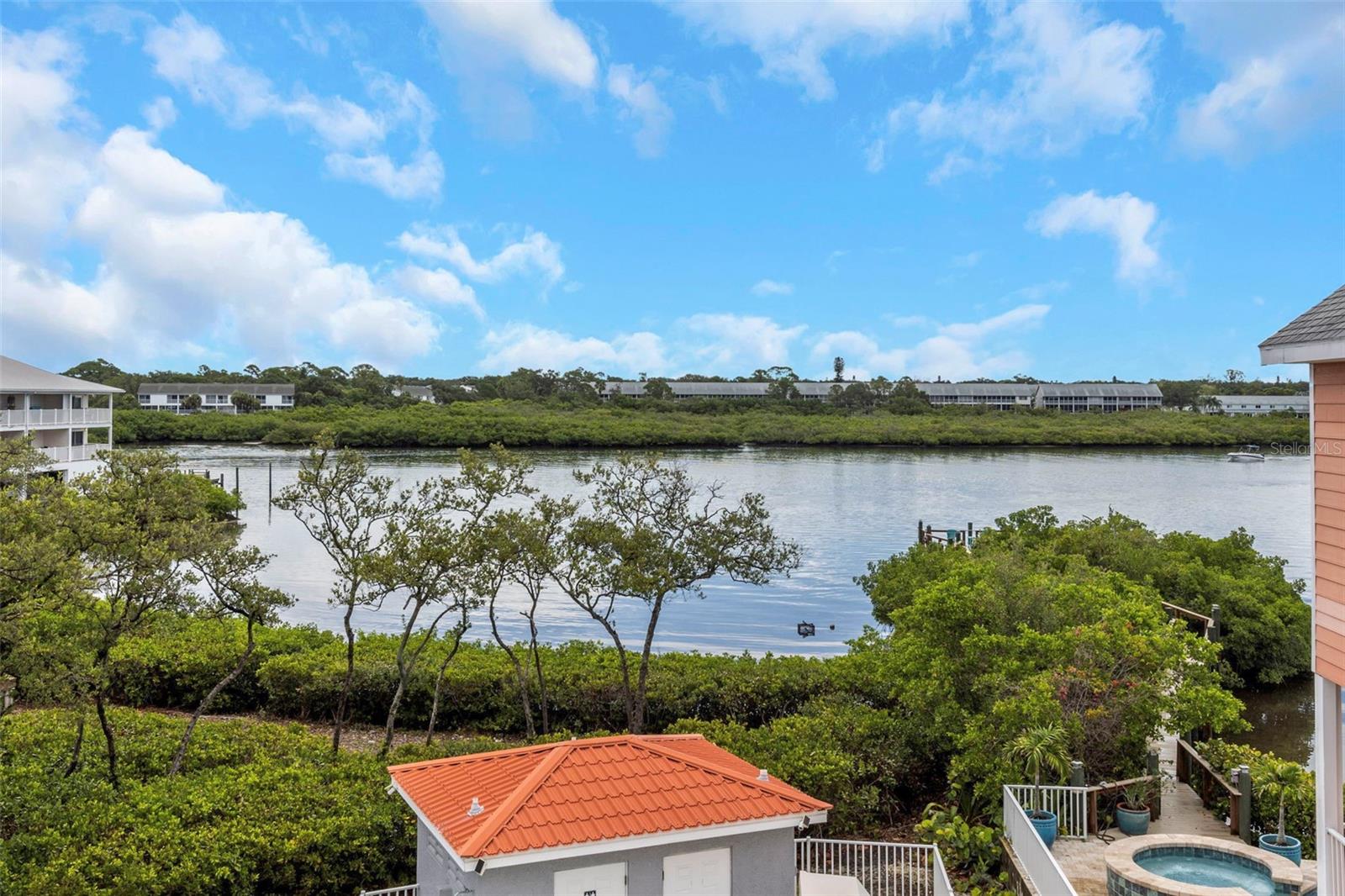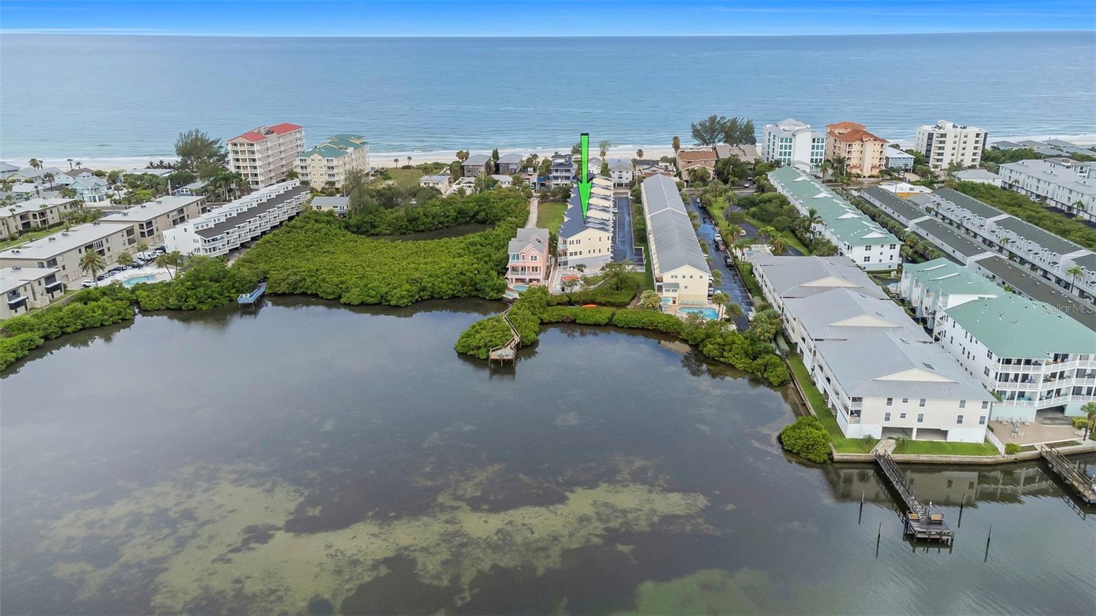 TRULY THE BEST OF ALL WORLDS! Experience the ultimate coastal lifestyle in this stunning waterfront home that offers the perfect blend of luxury and convenience. Boasting 3 bedrooms and 3 full baths, with a spacious 3-car garage, this residence spans 1850 sq. ft. above flood level. Ideal for beach house living without worry. Relax and entertain in style with a heated pool. Enjoy a low HOA fee of $465 per month, which covers cable, internet, water, sewer, trash, pool, and ground maintenance. Delight in direct access to the community pool from your screened porch, complete with a private hot tub and serene mangrove views. The 198th St. beach access and crosswalk are just across the street. Freshly painted in calming coastal hues, every room and both decks offer picturesque views of the Intracoastal waterway, where you can watch boats sail by. Custom plantation shutters adorn each window, enhancing the tranquil ambiance. The gourmet kitchen features high-end LG appliances including a double oven, complemented by a large granite snack bar. The tropical deck off the main floor is the perfect place for relaxing on balmy evenings. Upstairs, the primary bedroom suite includes an ensuite bath, expansive closet, and private deck. Your personal sanctuary with stunning views of both the Intracoastal and the Gulf of Mexico. Brazilian cherry hardwood floors grace the stairs and upper level, adding warmth and elegance. The second bedroom also boasts an ensuite bath and ample closet space, while the convenience of a large washer and dryer upstairs makes laundry a breeze. The main living level hosts a versatile third bedroom with a built-in Murphy bed and custom bookcases adjacent to another full bath. Recent upgrades include a one-year-new roof and HVAC system. With the flexibility a pet-friendly policy, this home is perfect for those seeking a blend of luxury, comfort, and coastal charm. Don't miss your chance to own this exceptional waterfront retreat. Schedule your tour today!