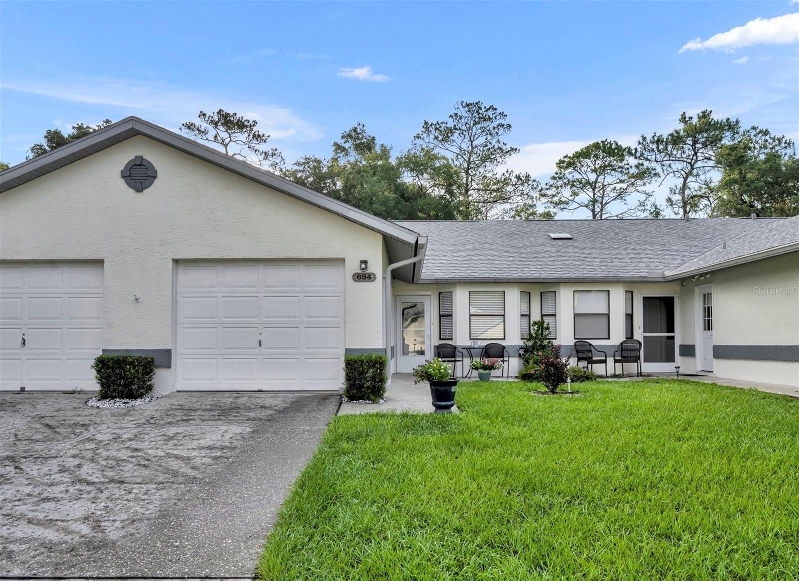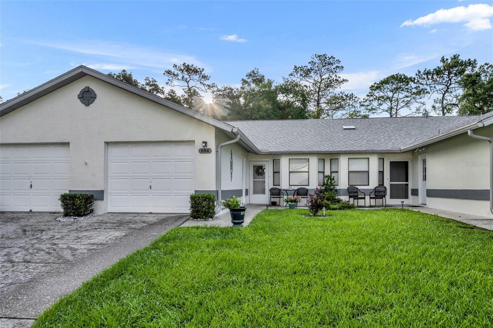 Your perfect retreat, welcome to 645 Whispering Pines Blvd, where comfort meets convenience in this lovingly maintained 2-bedroom, 2-bathroom villa. Beautifully manicured, you step up to the front, through the screened porch and open the door. Inside you will find a well designed floor plan, with kitchen overlooking the spacious living area, master suite with step in shower and wonderfully sized walk in closet and a 2nd bedroom-perfect for home office or wonderful guest visits. Inside you will also find the natural light coming in from the skylight. Now be ready for true peace-step onto your glass windowed back porch! Full tranquility as you have your morning coffee and look over the green and flowered landscape. In addition, this sweet home comes with a one car garage-perfect to keep that car cooler on the summer Florida days. As an added bonus, Whispering Pines Villas has not only a community pool, but is just steps away from Whispering Pines Park - nature at it's finest. Did you know that the low $125 monthly HOA fee covers ground keeping, gutter cleaning, pest control, outdoor lighting, community pool maintenance and RV/boat storage? Plus, the City of Inverness manages garbage, yard waste, and recycling! This is it, the one you were waiting for. It is your turn to kick back, relax, and enjoy the peaceful living of Whispering Pines. **Roof 2021 AC 2020***