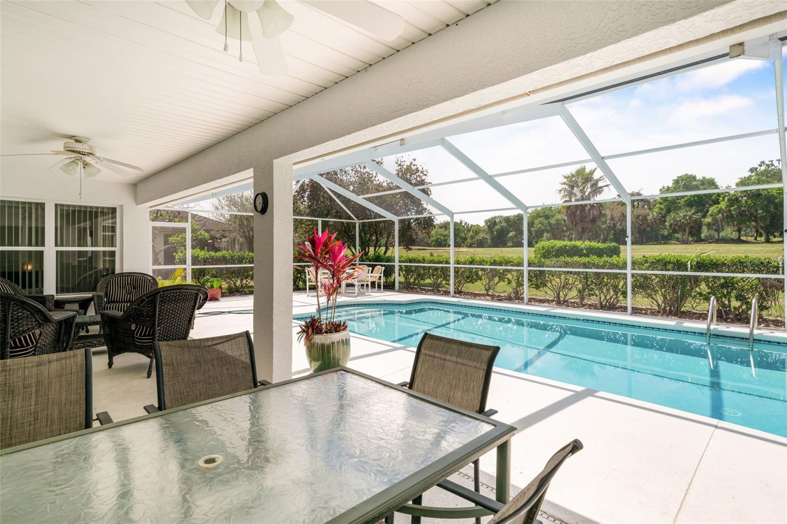 This villa offers 4 bedrooms, 2 bathrooms, pool, and a large pool deck for outdoor times! The master and the largest guest room, feature French doors opening up to the pool & lanai. The 3 bedrooms share a hall bath with access to the pool. This bathroom has a combo tub/shower. Large open kitchen with breakfast bar, open to the living room. Barstools, plenty of storage, pantry. Living room has access to the pool area through the glass sliding doors. Solar & electric (new in December 2024) heated pool and a large deck fitted out with a seating area and dining area, you will find yourself enjoying the Sandhill cranes, and wonderful sunset! Outdoor shower is convenient! Washer & dryer are in the garage, and there is an extra big storage closet as well. Storage racks stay. Roof replaced in June 2022, AC is replace is September 2023. New electric pool heater December 2024. This home is in a rental program; furniture stays for the convenience of the buyers. If not needed, it will be removed. NO HOA, NO CDD, NO RESTRICTIONS. Shed, fences, are allowed. Come see us!