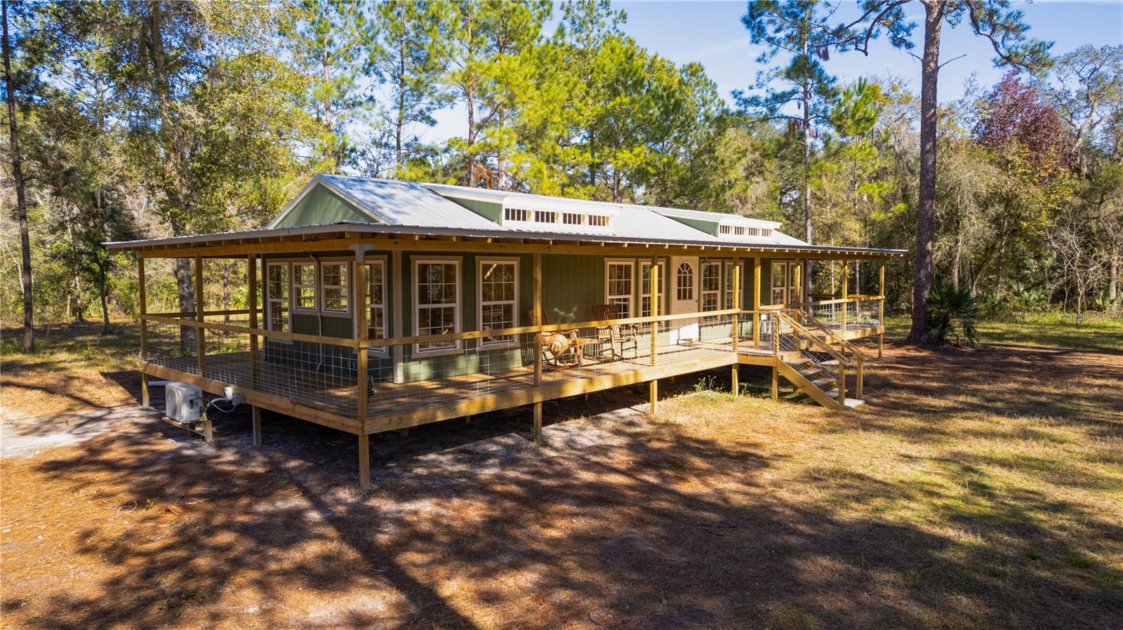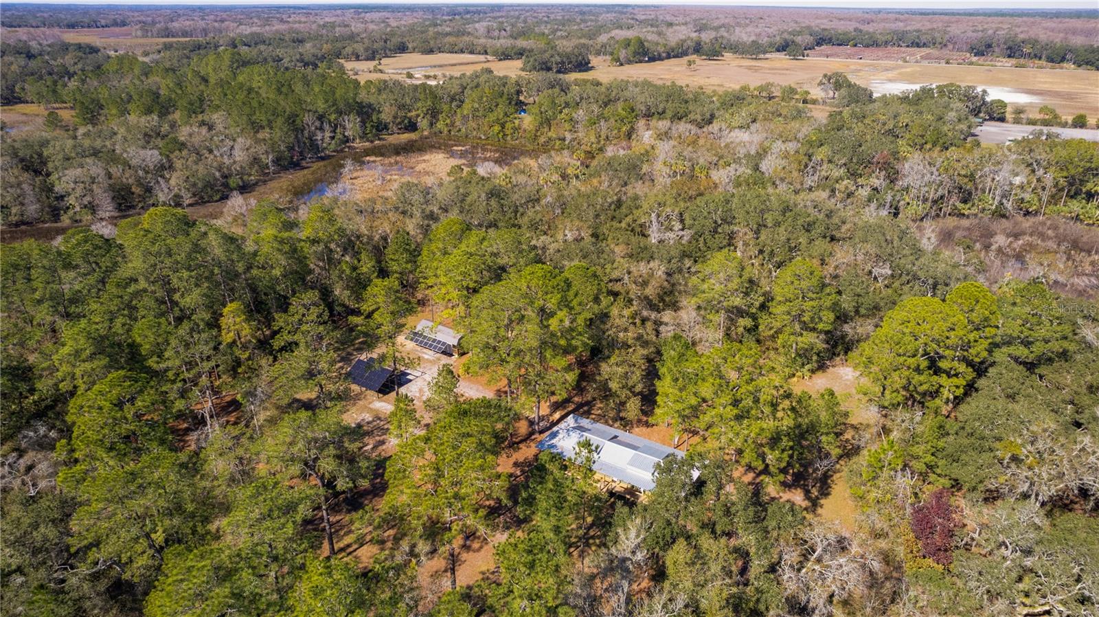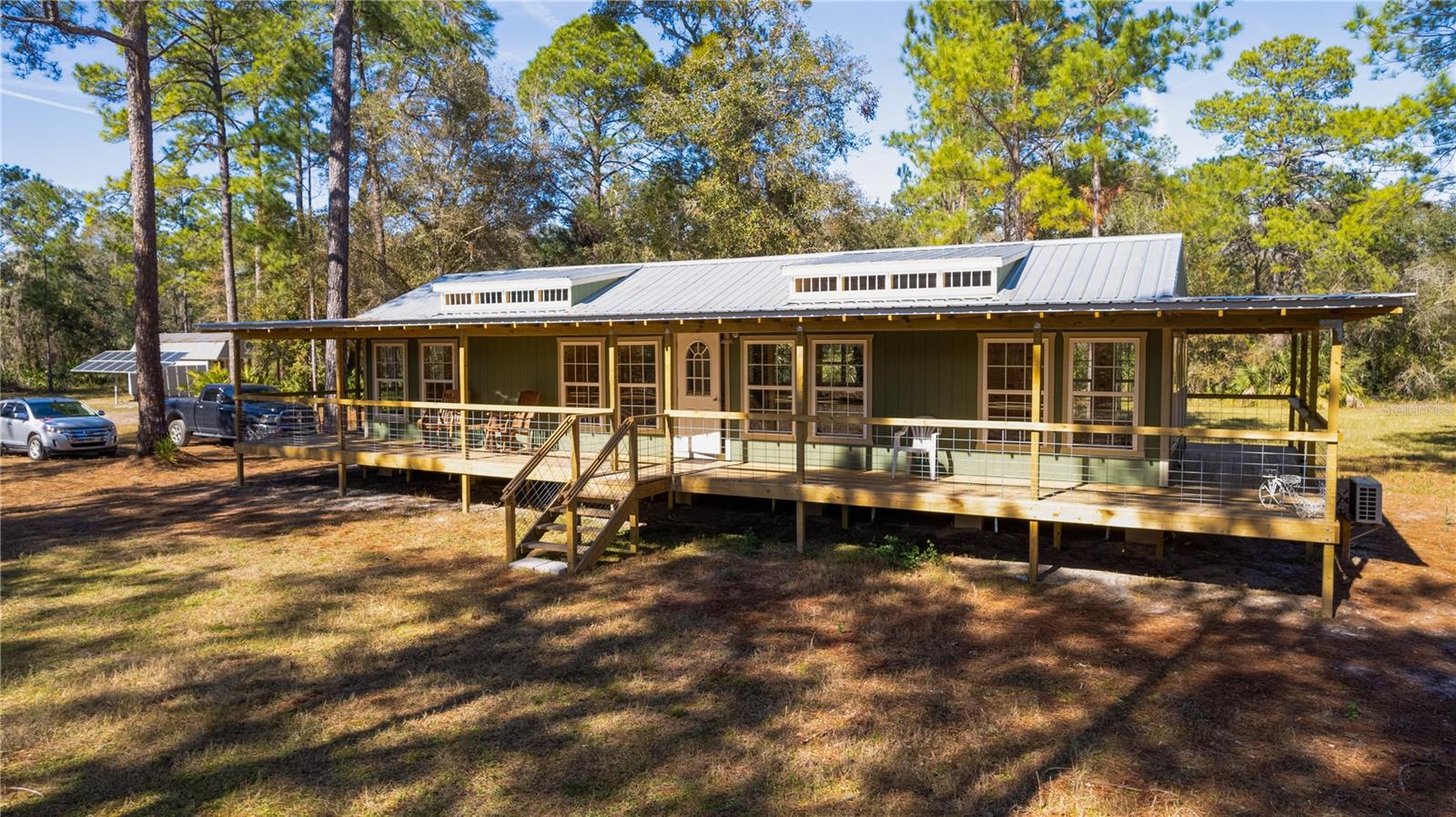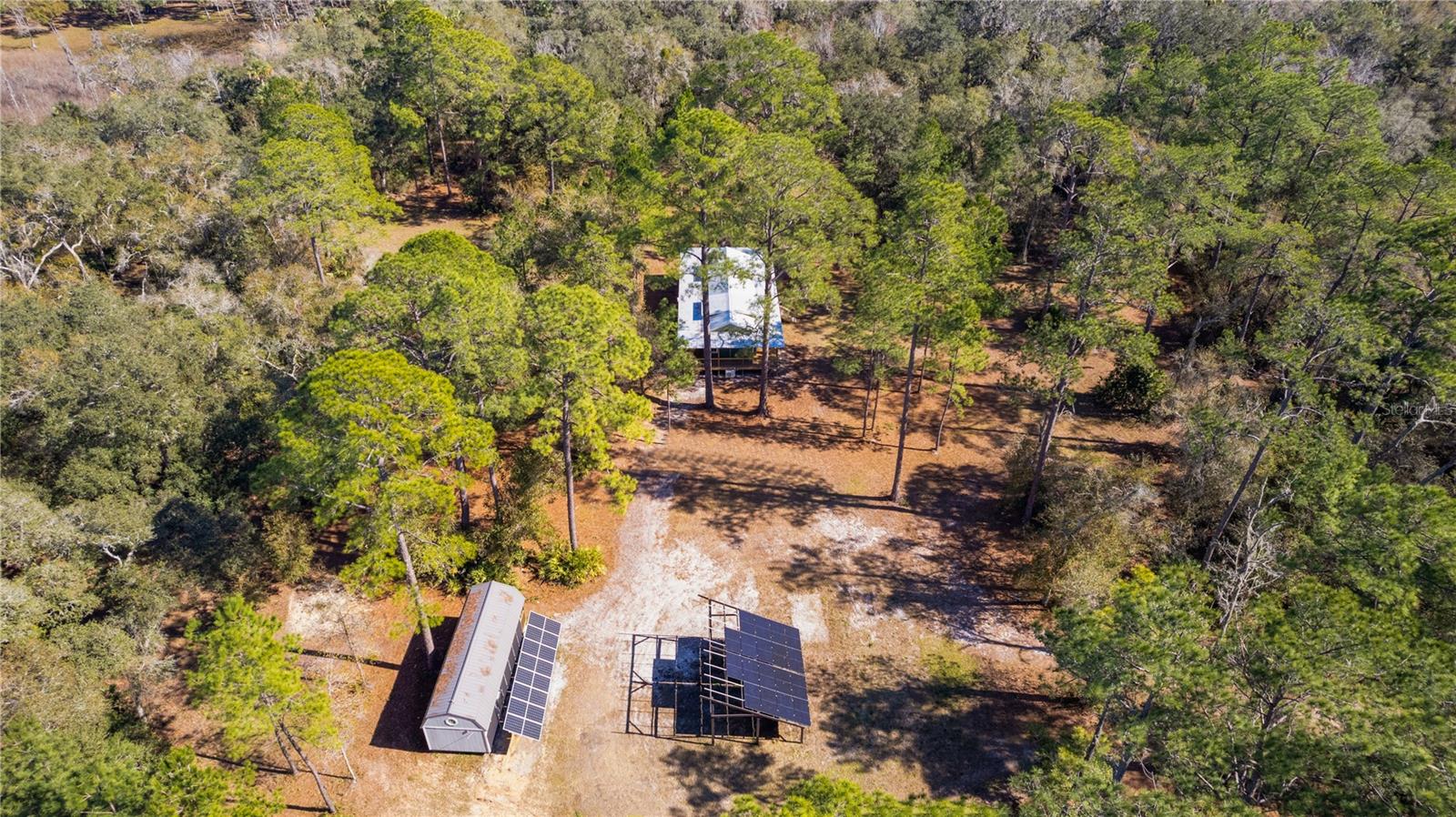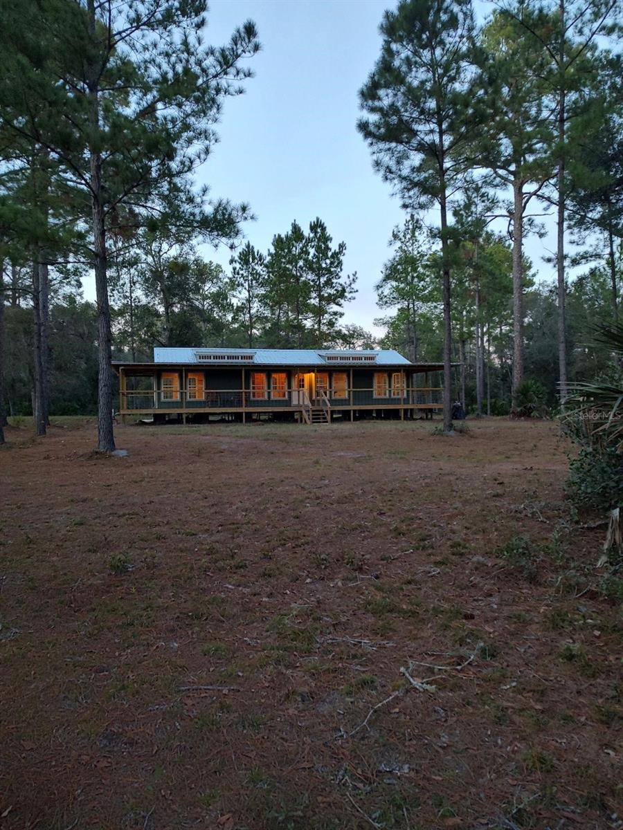 **Significant price reduction on this hidden gem! Below appraised value!!** A small cottage on 18.8 acres surrounded by all natural, native growth, right in the heart of Florida yet a quick easy drive to major roadways, the Florida Turnpike, interstate, and, 30 minutes to the Gulf. This cabin was custom designed by the owners and assembled onsite. So charming and inviting on the outside but wait til you see the inside! All custom, everything in it from the heart pine walls and ceiling, to the 1960's Sears Electric stove that works like a charm, to the aqua refrigerator, to the breakfast bar counter with the raw edge, to the copper sink, but wait til you see the bathroom! All the details. The bedroom is full of windows for letting in all the outside light, day or night and has a walk-in closet. It's like sleeping in a tree house. Custom lighting throughout and stylized ceiling fans just keep adding to the setting. There is a small pantry for additional storage. Barn style sliding doors open to the walk-in closet and bath. Outside there is a walk-around porch, with railing and wire underneath to keep the littles and pets safe. You can sit on the porch in the morning and have your coffee to watch the sunrise and move to the other to watch the sunset. Then, there's more. There is an additional shed with a loft that stores part of the solar equipment but can be used for small storage or bunkhouse. As shown in the photos, this property is solar powered. Fully functional. There is a breaker box that also has the set-up to convert to generator power or if the owner chooses to run electric in, can convert to electric just with the flip of the handle. There are on demand hot water heaters. A short distance away from the cabin, there are three covered storage containers for equipment or materials, or toys, on a 20x25 concrete pad. The solar powered well is also there. This property is unique, for sure, waiting for the family looking for a week-end camp, or for the off the grid preppers, Airbnb, the list is long. Full of wildlife, wildflowers, and Mother Nature. Accessed by a winding drive thru the native woods, you would never know it's there. This property did not flood during the hurricane. It is well worth the look! Equal Opportunity Housing.