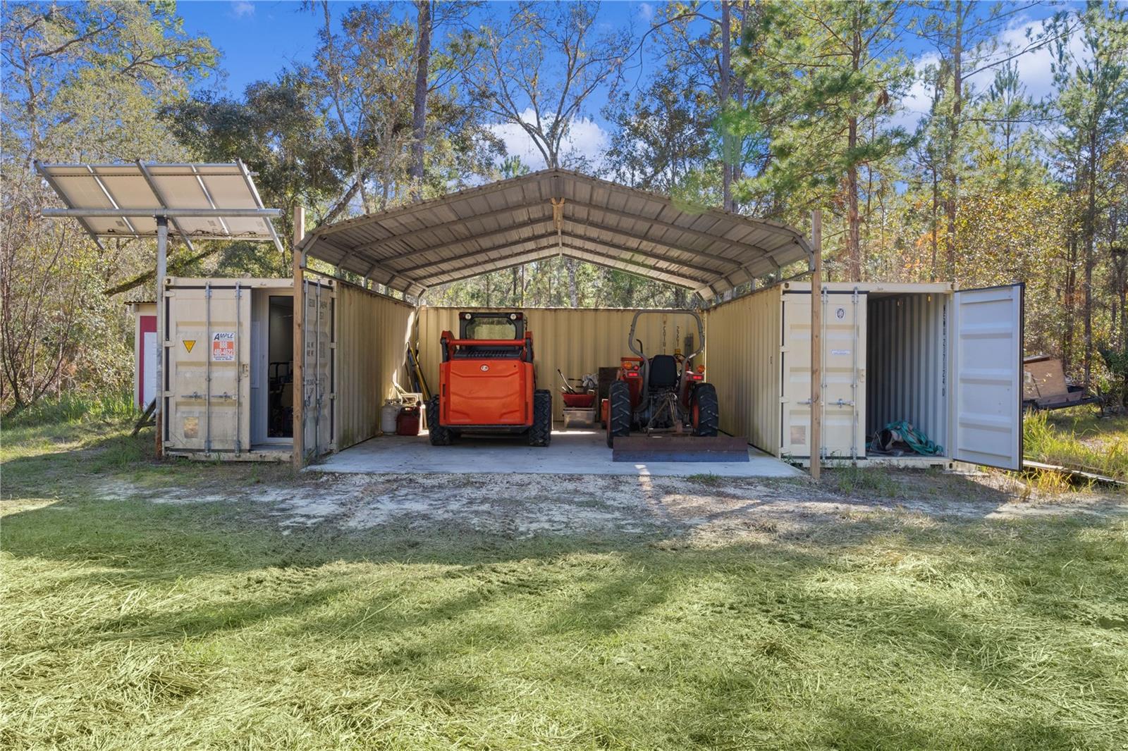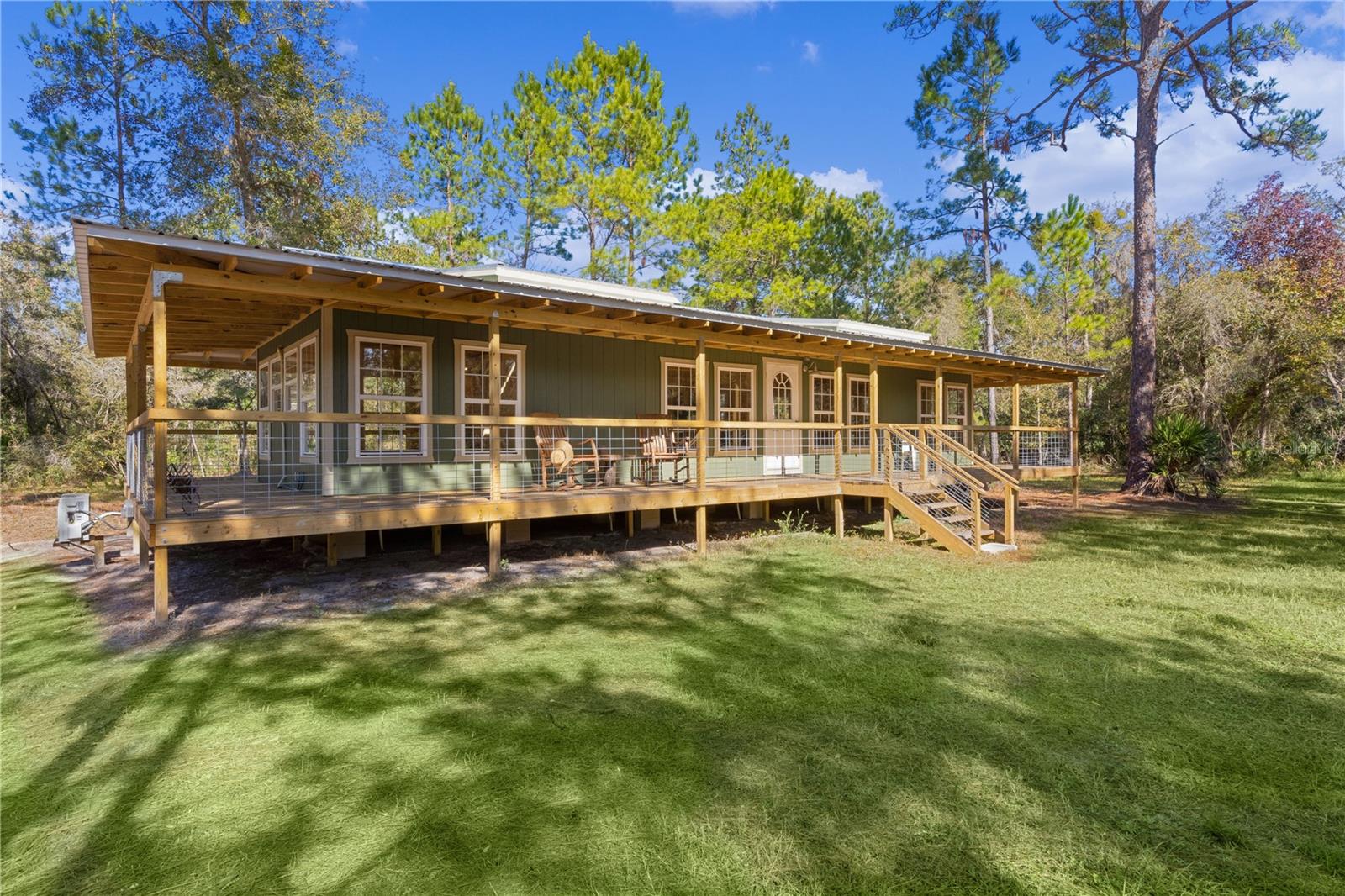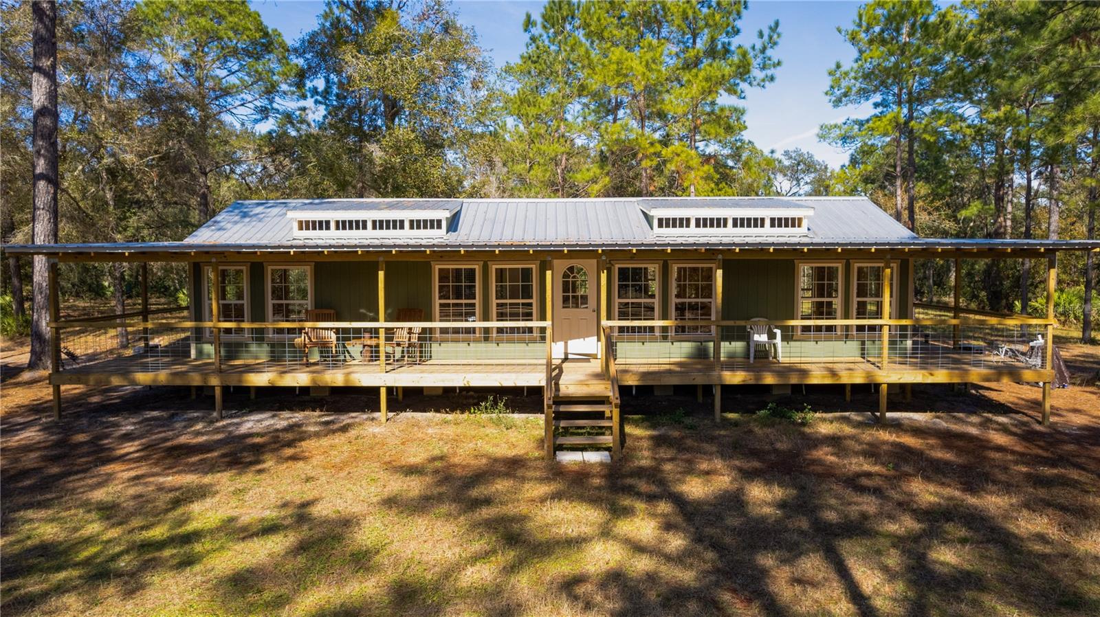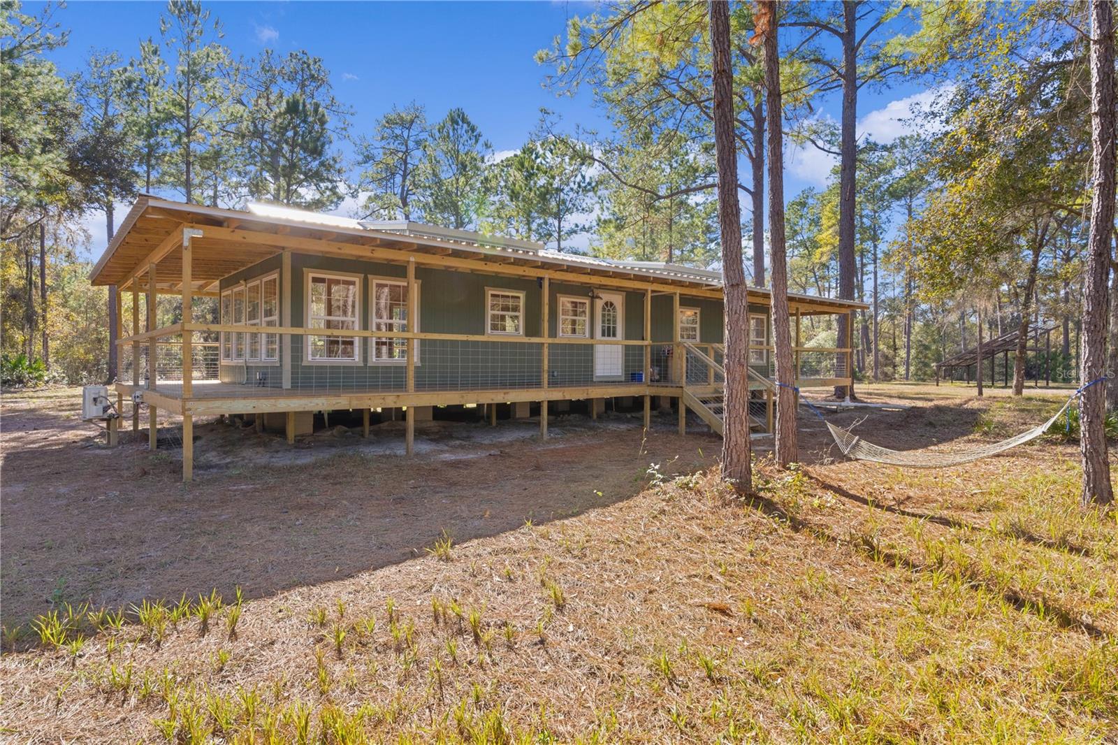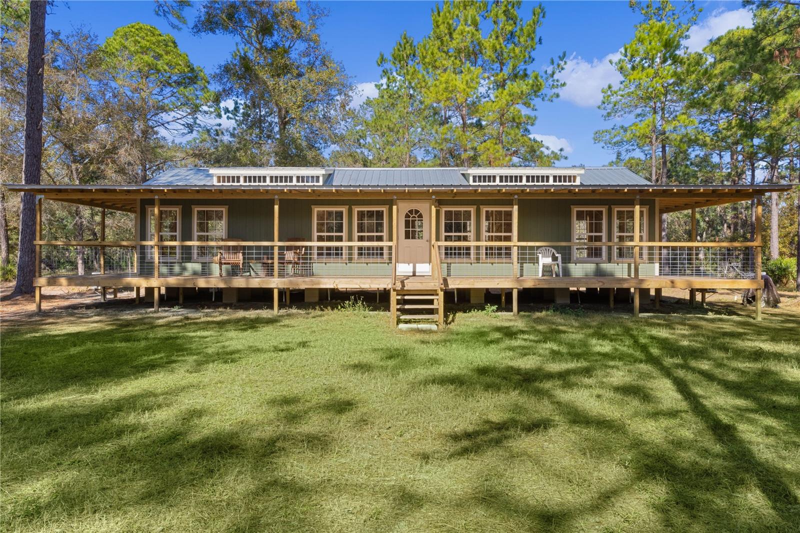 **Significant price reduction on this hidden gem! Below appraised value!!** A small cottage on 18.8 acres surrounded by all natural, native growth, right in the heart of Florida yet a quick easy drive to major roadways, the Florida Turnpike, interstate, and, 30 minutes to the Gulf. This cabin was custom designed by the owners and assembled onsite. So charming and inviting on the outside but wait til you see the inside! All custom, everything in it from the heart pine walls and ceiling, to the 1960's Sears Electric stove that works like a charm, to the aqua refrigerator, to the breakfast bar counter with the raw edge, to the copper sink, but wait til you see the bathroom! All the details. The bedroom is full of windows for letting in all the outside light, day or night and has a walk-in closet. It's like sleeping in a tree house. Custom lighting throughout and stylized ceiling fans just keep adding to the setting. There is a small pantry for additional storage. Barn style sliding doors open to the walk-in closet and bath. Outside there is a walk-around porch, with railing and wire underneath to keep the littles and pets safe. You can sit on the porch in the morning and have your coffee to watch the sunrise and move to the other to watch the sunset. Then, there's more. There is an additional shed with a loft that stores part of the solar equipment but can be used for small storage or bunkhouse. As shown in the photos, this property is solar powered. Fully functional. There is a breaker box that also has the set-up to convert to generator power or if the owner chooses to run electric in, can convert to electric just with the flip of the handle. There are on demand hot water heaters. A short distance away from the cabin, there are three covered storage containers for equipment or materials, or toys, on a 20x25 concrete pad. The solar powered well is also there. This property is unique, for sure, waiting for the family looking for a week-end camp, or for the off the grid preppers, Airbnb, the list is long. Full of wildlife, wildflowers, and Mother Nature. Accessed by a winding drive thru the native woods, you would never know it's there. This property did not flood during the hurricane. It is well worth the look! Equal Opportunity Housing.