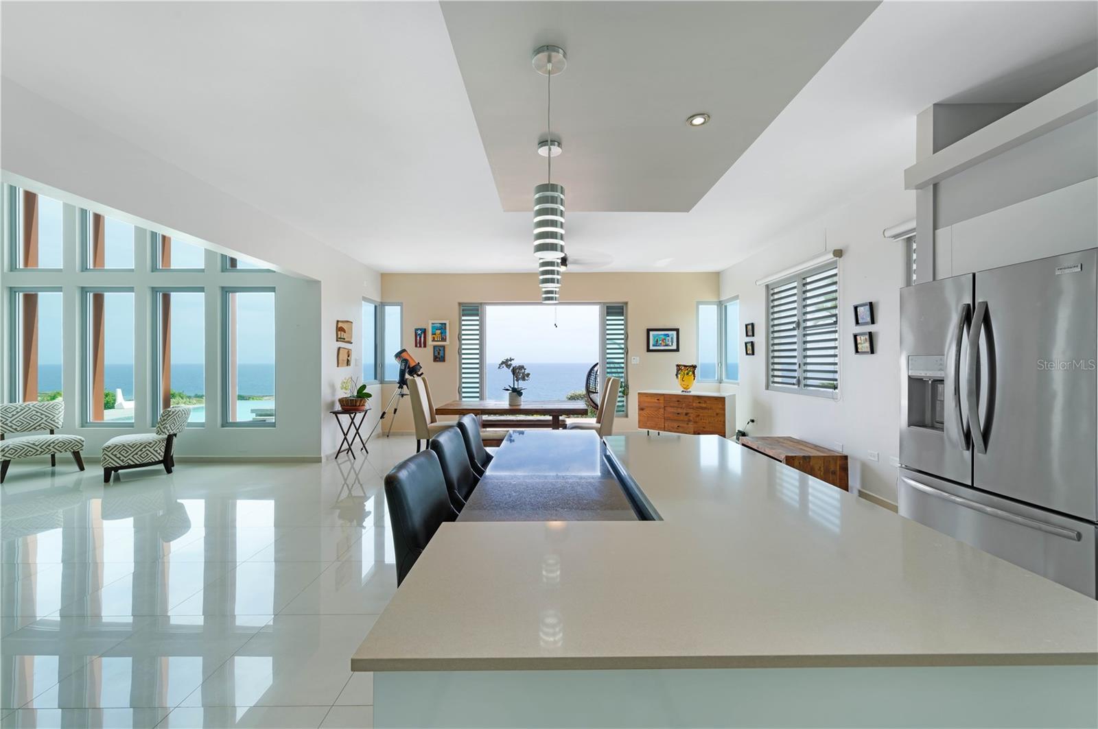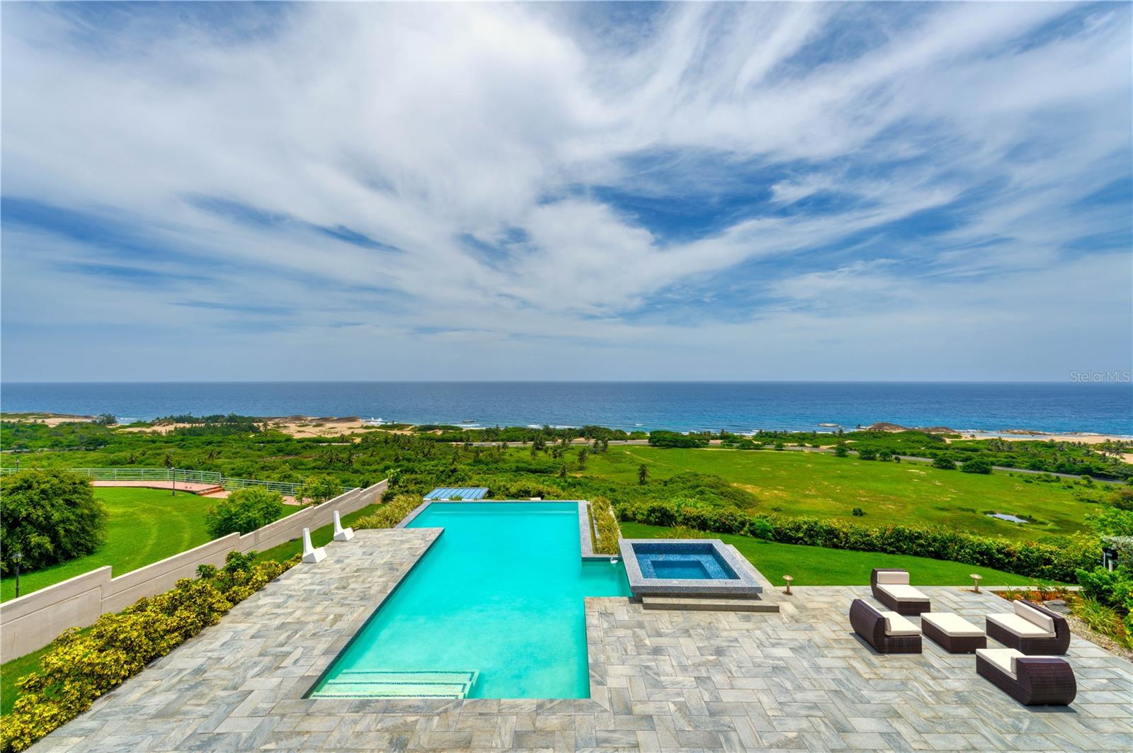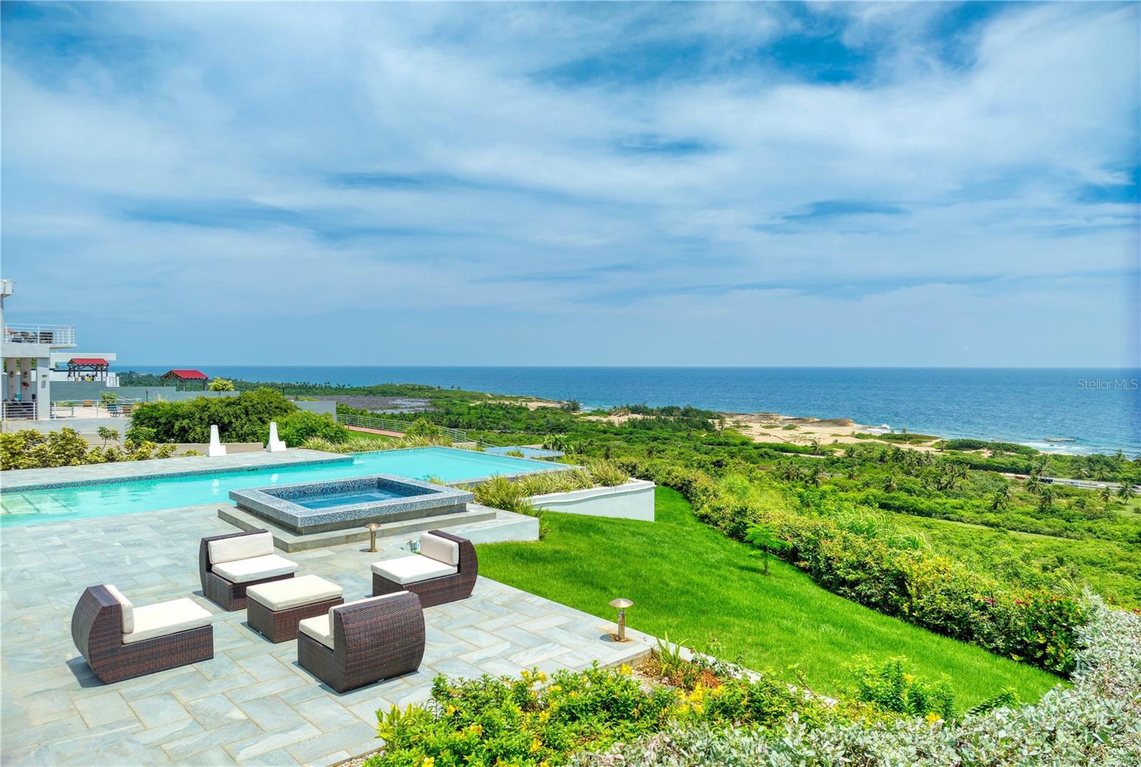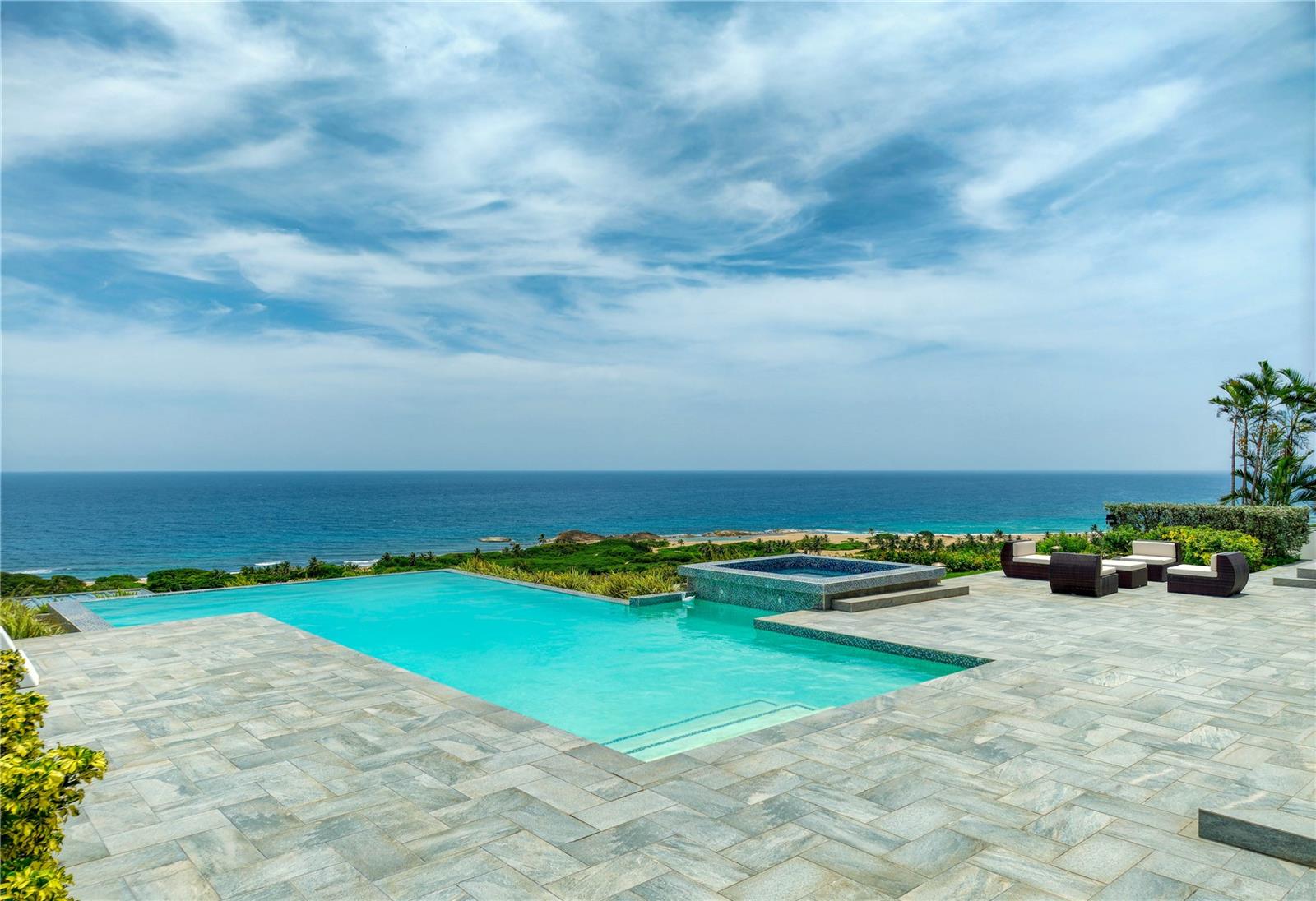 This oceanview gem offers a rare chance to own a cliff-front property in the highly sought-after area of Isabela, situated above the renowned Playa Middles, a favorite among surfers. Located within Estancias Del Mar, this residence boasts breathtaking water vistas that can be enjoyed from every vantage point, providing an unparalleled connection to the natural beauty of the Atlantic Ocean. Showcasing 4 bedrooms, including the spacious primary bedroom on the upper floor, this home affords approx. 5,022 interior square feet and 3,735 square feet of outdoor space. The ample first floor seamlessly integrates the kitchen, dining room, and living room, all featuring stunning seascape views that can be savored from the comfort of your own home. The open-concept layout creates an inviting atmosphere, perfect for entertaining and enjoying the coastal scenery, making it an ideal space for family gatherings and social events. The property features three full bathrooms and a powder room, full backup power generator, water cistern and a three-car garage/driveway that provides an additional 1,943 square feet. Stepping outside, the property is highlighted by a covered terrace that leads to a stunning infinity pool, creating a luxurious and serene oasis that serves as the perfect setting for alfresco dining, relaxation, and taking in the mesmerizing sunsets over the Atlantic. Located within 9 miles of Aguadilla International Airport, this prime location also offers proximity to Jobos Beach, just 4 miles away, providing endless opportunities for water sports and exploration. Whether you're looking to unwind on the beach, take a leisurely stroll along the shore, or enjoy the thrill of surfing, this property bestows the perfect blend of tranquility and adventure. Isabela is known for its stunning natural beauty and laid-back atmosphere. The coastal town offers a diverse array of attractions and activities that make it a popular destination for both locals and tourists. Isabela is renowned for its pristine beaches, Playa Jobos being one of the most famous, attracting surfers with its strong waves and visitors with its vibrant beach culture. Whether you’re looking to surf the waves, hike through the lush forest of Guajataca, explore historical sites, or simply relax on a beautiful beach, Isabela offers something for everyone. Experience luxury living in this exquisite oceanview property, where the beauty of the Atlantic Ocean meets unparalleled comfort and style. With its stunning views, spacious layout, and prime location, this property is the ultimate retreat for those seeking a serene and invigorating coastal lifestyle.
