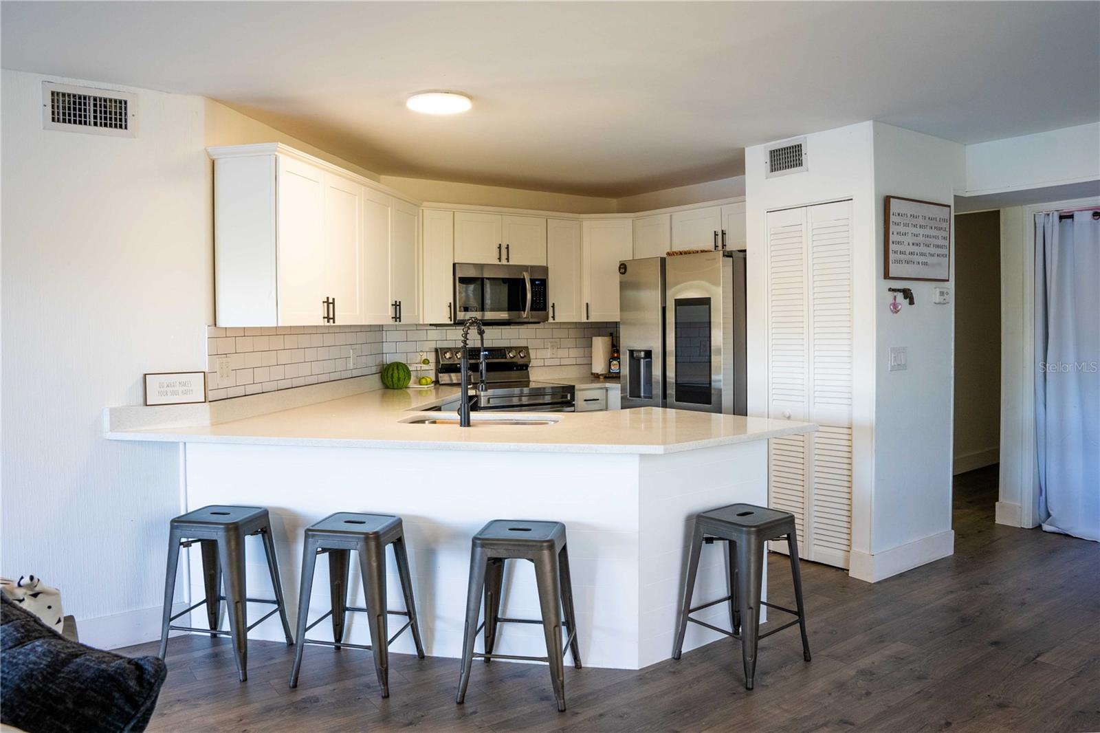 Welcome to this newly renovated, Fisherman’s paradise overlooking Pottsburg Creek, attached to the St. Johns River. As you walk in, you will immediately notice the brightness of a professional paint job and new flooring throughout complete with double padded planks added for soundproofing. As you make your way into the open living room, kitchen, and dining room you will immediately be met with breathtaking water views. Your newly renovated kitchen includes: Quartz Countertops, Stainless Steel appliances including a Samsung Smart Touch Screen Refrigerator with the ability to connect to your phone, Samsung stove with smart capabilities, new kitchen sink and piping, subway tile backsplash, and all new cabinets. As we make our way into the Primary suite, you will notice a new sliding glass door that gives you access to your covered patio overlooking the water. Moving into the primary ensuite, newly replaced double vanities with Quartz Counters, new toilet, walk in closet, and newly tiled walk-in shower. Other updates include: Secondary Bathroom remodel with new vanities, Quartz Countertop, and new toilet. New light fixtures, fans, and faucets throughout. Updated fireplace with black shiplap. Residents have access to fish off the dock and/or dock a boat/jet ski along with access to a private community pool. Centrally located giving easy access to shopping, universities, dining, beaches, airport, and entertainment.