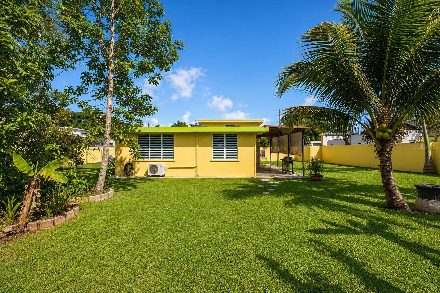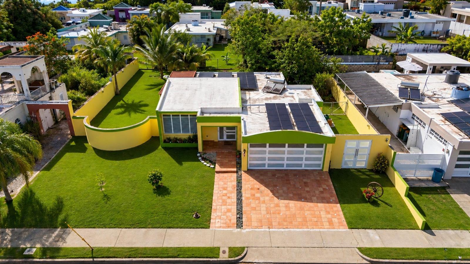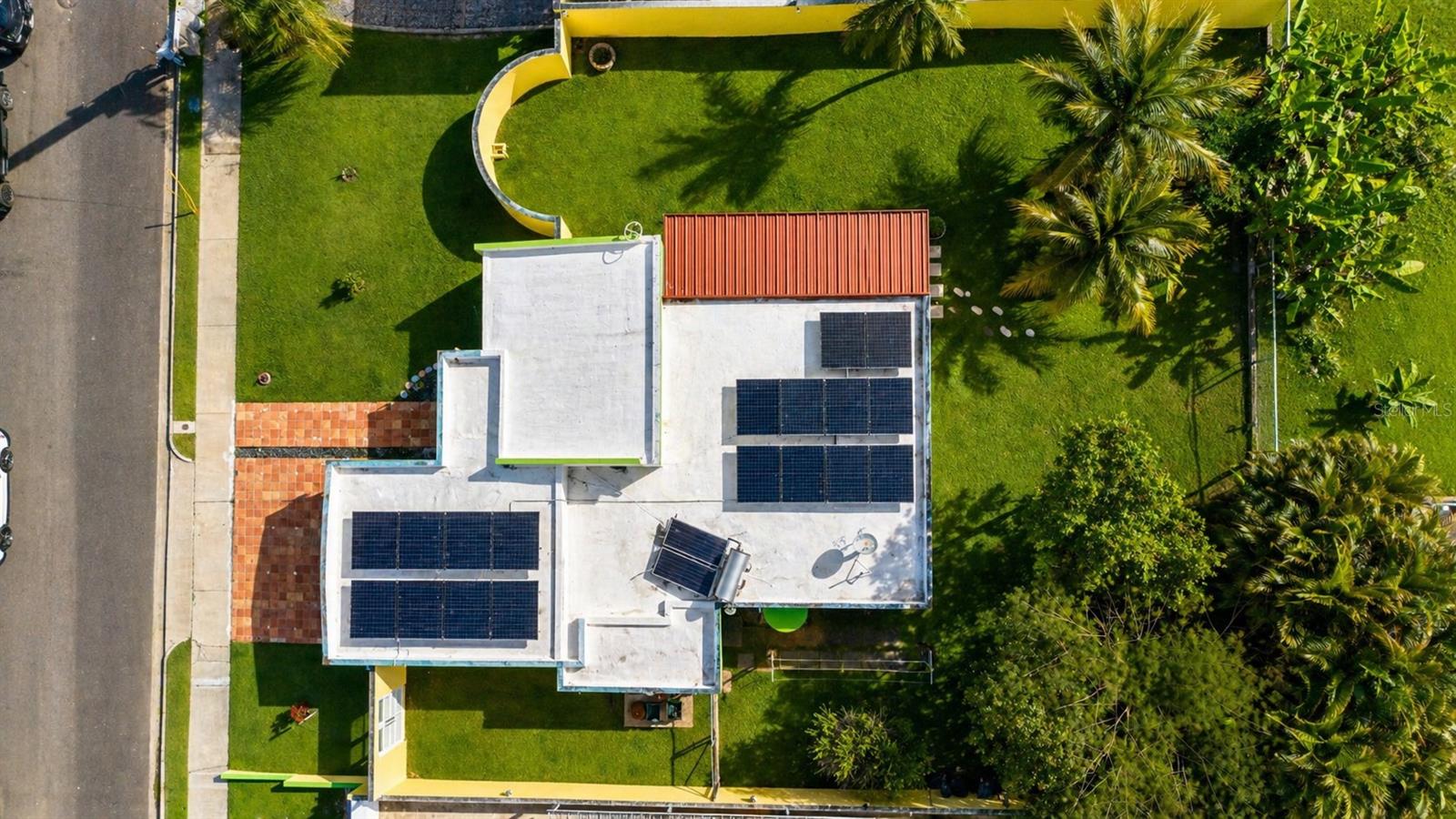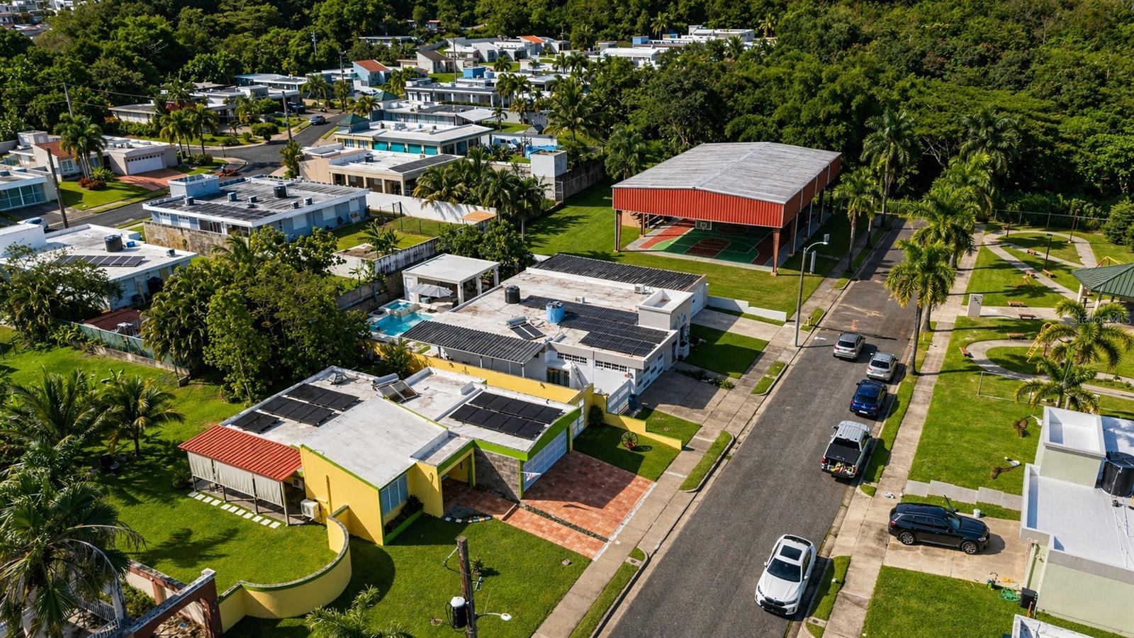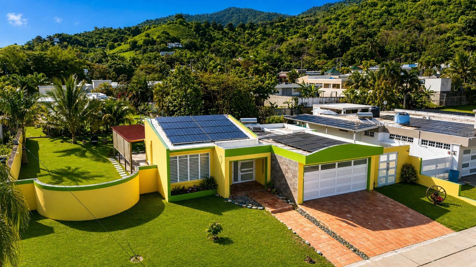 Exclusive Residence in Estancias de Juncos – Completely Remodeled. Located in a private, gated community, this property combines modern design, high ceilings in the living and dining rooms, and excellent natural light. Minutes from Amgen, Medtronic, and Becton Dickinson, it offers a strategic location. It has been completely remodeled, including new windows, updated exterior and interior doors, and security doors/windows, enhancing both the aesthetics and security of the home. It features a mahogany kitchen, a laundry area, and optimized spaces. The spacious master suite and secondary bedrooms include split-unit air conditioning in all areas, modern closets, and completely renovated bathrooms. Enjoy a cozy terrace and a spectacular, large, grassy yard with fruit trees, fully fenced, with two concrete sides providing privacy and tranquility. This residence is distinguished by being a green home, equipped with a solar panel system with a Tesla battery, a 600-gallon cistern, a solar water heater, and a gas system for the stove, dryer, and water heater, offering energy efficiency and resilience. The community offers indoor sports courts and a passive park, ideal for family enjoyment in a safe and exclusive environment. It includes a double carport with a garage door, a fully equipped kitchen, and air conditioning throughout. A unique opportunity that combines location, security, amenities, and energy self-sufficiency. Appliances Included: Refrigerator, Stove, Washing Machine, Solar Water Heater, 4 Split Unit Air Conditioners, All Light Fixtures, Storm Shutters, 600-Gallon Cistern, Gas Water Heater.
