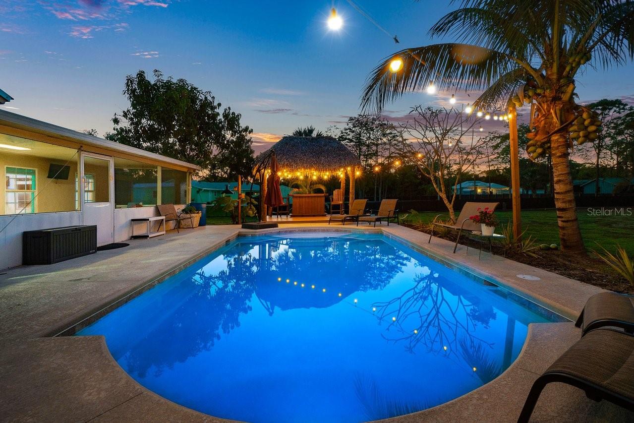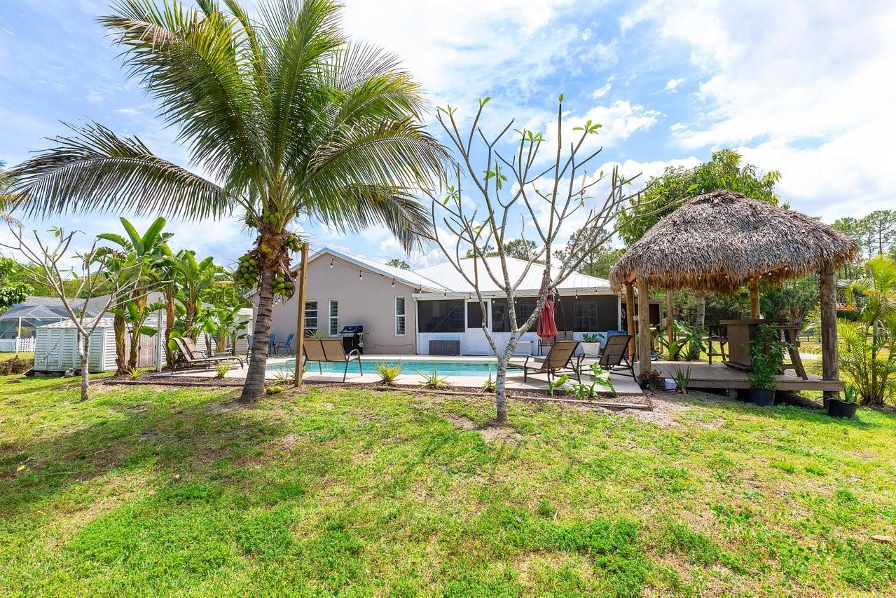 Exquisite Jupiter Farms Retreat – A Rare Find Nestled on 1.2 acres in the peaceful Jupiter Farms community, this beautifully updated 3-bedroom, 2-bathroom, 2,035 sqft home offers the perfect blend of modern comfort and privacy. The spacious split floor plan is bright and inviting, featuring fresh interior paint (2020), updated light fixtures, and ceiling fans throughout. The spacious kitchen boasts updated appliances, ideal for creating delicious meals in a sleek, functional space. The master suite includes two walk-in closets, offering abundant storage, as well as an ensuite bathroom for a private retreat. An additional linen closet in the bathroom adds even more storage convenience. Step outside to your own private sanctuary. A heated saltwater pool invites year-round enjoyment, while the lush surroundings provide the perfect backdrop for relaxation or entertaining. The screened-in patio, complete with a fridge and stove for outdoor cooking, enhances your living space, and a custom-built tiki hut (installed in 2022) adds a touch of paradise. This property is designed for outdoor living, with a concrete pad for RV or trailer parking, RV hookup, plus one large shed and two standard sheds for storage. The entire property is fully fenced with a drive-in gate, providing extra security and privacy. Fruit trees, including Mango, Lime, Avocado, and Coconut, add both beauty and bounty to your yard. The agriculturally zoned property offers plenty of space for chickens or horses, making it ideal for hobbyists and animal lovers. The enclosed bonus room offers endless possibilities—transform it into a game room, fitness room, home theater, or even a craft room, tailoring the space to suit your needs. With a 2021 Rheem water heater, a 2022 Fujitsu AC system with a 10-year warranty, and a durable metal roof (installed in 2019), this home is energy-efficient and ready for years of enjoyment. Hurricane shutters and updated windows provide peace of mind during storm season. Located just 20 minutes from Palm Beaches and 25 minutes from Palm Beach International Airport, this home combines privacy with convenience. Nearby shopping, dining, and amenities make this the perfect place to call home. Priced to sell, this stunning property won’t last long. Schedule your private tour today and experience the lifestyle you deserve.