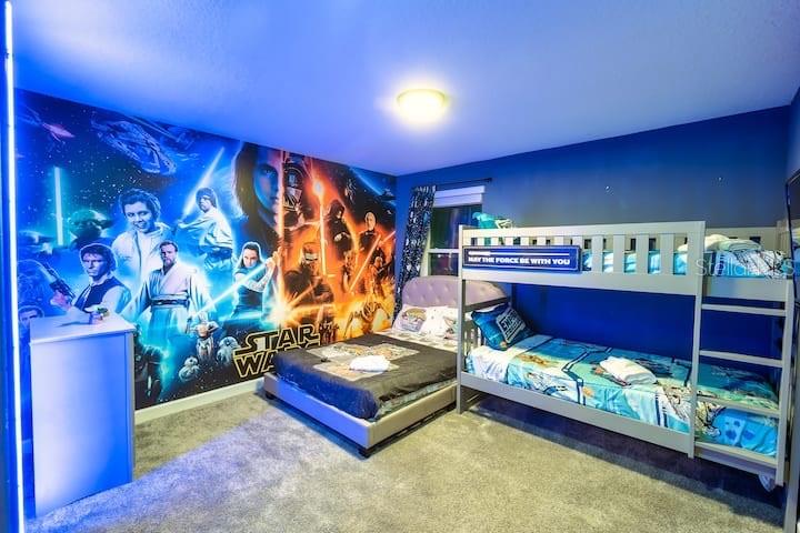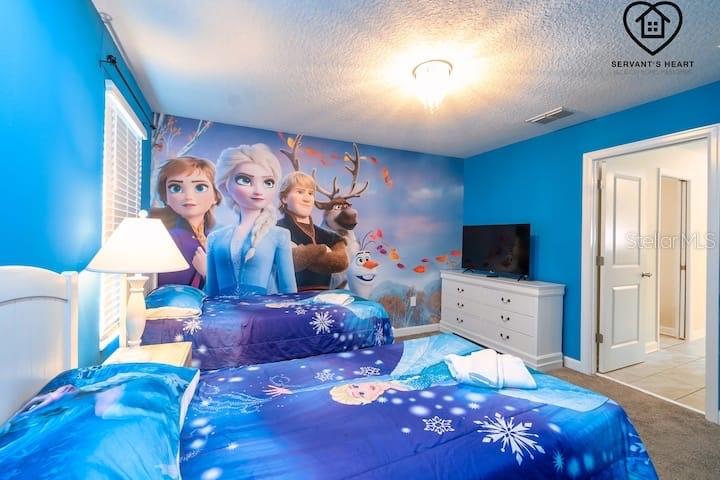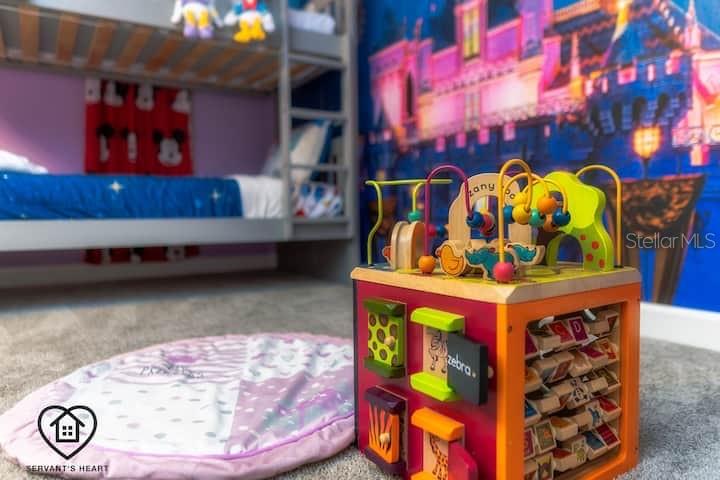Luxurious 8-Bedroom Vacation Home in Storey Lake Resort – Prime Location & Income Potential! Welcome to your dream vacation home in Storey Lake Resort, one of Florida’s most sought-after short-term rental destinations! This stunning 8-bedroom, 5-bathroom waterfront home offers 4,289 sq. ft. of beautifully designed living space, making it the perfect retreat for families or an incredible investment opportunity. Located just 4 miles from Walt Disney World, 10 minutes from the iconic Town of Celebration, and a short drive to Universal Studios, outlet malls, and top dining spots, this home is truly in the heart of it all! Inside, you’ll find a professionally furnished and thoughtfully themed interior that transports guests to different worlds, creating an unforgettable experience. The open-concept kitchen is equipped with 42-inch cabinets, sleek quartz countertops, and stainless steel appliances, perfect for entertaining. The home also features a newly updated movie theater, a themed game room, and HDTVs in every bedroom to maximize guest enjoyment. Step outside to your private heated pool & spa with a screened lanai, offering a relaxing oasis after a fun-filled day at the parks. Storey Lake Resort also boasts world-class amenities, including a water park with a lazy river, Tiki bar, full gym, basketball, volleyball & tennis courts, and multiple clubhouses—all included in your HOA! As a short-term rental-approved property, this home provides high occupancy rates and excellent revenue potential, with current bookings seamlessly transferring to the new owner. Don’t miss out on this prime investment opportunity or your chance to own a slice of paradise in one of Florida’s top vacation destinations. Your happily ever after starts here!