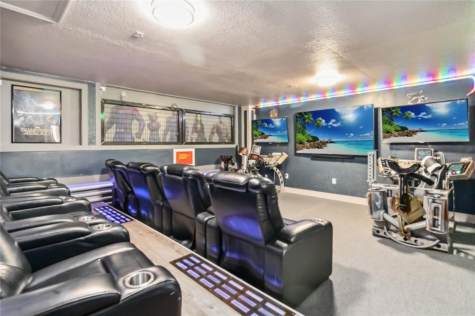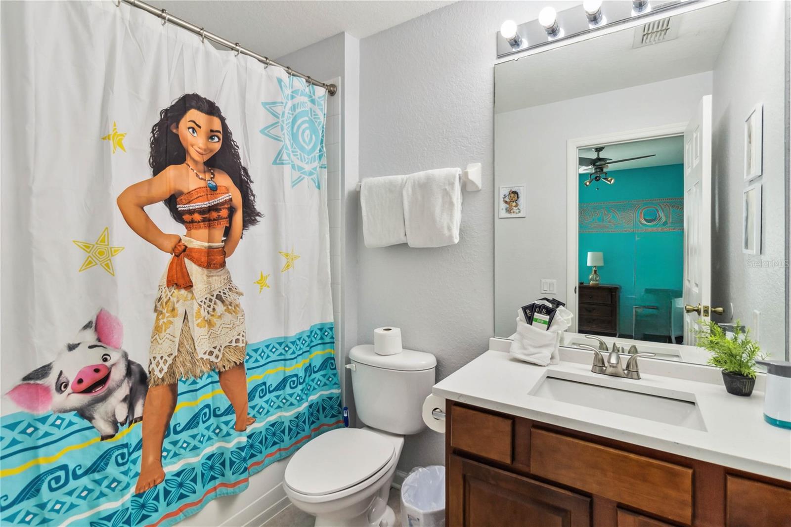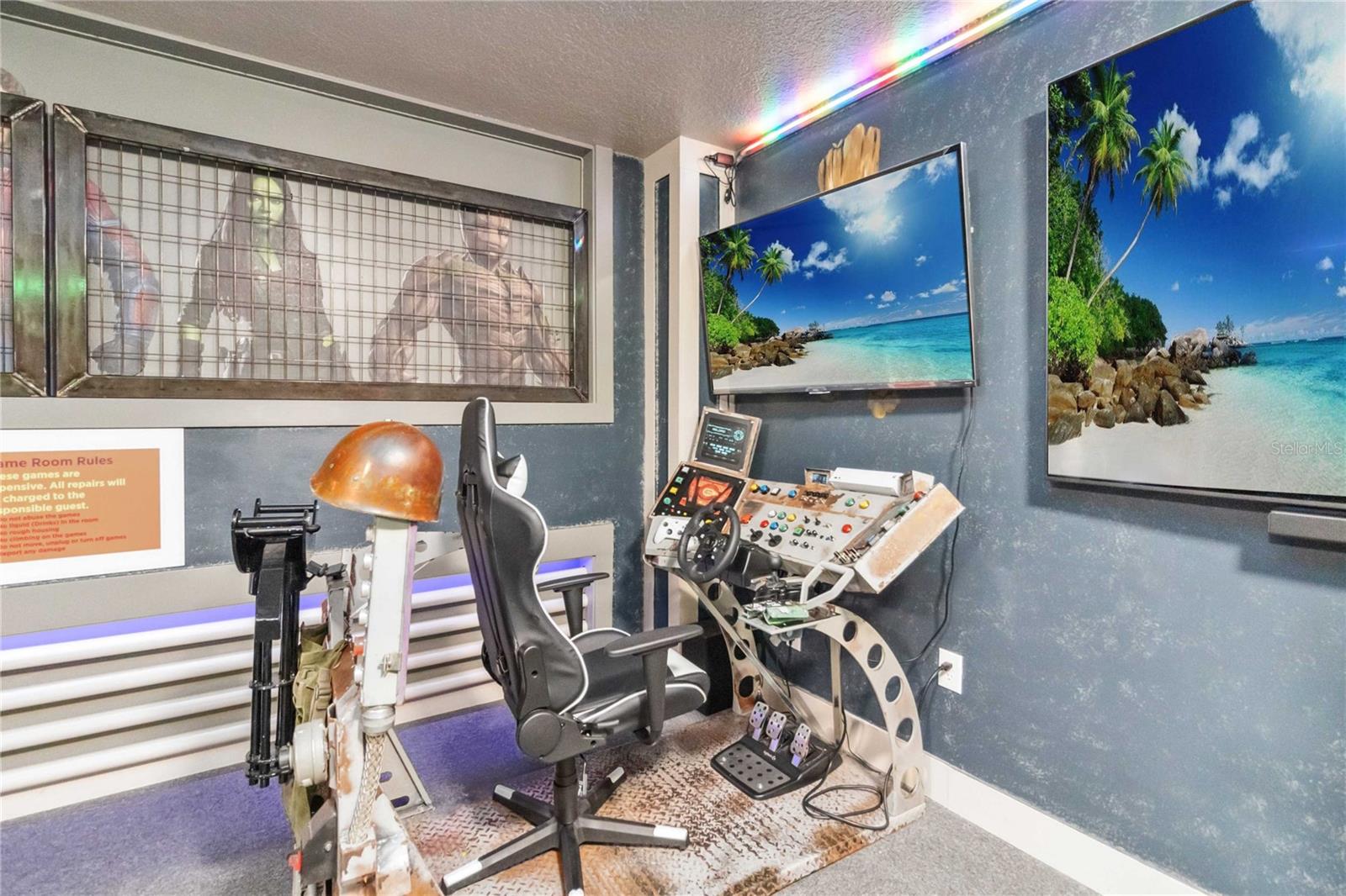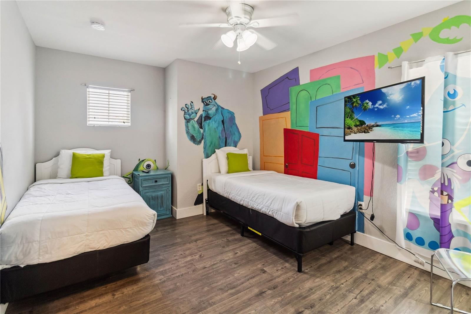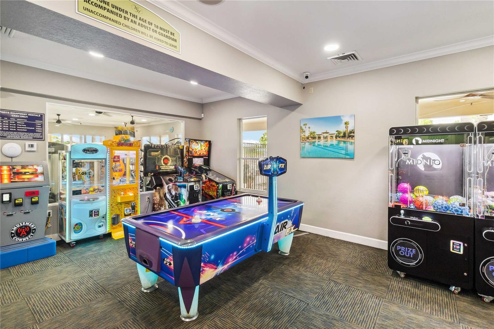 WELCOME to your DREAM vacation home! Located only 0.4 miles (away short 7-10 minute walk) to the the insane water park and community amenity center. Windsor Hills has everything you could want from water slides, to community events, movie theater, arcade and more! But you don’t even need to leave your home to enjoy the Movie and arcade experience since the garage has been professionally converted into a THEATER/GAMING ROOM! This home also features 2 large primary bedrooms (both on the first floor) each with walk in showers, private toilet, walk in closets and view of the backyard. The split floorpan is perfect for entertaining guests. 2 themed bedrooms, each with own en-suite are located upstairs. This one is NOT TO MISS!
