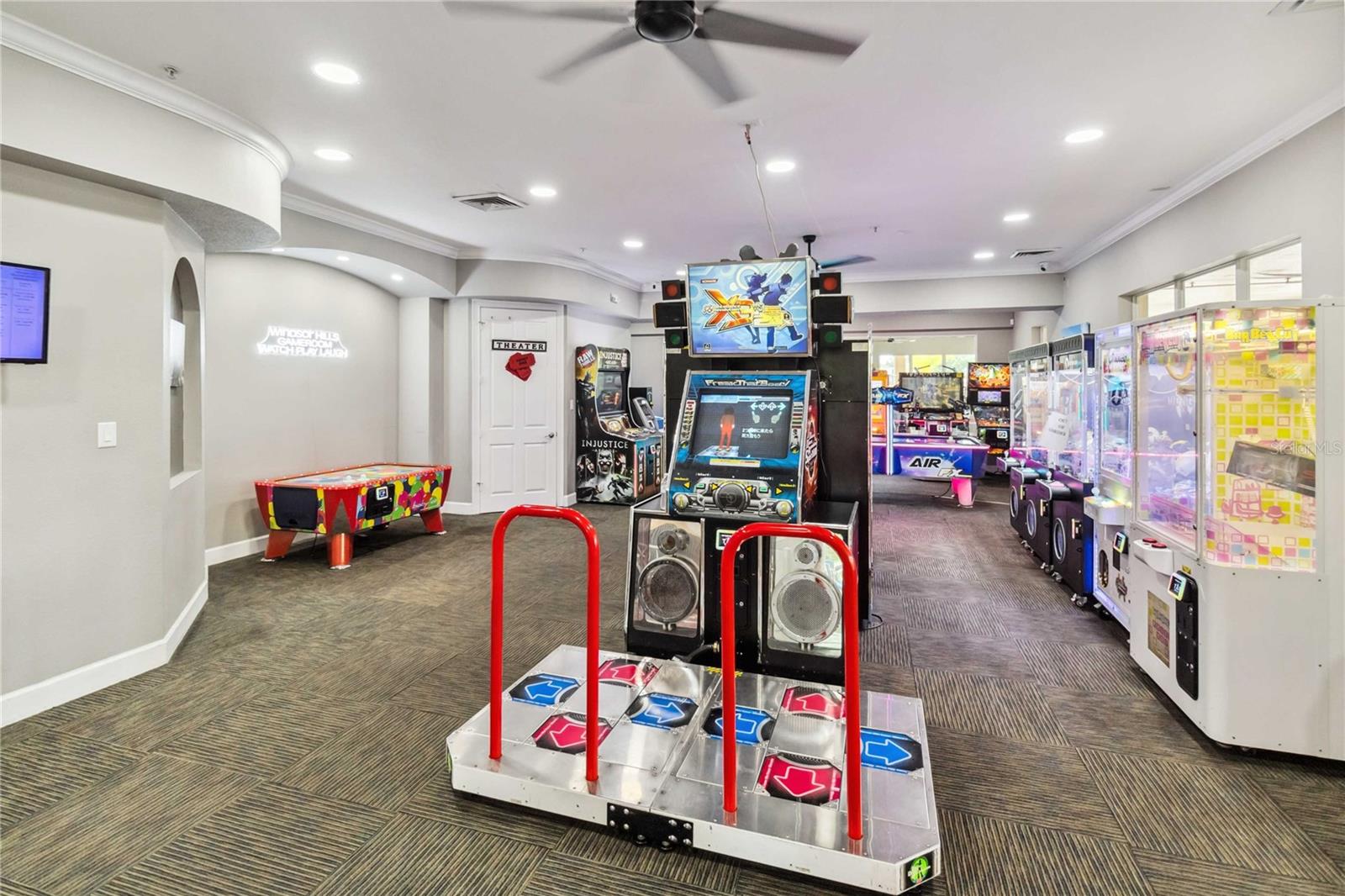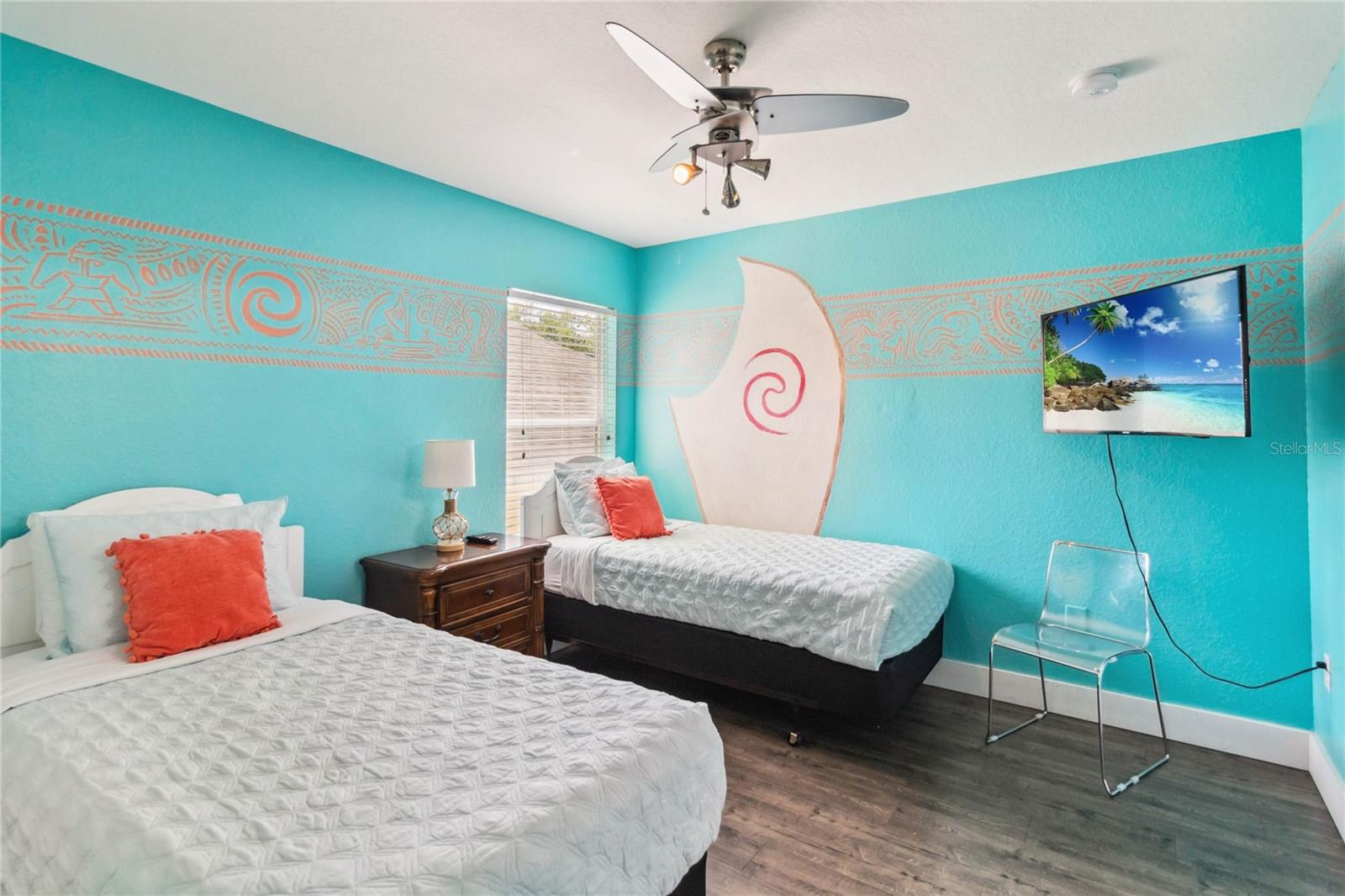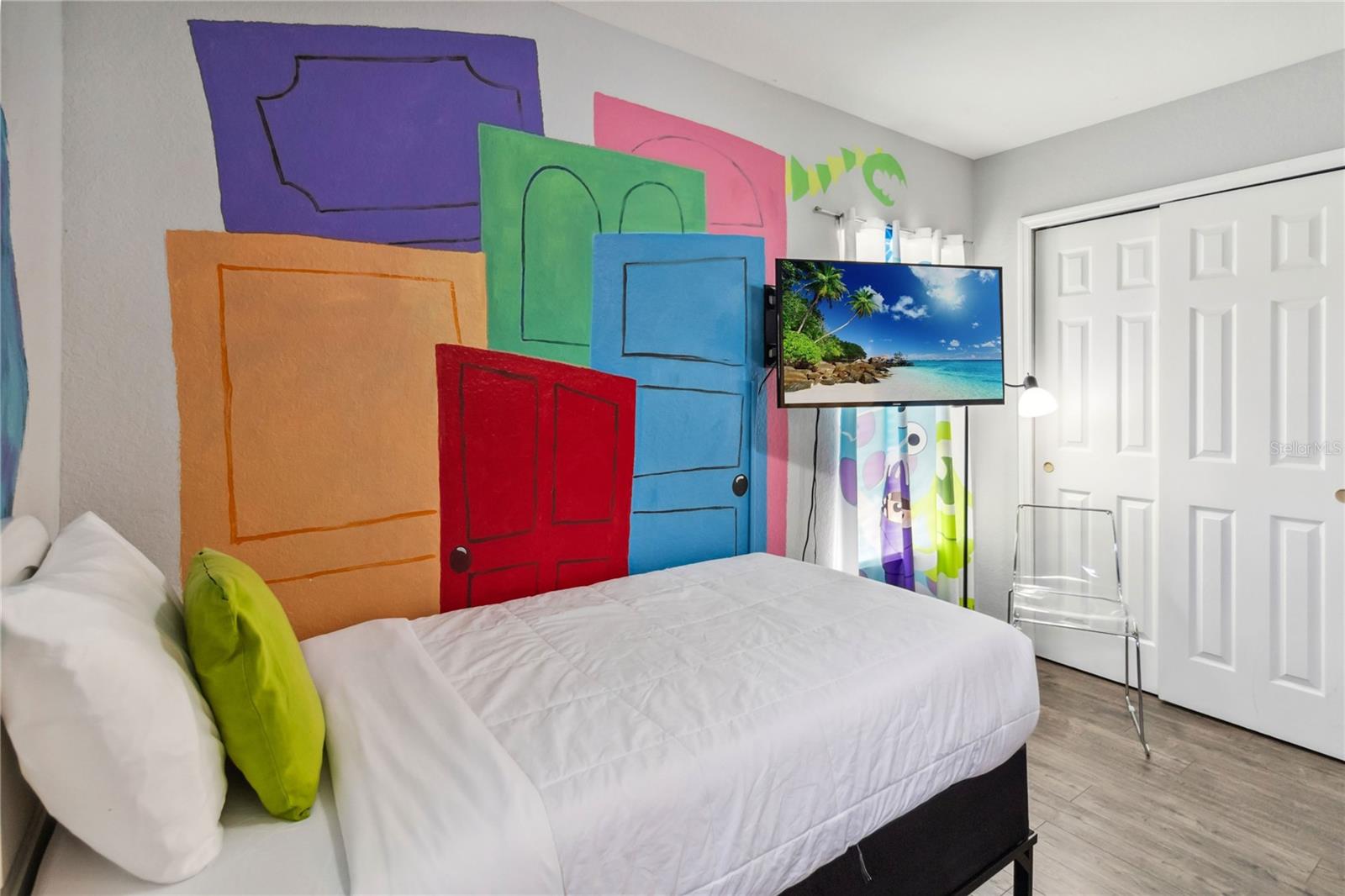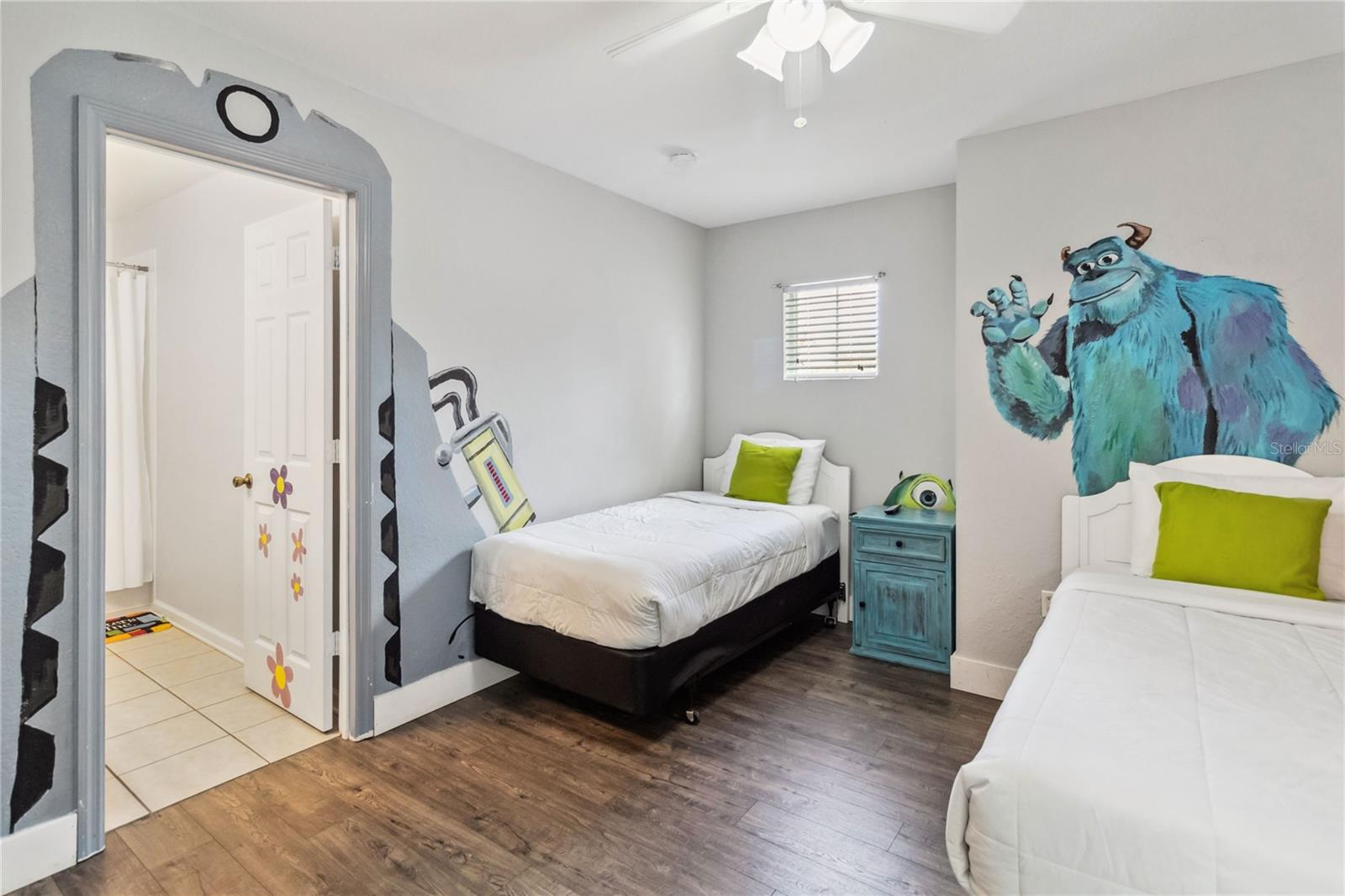 WELCOME to your DREAM vacation home! Located only 0.4 miles (away short 7-10 minute walk) to the the insane water park and community amenity center. Windsor Hills has everything you could want from water slides, to community events, movie theater, arcade and more! But you don’t even need to leave your home to enjoy the Movie and arcade experience since the garage has been professionally converted into a THEATER/GAMING ROOM! This home also features 2 large primary bedrooms (both on the first floor) each with walk in showers, private toilet, walk in closets and view of the backyard. The split floorpan is perfect for entertaining guests. 2 themed bedrooms, each with own en-suite are located upstairs. This one is NOT TO MISS!