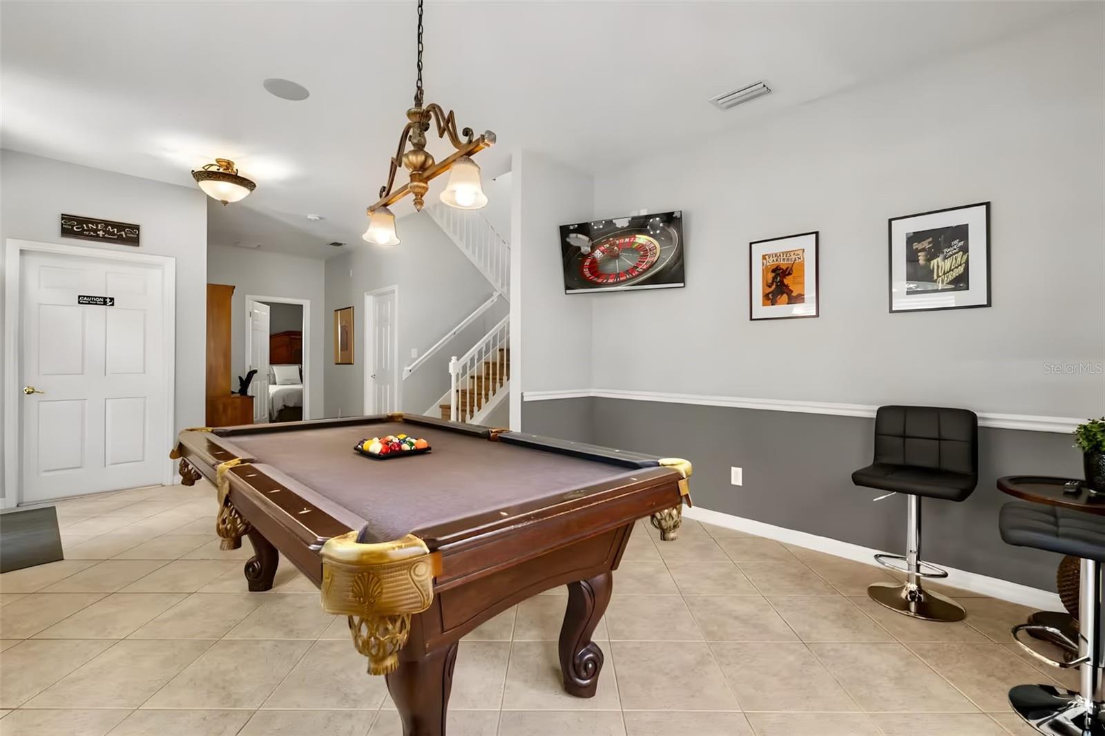 PRICE CONDITION AND LOCATION - This house has it all! Just 1.7 miles from the H2O water park, 1.4 miles from downtown Margaritaville's Sunset Walk, and 4.1 miles from Disney property. This heavily booked short term rental single family home is projected to gross 70k! It is perfect for an investment, new or second home. No leasing restrictions allows homeowners to enjoy their property whenever and however, they would like. Some recent improvements include: NEW ROOF 2021 - POOL RESURFACED 2024 - NEW AC 2023, Newly redecorated, Fully converted garage under AC being used as a huge Media Room. The property as a Gas range and pool heater! Enjoy the open floorpan with soaring ceilings to the second floor. This sought after floorpan features 2 MAIN BEDROOMS on main floor each with private ensuite. Upstairs you will find 4 more bedrooms - 2 Bedrooms with private ensuite AND 2 bedrooms connected by a Jack-and-Jill bathroom. All bedrooms are a generous size with Kings beds or 2 twin beds. Be transported to another time and embrace the feel of Luxury vintage travel through the beautiful themed decor. The classic movie theater is always a crowd pleaser. Don’t forget the billiard room, outdoor half bath and full guest bathroom on 1st floor. Step outside and enjoy the Florida weather on your oversized screened patio with covered seating area. Enjoy the large POOL and SPA complete with sun-shelf and water features. If that wasn’t enough this intimate and private community offers low HOA dues that cover the gate and lawn service, ensuring a well-kept neighborhood. This community is truly a hidden gem with a mix of full-time residents and vacation rentals. No limitations on property management companies, so you have the flexibility to make this home truly yours! Don't miss out on this incredible opportunity to own a piece of the magic near Disney.