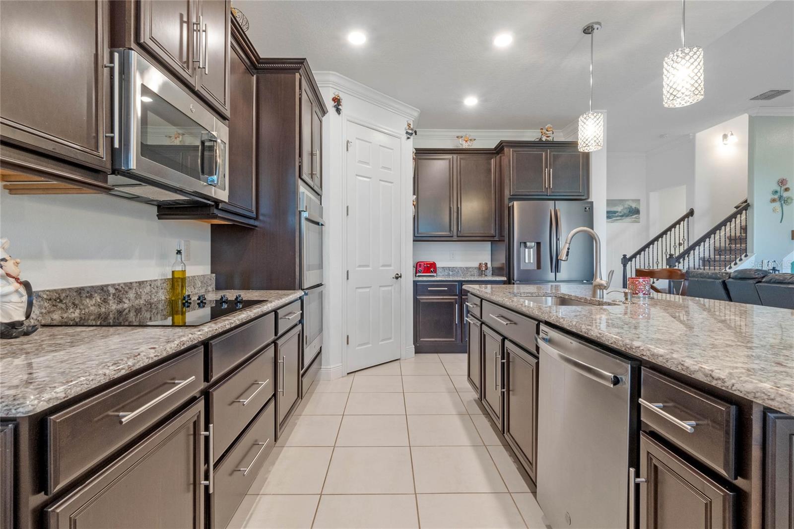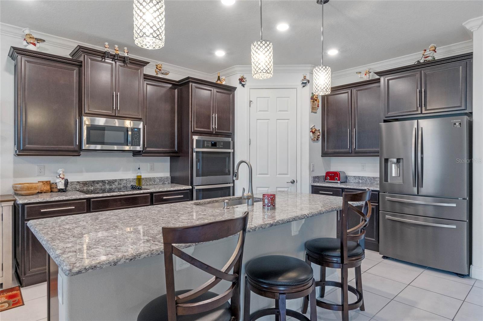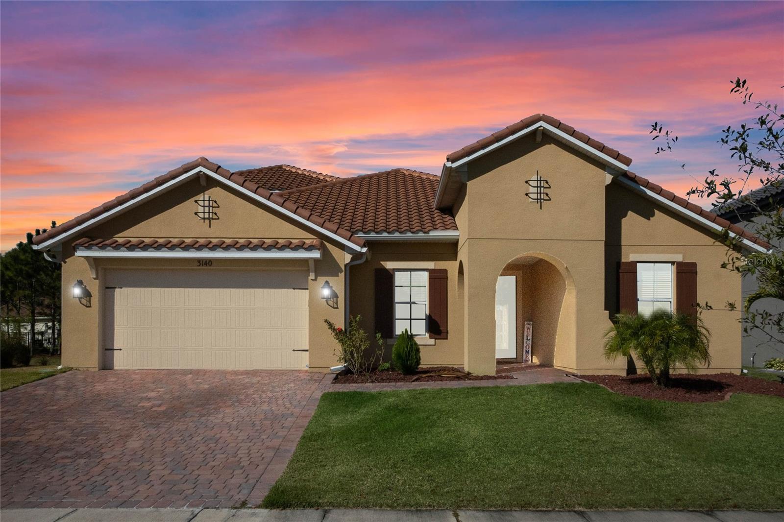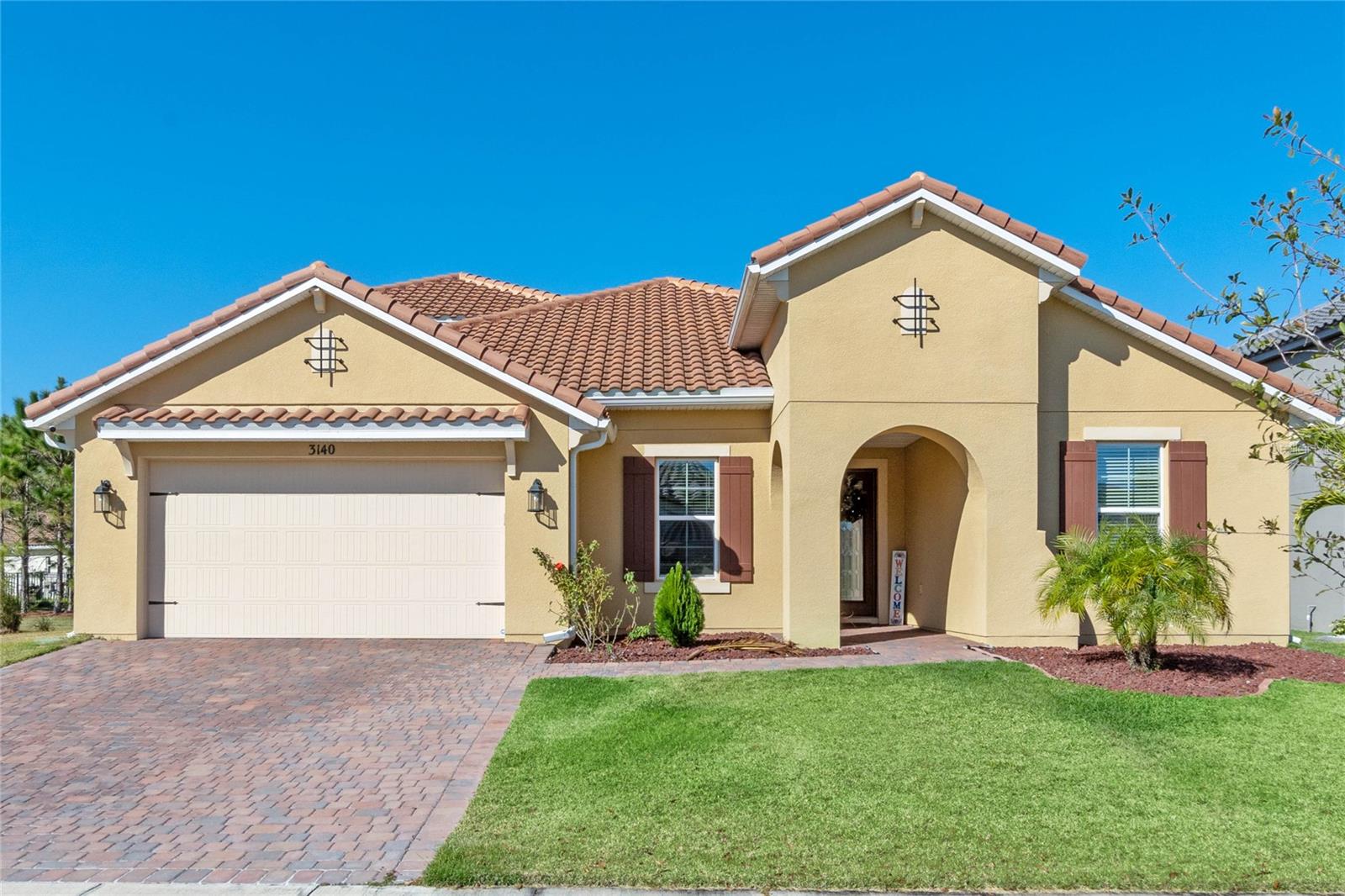 Welcome to the magnificent and impeccably maintained home nestled in the stunning resort-style community of Bellalago! This exquisite 4-bedroom, 4-bath residence, complete with an upstairs bonus room, boasts luxurious features such as crown molding, 5-inch baseboards, 8-foot doors, 12-foot ceilings, and elegant bullnose cornering throughout. As you arrive, you'll be captivated by the charming paver driveway, Spanish-style roof, manicured landscaping adorned with palm trees, covered rear porch, and a screened lanai. Step inside to discover an elegant foyer with tray ceilings, tile floors, and recessed lighting. To the right, two guest bedrooms share a full bath featuring a granite single sink vanity and a tiled tub/shower combo. On the left, through double doors, you'll find a perfect office space for remote work or hobbies. The heart of this home is the spacious and cozy living room, seamlessly connected to an open-concept kitchen. This airy space is ideal for entertaining, featuring an eat-in kitchen with additional bar top seating. The gourmet kitchen showcases 42-inch soft-close cabinets with crown molding, granite countertops, walk-in pantry storage, stainless steel appliances, double ovens, an electric cooktop, and elegant crystal pendant lighting. The living room opens to a covered paver patio, perfect for summer grilling. Retreat to the primary suite for rest and relaxation, where the primary bath offers dual vanities, extra counter space, a separate water closet, a glass door shower, and a walk-in closet. The versatile upstairs bonus room, with its ensuite bathroom and walk-in closet, offers additional storage and can easily serve as a fifth bedroom or a fantastic movie room, perfect for entertaining or watching the big game. This home also includes a large 20' x 20' garage with high ceilings, attic access with stairs, and a water softener. The laundry room is equally impressive with wood cabinets, a granite countertop, and a convenient laundry sink. The outdoor patio, pre-plumbed and awaiting your creative touch, is perfect for an outdoor kitchen. This home boasts upgrades not found in new construction, and you can move in without delay. Bellalago offers a wealth of resort-style amenities, including Club Vialago with 2 fitness centers, 2 swimming pools, a hot tub and splash pad, a fishing pier, public boat ramp, restaurant/bar, workout classes, community events, parks, playgrounds, a dog park, scenic bike routes, and walking trails. Conveniently located near shopping, dining, Publix, Walgreens, Walmart, Bellalago Academy, and Valencia College, this home is perfect for boat or nature enthusiasts, or anyone seeking their own piece of paradise close to beaches, Disney, and Universal Theme Parks. Experience all Florida has to offer—this home will not disappoint!