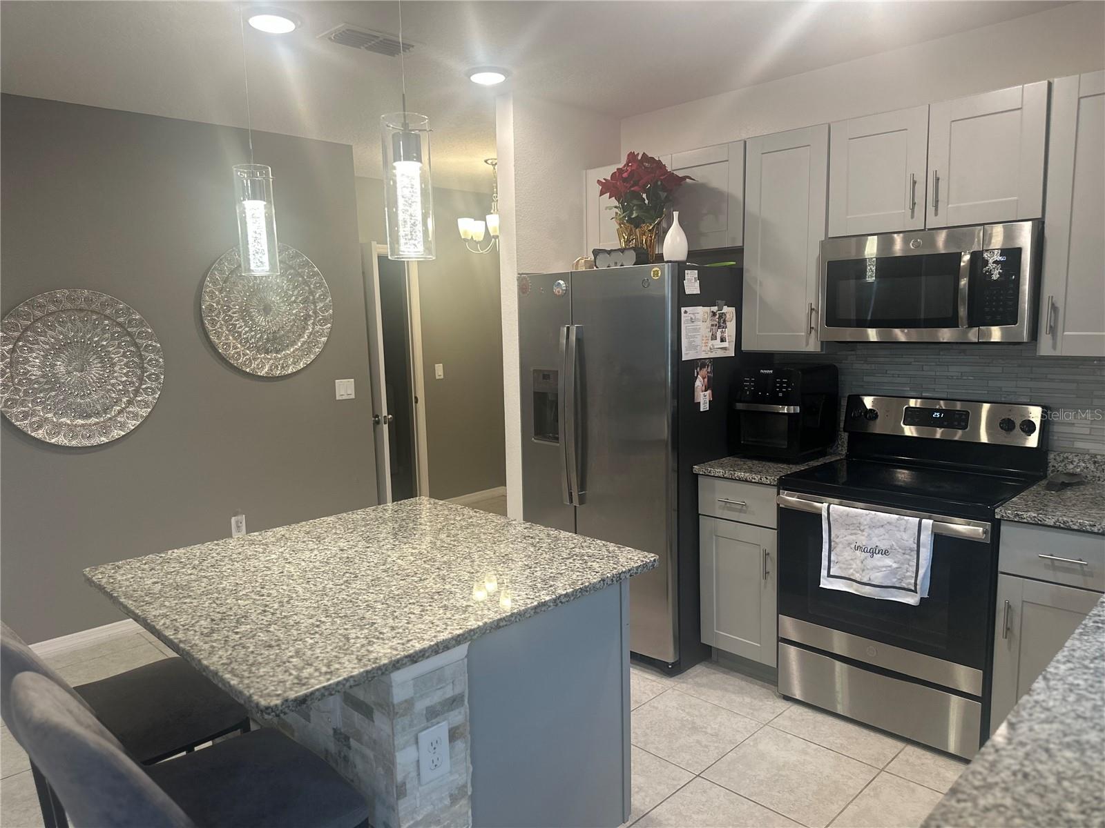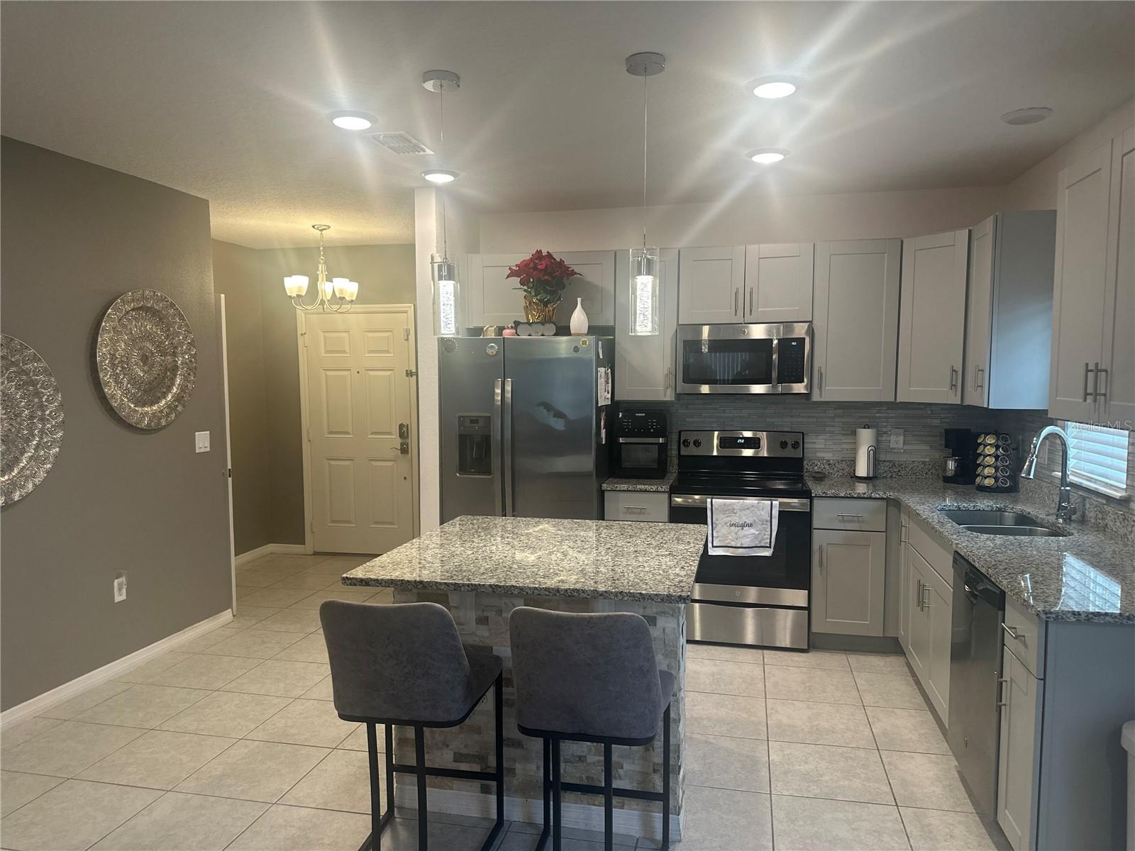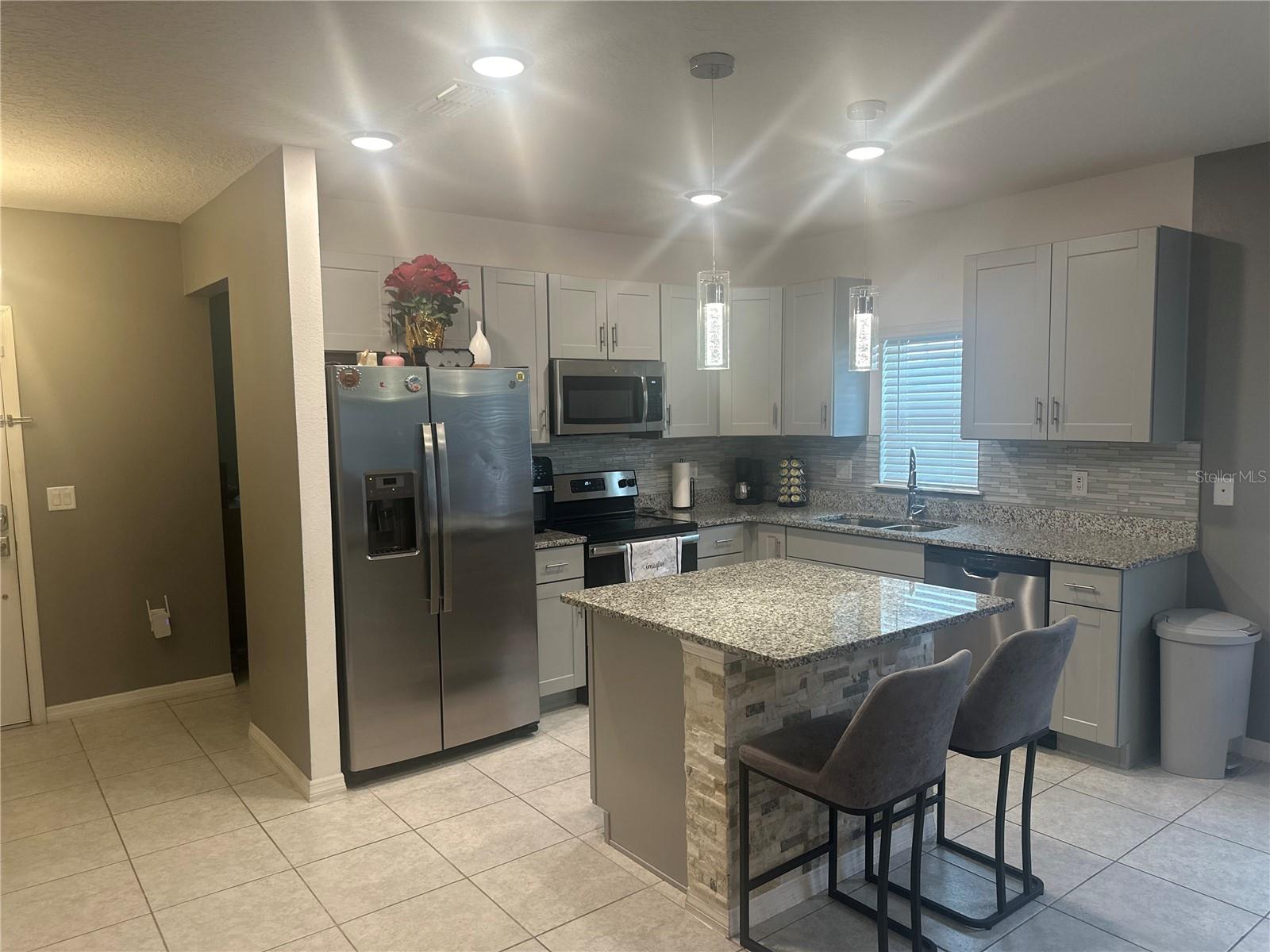 Welcome to this beautiful 3-bedroom, 2-bathroom home in the peaceful city of Poinciana, Florida. Built in 2020, this home features an inviting open-concept layout with tile flooring throughout—no carpet here, making for easy maintenance and a clean, modern feel. The updated kitchen is a highlight, offering stainless steel appliances and a convenient kitchen island with seating for two, perfect for casual meals or entertaining guests. The spacious living area flows seamlessly into the dining and kitchen spaces, creating an ideal environment for family gatherings or quiet relaxation. Step outside to enjoy the fully fenced-in yard, featuring new vinyl fencing, offering privacy and a safe space for pets or outdoor activities. For those who love nature, this home is ideally located near Sherwood Stokes Preserve, as well as the Lake Marion Trail Head and Snell Creek Trail Head, perfect for hiking, biking, and exploring the great outdoors. Golf enthusiasts will appreciate the proximity to Stonegate Golf Club at Solivita, and for family fun, Legoland is just a short drive away. This home is perfect for anyone looking for peace and tranquility with easy access to nature and local attractions. Don’t miss your chance to own this lovely Poinciana gem!