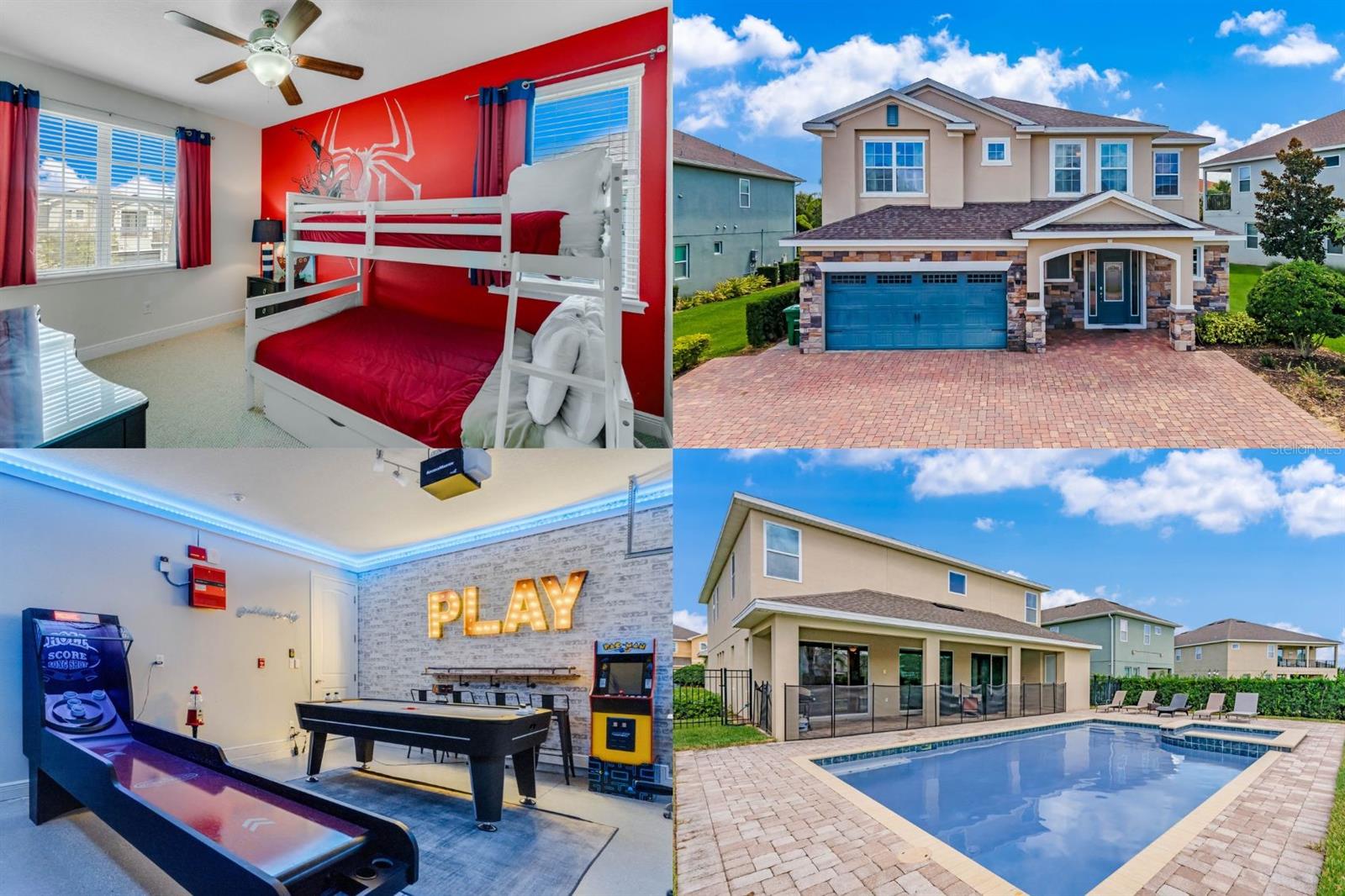 VACATION in STYLE in this turnkey, FULLY FURNISHED property, with 9 bedrooms, 8.5 bathrooms and SLEEPS 16+! This is a great INVESTMENT OPPORTUNITY! GROSS RENTS HAVE BEEN $100k+ for the past 2 years. Whether hosting family get-togethers, reunions, high holidays, or business retreats, this home provides all the space guests need to spread out! The open concept living area features a large dining area, plenty of seating, and great views of the pool. You'll be seeing double with two refrigerators, two dishwashers, and an oversized island to gather around. The pool area is the perfect place to enjoy the Florida sun while still being very private with an oversized lot, fence and hedges all around. The downstairs master retreat is spacious and offers access to the pool and its own private bathroom. The garage has been turned into a game room with Pacman, air hockey, foosball, and skee ball. Upstairs you will find a loft with a pool table and TV. Seven more bedrooms provide plenty of room for guests. The Encore at Reunion Resort includes a spectacular clubhouse, award-winning restaurant, a Water Park, full-service spa, two playgrounds, state-of-the-art gym, basketball, volleyball & tennis courts. The HOA fee covers 24-hour gated entrances & roaming security, trash pickup, & an annual exterior house cleaning. A concierge desk is available at the clubhouse to assist with booking tickets, meals, airline check ins, resort provided shuttles to parks, & more. Enjoy being minutes away from three golf courses and in the heart of attractions, shopping, dining and more. Call us today to schedule your private tour!