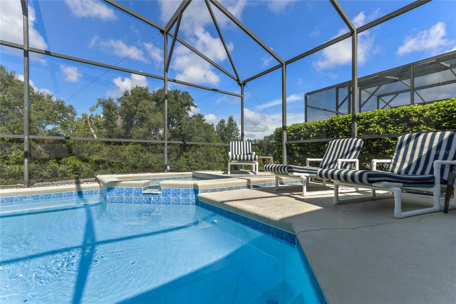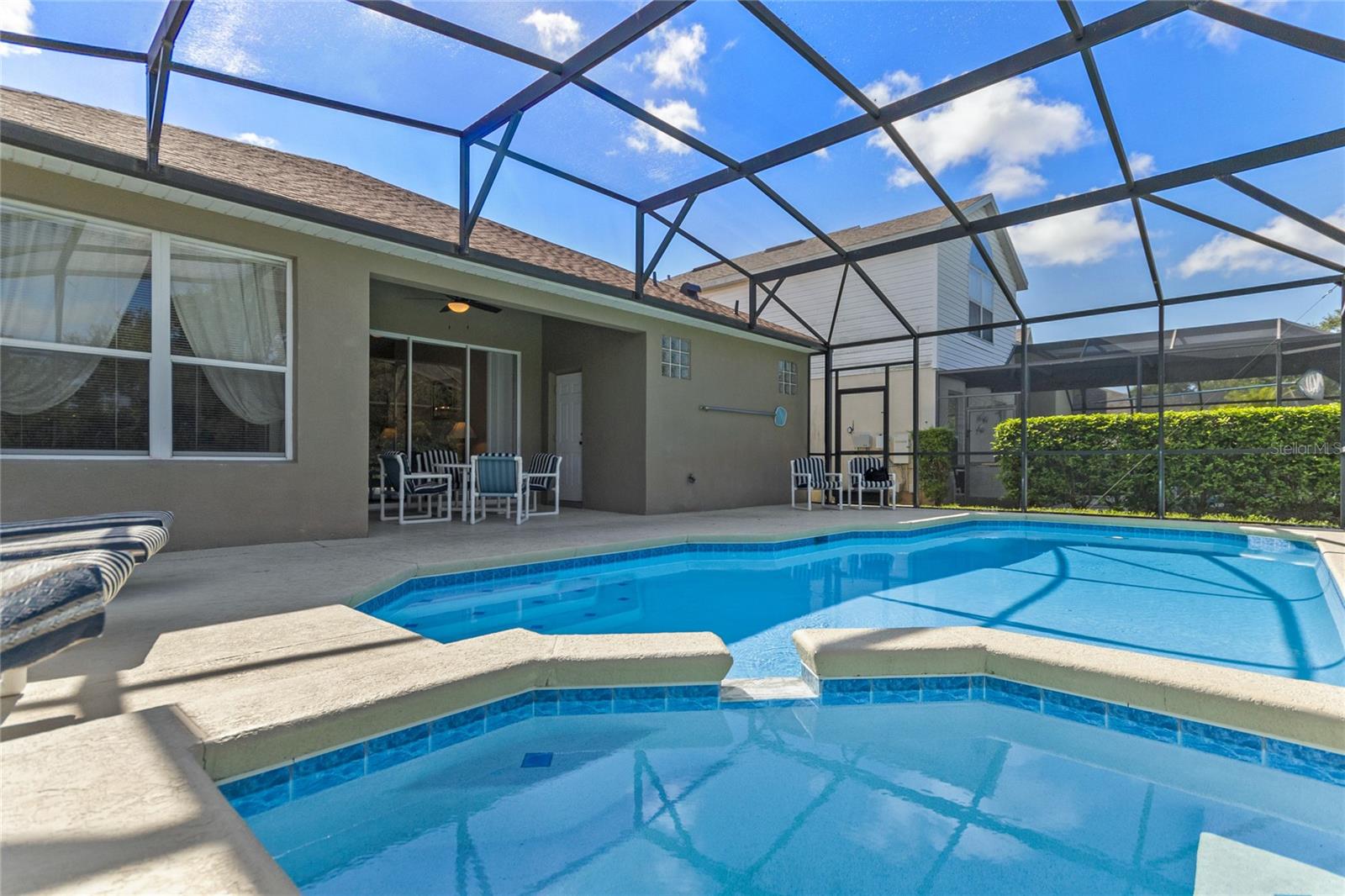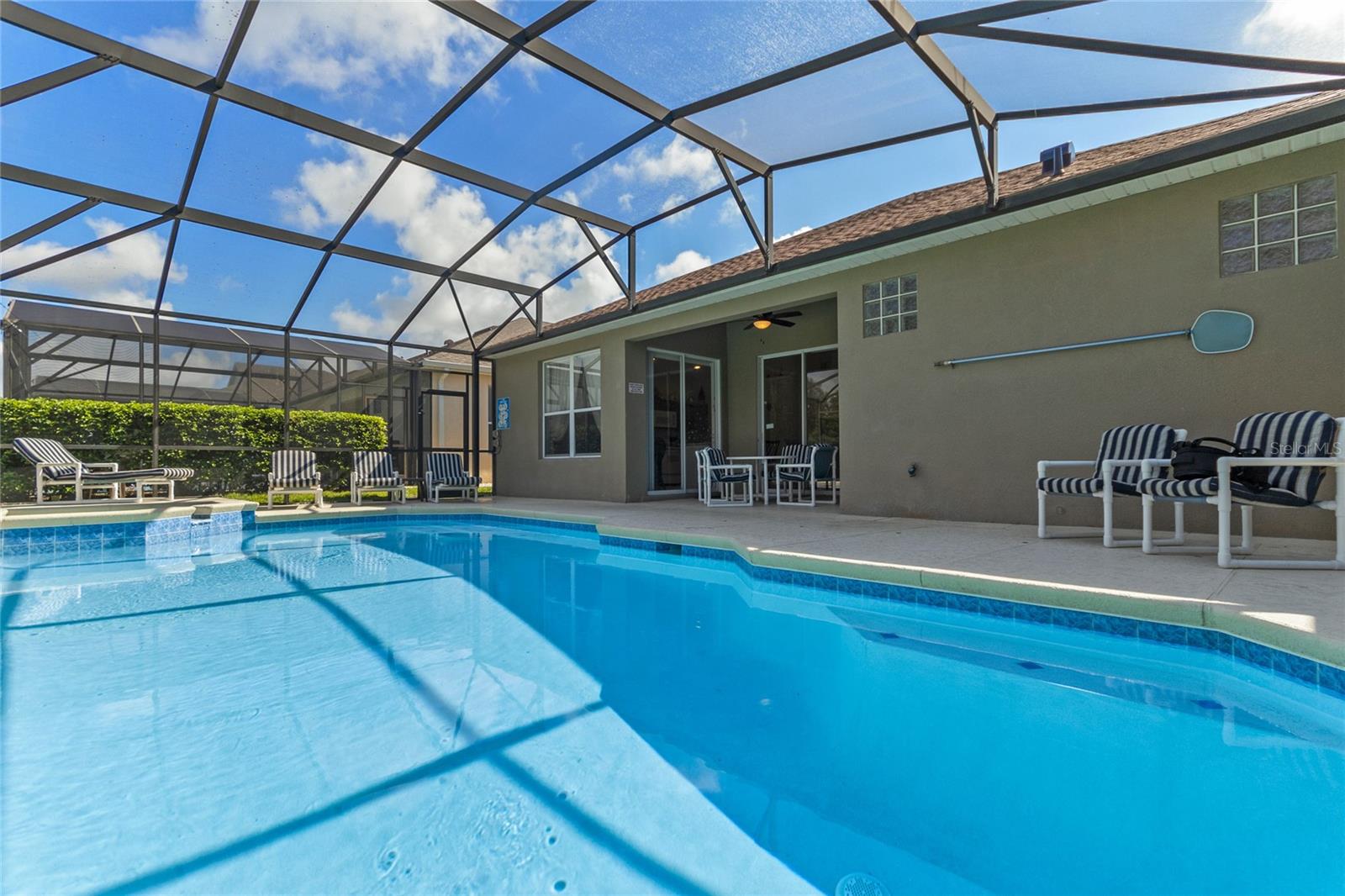 CONSERVATION VIEW TO THE REAR. NEW ROOF 2023. SALT WATER POOL/SPA. Here is a rare opportunity to purchase one of the few homes on Windsor Palms Resort that backs onto conservation land. Enjoy your morning coffee or evening meals outside while taking in the fantastic view and you might get lucky as the seller's have numerous times and see some wildlife walking by. For the sun loving vacationers, the pool and spa area enjoy the sun all day long. This well maintained 4 bedroom/3 bathroom single story home has a proven track record as an investment property. Some of the more recent upgrades include new dryer, new dishwasher, resurfaced swimming pool and spa, new kitchen cabinet doors, new kitchen countertops and new bedroom furniture. Both the primary bedroom and the second bedroom have ensuite bathrooms while the two twin bedrooms share the guest bathroom. The games room contains an eight foot slate bed pool table and table foosball for everyone's enjoyment when taking time away from the pool or nearby theme parks. Windsor Palms Resort is a gated community located close to all the theme parks in the area and onsite recreational facilities include a clubhouse with games room, movie theatre, sundry shop and fitness center. Also available in the clubhouse vicinity are tennis courts, basketball courts, a volleyball court, playground and BBQ area. The A/C was replaced in 2016. This one won't last long so schedule your private showing today.