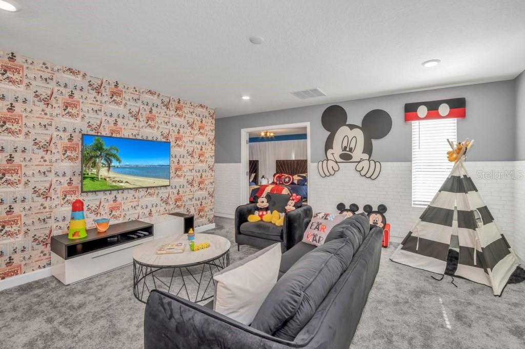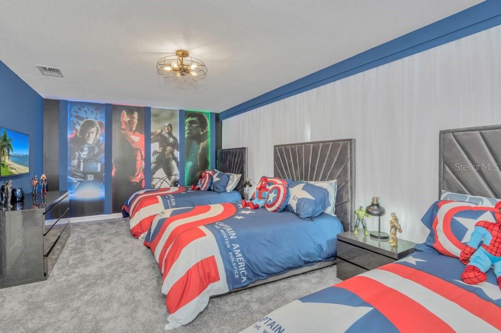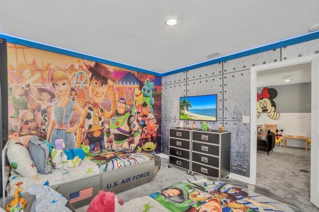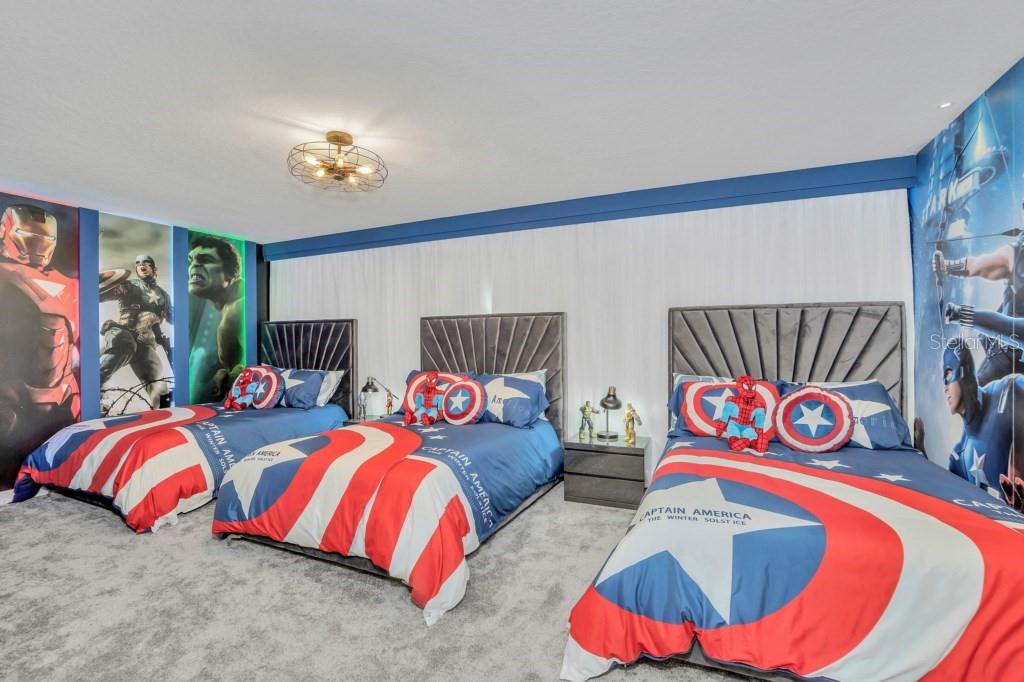 Beautiful Single Family with private pool & spa located at Storey Lake. There are 9 bedrooms, 5 Full bathrooms and a private pool. You'll love the open layout and generous room sizes throughout, amazing outdoor vacation experience to guests and owners alike. This property was beautifully decorated by famous designer Juliana Fernandes (JujuDiCasa) and there are multiple themed bedrooms (Toy story, avengers and beauty and the beast) make this property the perfect place for an unforgettable stay. Storey Lake offers family friendly, resort style amenities that everyone will enjoy including basketballs courts, a clubhouse, a playground, a resort style pool, water park, and fitness center. This home is the perfect choice and centrally located near many award-winning restaurants, a plethora of shopping options, theme parks, and easy access to major highways that make driving to either coast a breeze!
