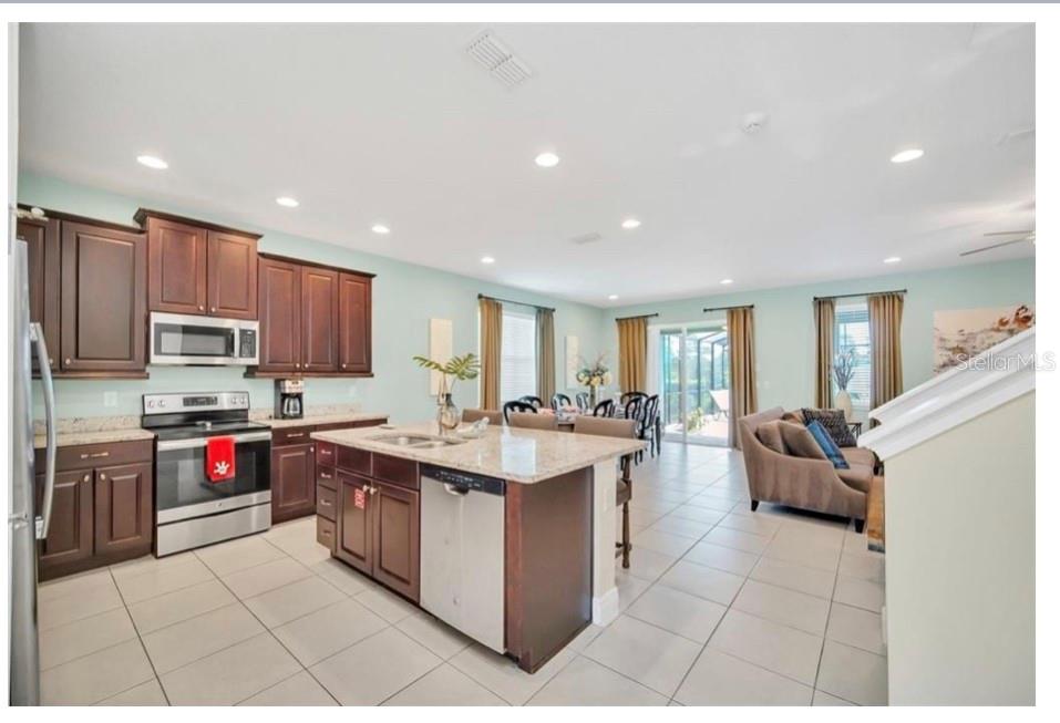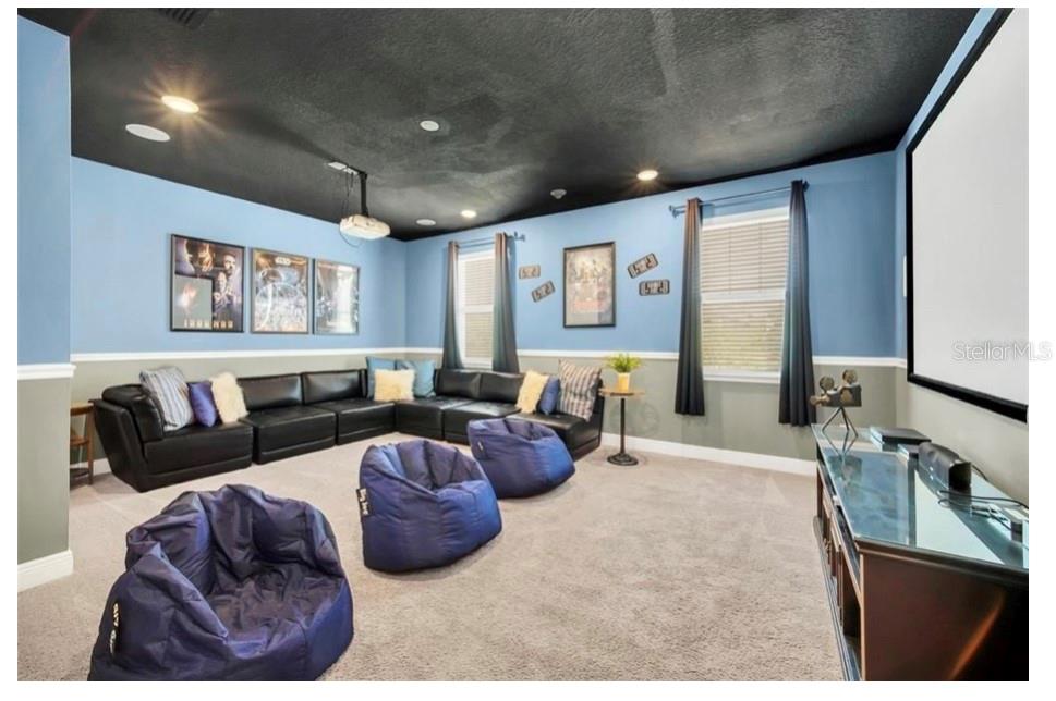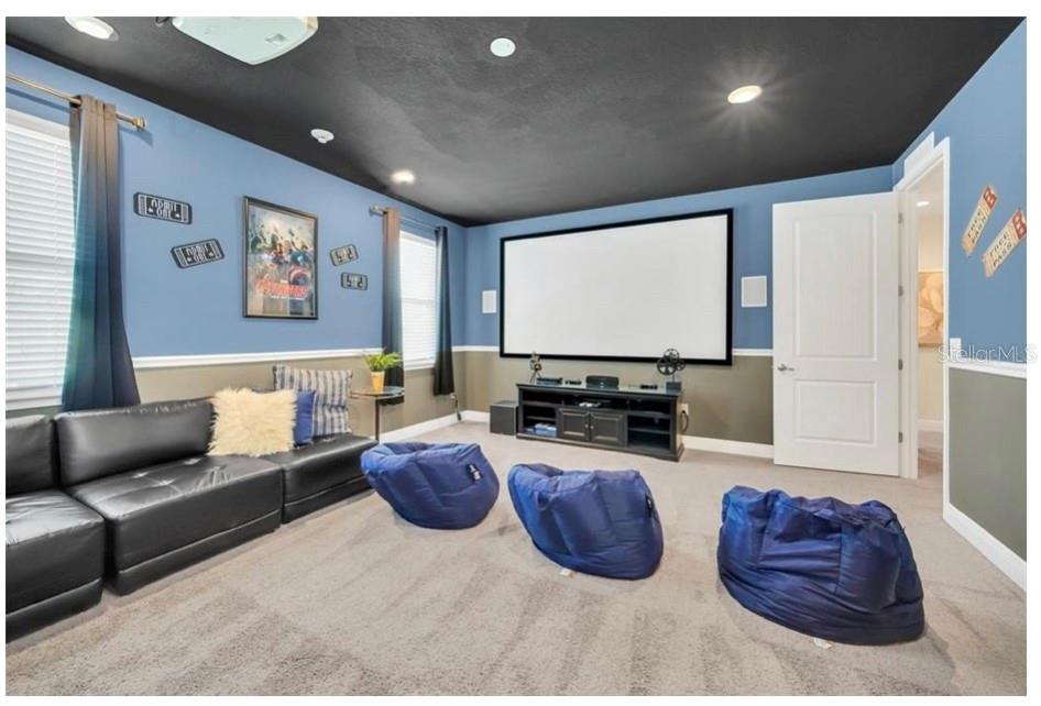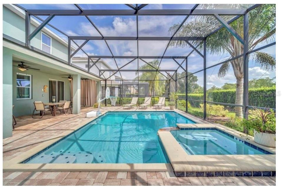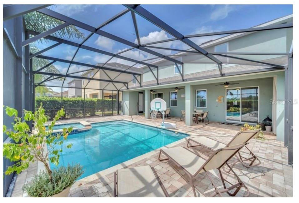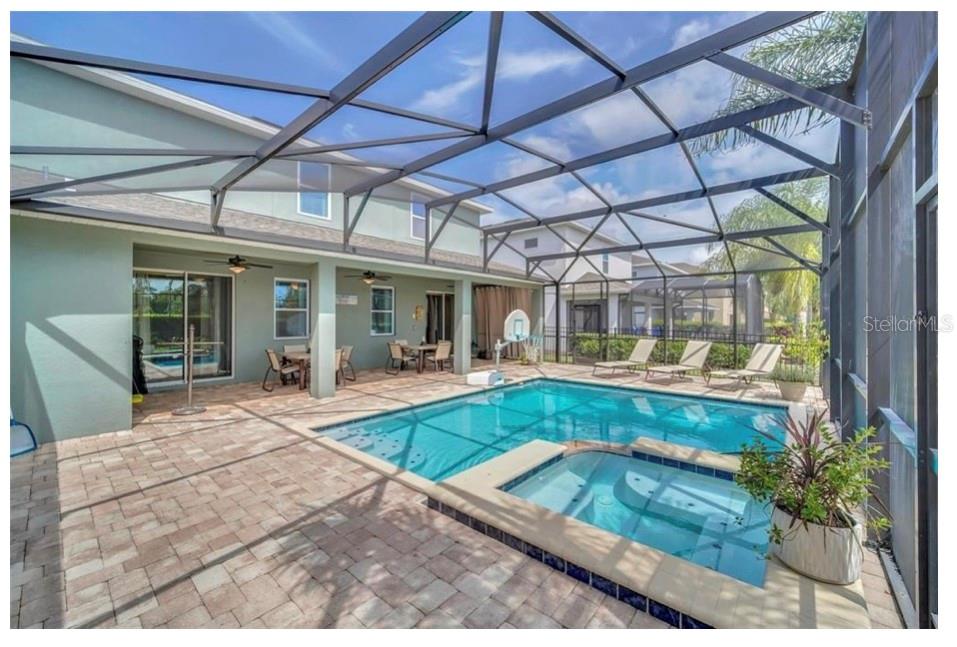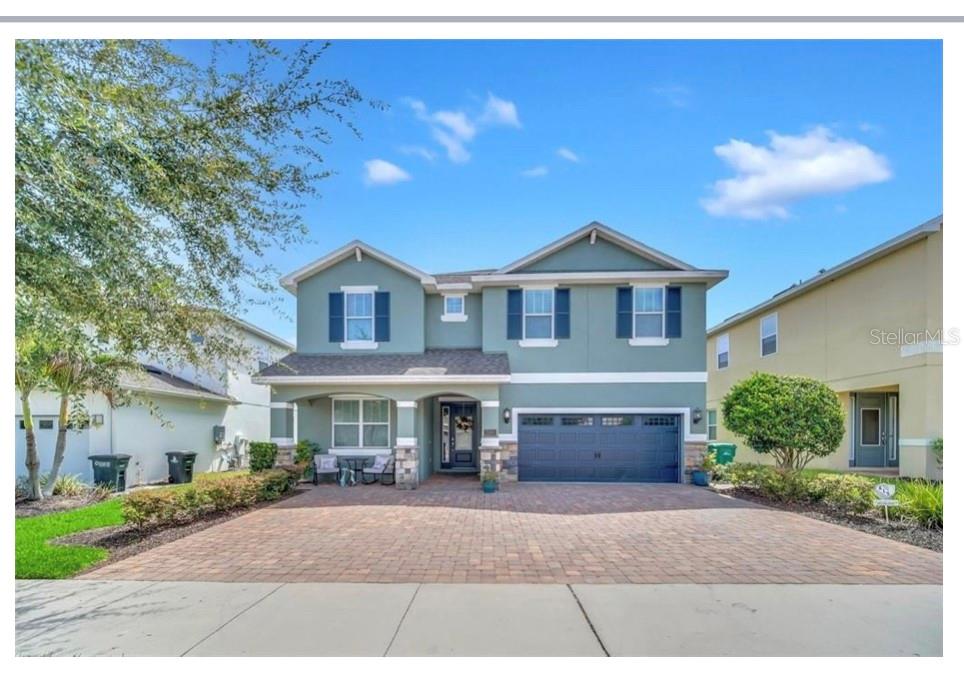 This exquisite two-story residence is situated in the exceptional Encore at Reunion Resort community. Fully furnished with impeccable taste, this home boasts 9 bedrooms (8 bedrooms and a spacious media room) and 5.5 bathrooms. Offering both elegance and privacy, the two master bedrooms are conveniently located on the first floor. Outside the great room and dining area, a covered lanai extends to a private screened-in heated pool and spa—ideal for year-round enjoyment in sunny Florida. The premium lot overlooks water with no rear neighbors. The kitchen is equipped for entertaining, featuring stainless steel appliances and a well-designed layout for the chef. Upstairs, a secondary living space and a sizable media room, perfect for movies, complement 6 additional themed bedrooms. The open floor plan is ideal for large family gatherings and guest enjoyment. The Encore Club, a private luxury resort community, is situated in a prime location with luxury homes and fantastic amenities. Just minutes from highway 192, the I-4, and toll road 429, this location allows for quick commuting to Orlando's renowned theme parks, outlet shopping, fine dining, and cultural attractions. Encore Club at Reunion Homes provides an exclusive club with amenities for an incredible vacation lifestyle and family-friendly atmosphere. These properties are suitable as primary residences, investments, or vacation homes. Community amenities include swimming pools, a water park with water slides and a lazy river, poolside service, a 24-hour front desk, on-site parks and attractions, digital concierge service, complimentary theme park shuttle service, and activities and grocery delivery. Don't miss the opportunity to make this home yours before it's too late!
