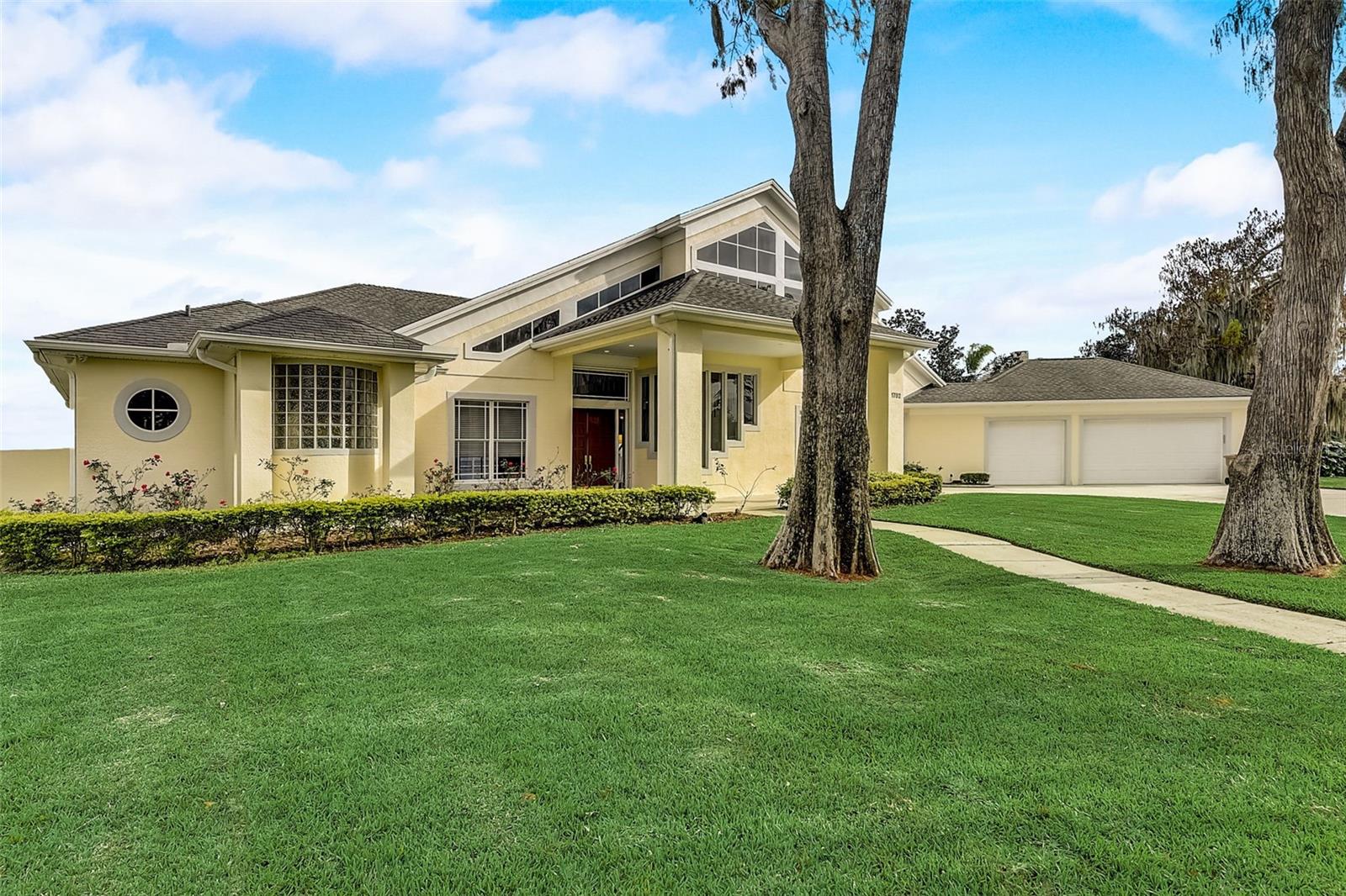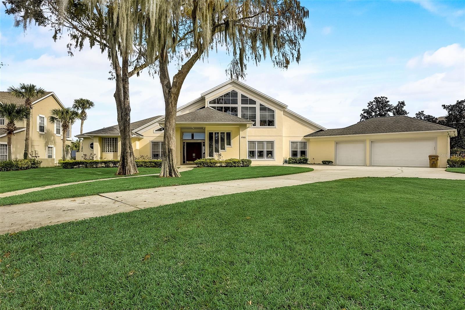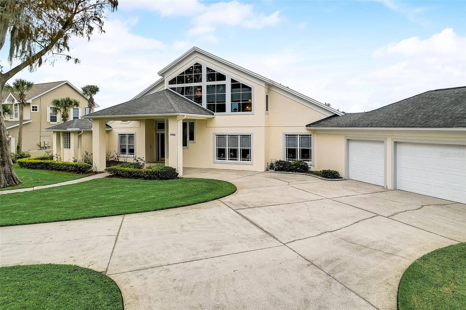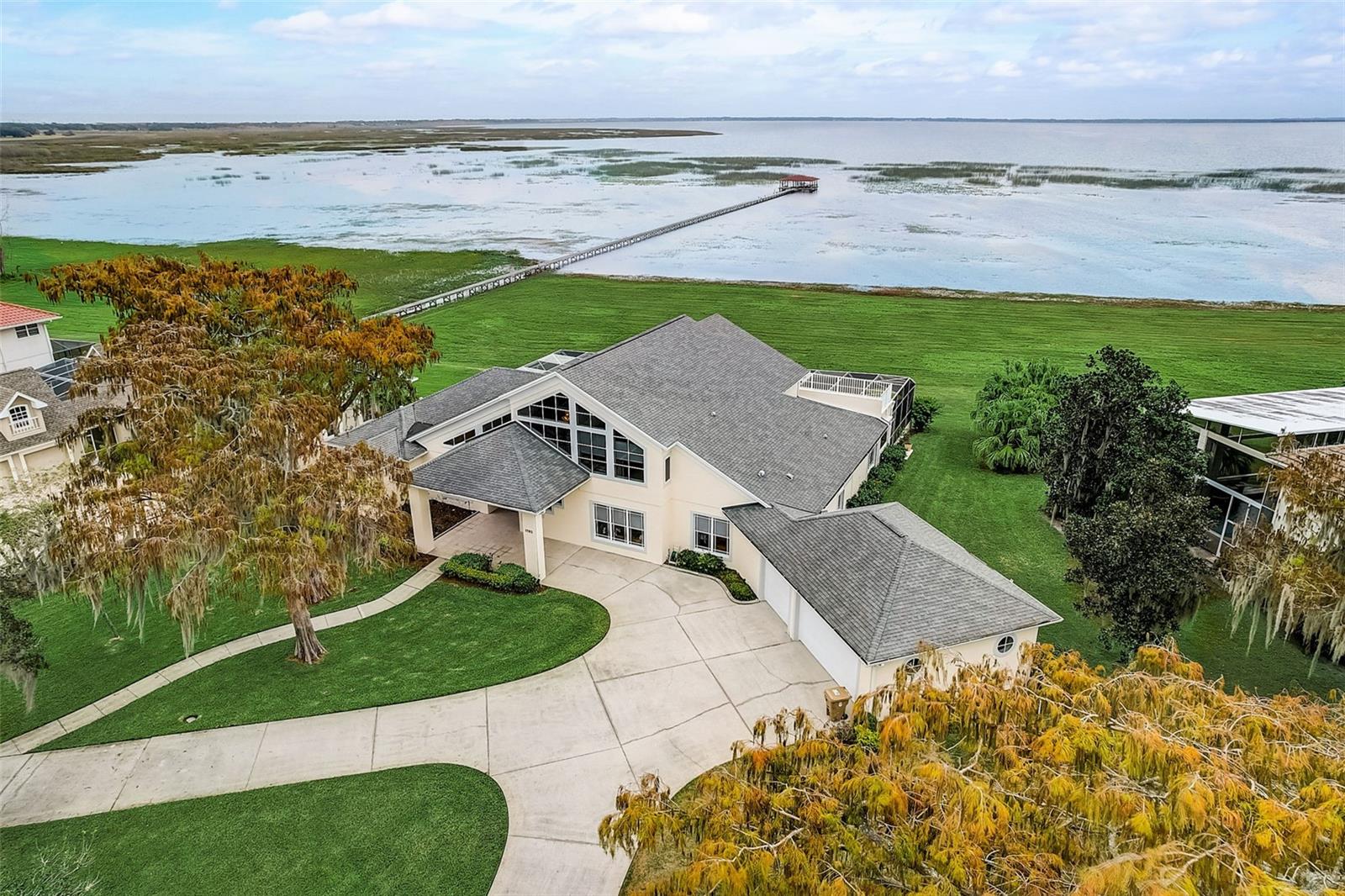 Welcome to luxury living at its finest! Presenting a stunning 5-bedroom designer manor, this contemporary masterpiece boasts over 5,000 square feet of modern elegance situated on a sprawling .73-acre lakefront lot in the highly sought-after gated community of Kissimmee Bay Golf and Country Club. As you approach this majestic residence by its circular driveway, you are greeted by the grand entrance, adorned with a mahogany door, open to reveal a soaring double-height foyer, a neutral color scheme and elegant windows showcasing the lake, mature foliage and breathtaking sunrises. Step inside, and you'll find a seamless open floor plan enhanced with exquisite tile flooring. The modern kitchen features an abundance of storage cabinets and closets. The expansive living spaces include 5 bedrooms, 3.5 bathrooms, 2 offices, as well as living and dining areas, providing versatility for various lifestyle. The allure of this home extends beyond its interiors to the covered enclosed outdoor lanai. Here, you'll discover a summer kitchen equipped with a dishwasher, refrigerator, sink, and a new Synergy wood ceiling – perfect for entertaining guests or enjoying quiet evenings by the pool. The pool area is a haven of relaxation, complemented by views of the bass-filled East Lake Toho. For added convenience and peace of mind, this technologically advanced property features a generator for the complete downstairs, a safe room used as a master closet, and 3 newer air conditioner units. A central vac system, 360 degrees surveillance cameras, electronic remote storm shutters, and 2 electronic lanai awnings contribute to the home's modern amenities. The 3-car side entry garage provides ample space for all your vehicles and showcases tiled flooring along with ceiling to floor built-in cabinets. Kissimmee Bay Golf and Country Club offers resort-style living with a community boat ramp, boat and RV storage, tennis courts, pickleball, basketball, a playground, a golf course, and a clubhouse with a restaurant. Additionally, the location is unbeatable – just minutes away from the Orlando International Airport, Disney World, medical facilities, shopping and dining. This location affords easy access to major highways, including the Florida Turnpike, 417, and the 528. The recent addition of the Brightline train allows seamless connectivity to the best of Florida. Make this exquisite lakefront residence in Kissimmee Bay your new home!