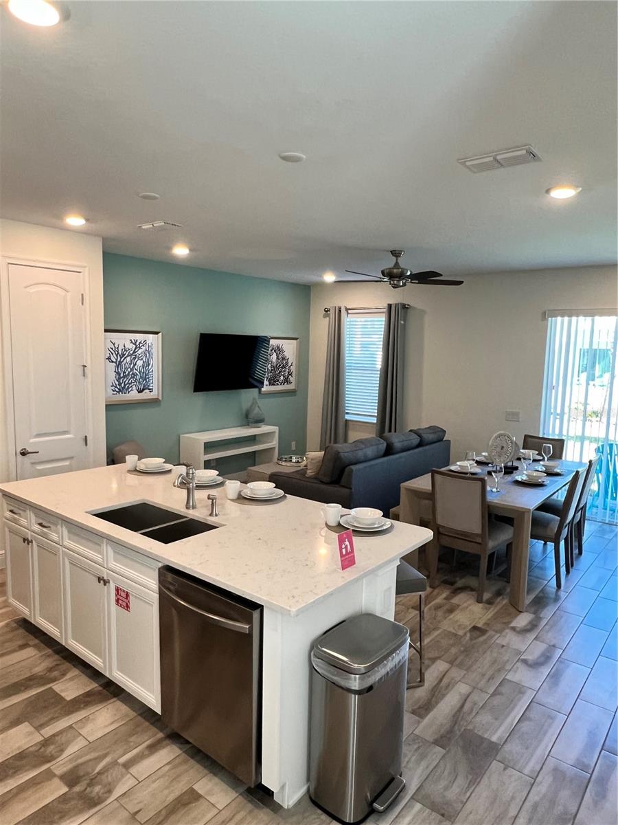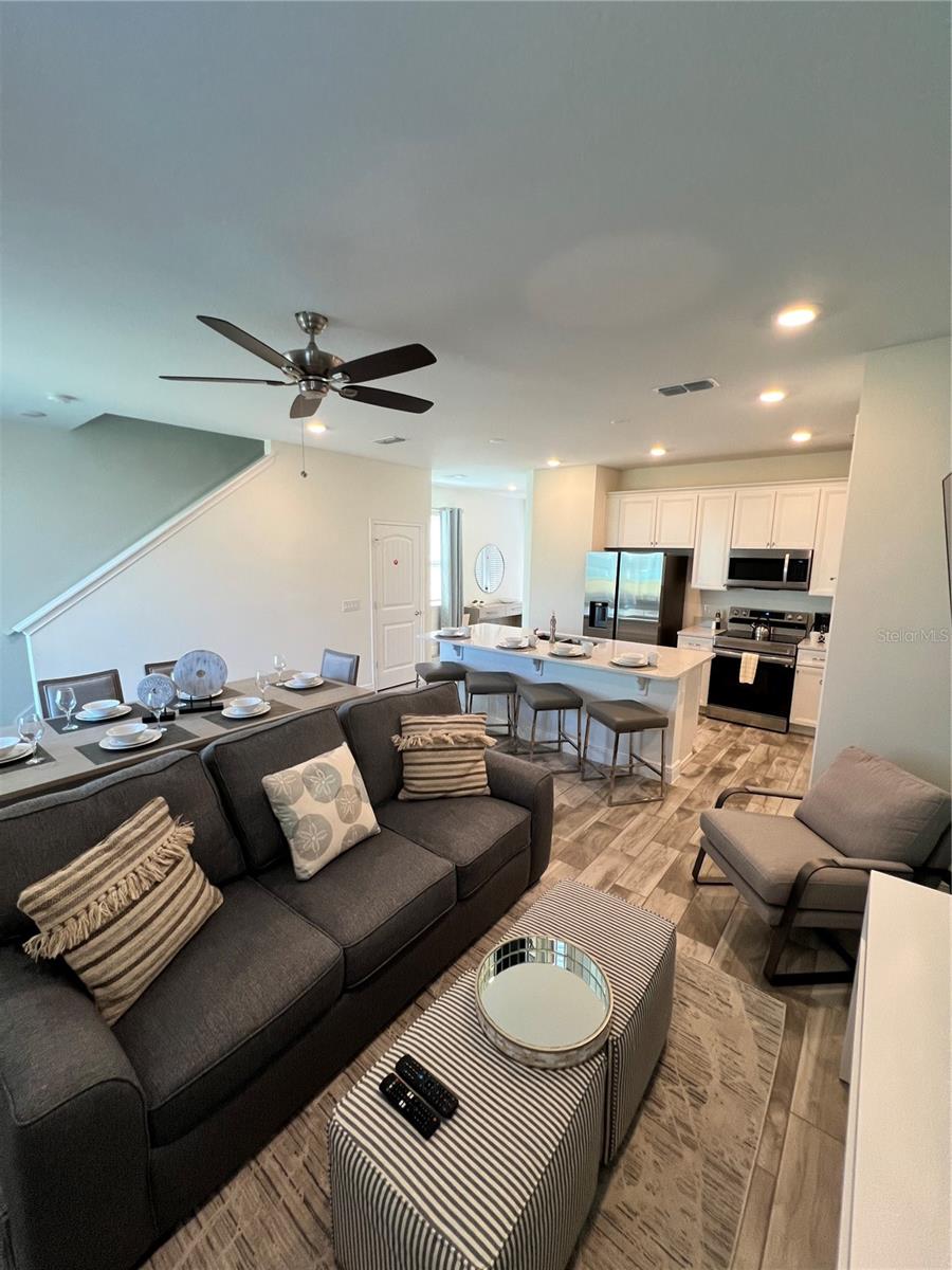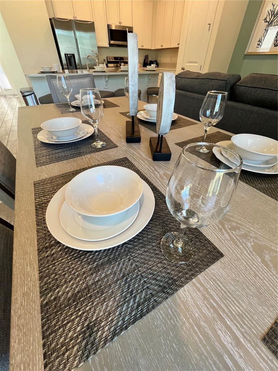 Indulge in the epitome of Caribbean-style resort living within this stunning 4-bedroom, 3-bath villa. Positioned as a corner unit, it provides an exclusive retreat for those desiring enhanced privacy. The well-thought-out floor plan of the villa creates a spacious living and dining area, fostering a serene and tranquil ambiance. The modern kitchen is equipped with top-of-the-line Samsung appliances, elevating both convenience and luxury. The inclusion of a Samsung Washer and Dryer adds further convenience. Immerse yourself in the charm of this Key West-inspired community, where access to all four pools is just moments away from the enchantment of the Disney Parks. Whether you're contemplating short-term rentals or year-round living, this villa boasts a plethora of amenities. From multiple pools and a hot tub to a comprehensive spa, gym, and a variety of dining, entertainment, and shopping options, the villa caters to diverse lifestyles. Don't let this golden opportunity slip away—seize the chance to own this fresh and inviting villa in Margaritaville and embark on your resort-inspired lifestyle today. Additionally, included in the list price is the MargaritaVille Approved City Furniture/Housewares Package, encompassing everything from blinds, drapes, and TVs to artwork, kitchen necessities, dishware, linens, and much more for your comfort.