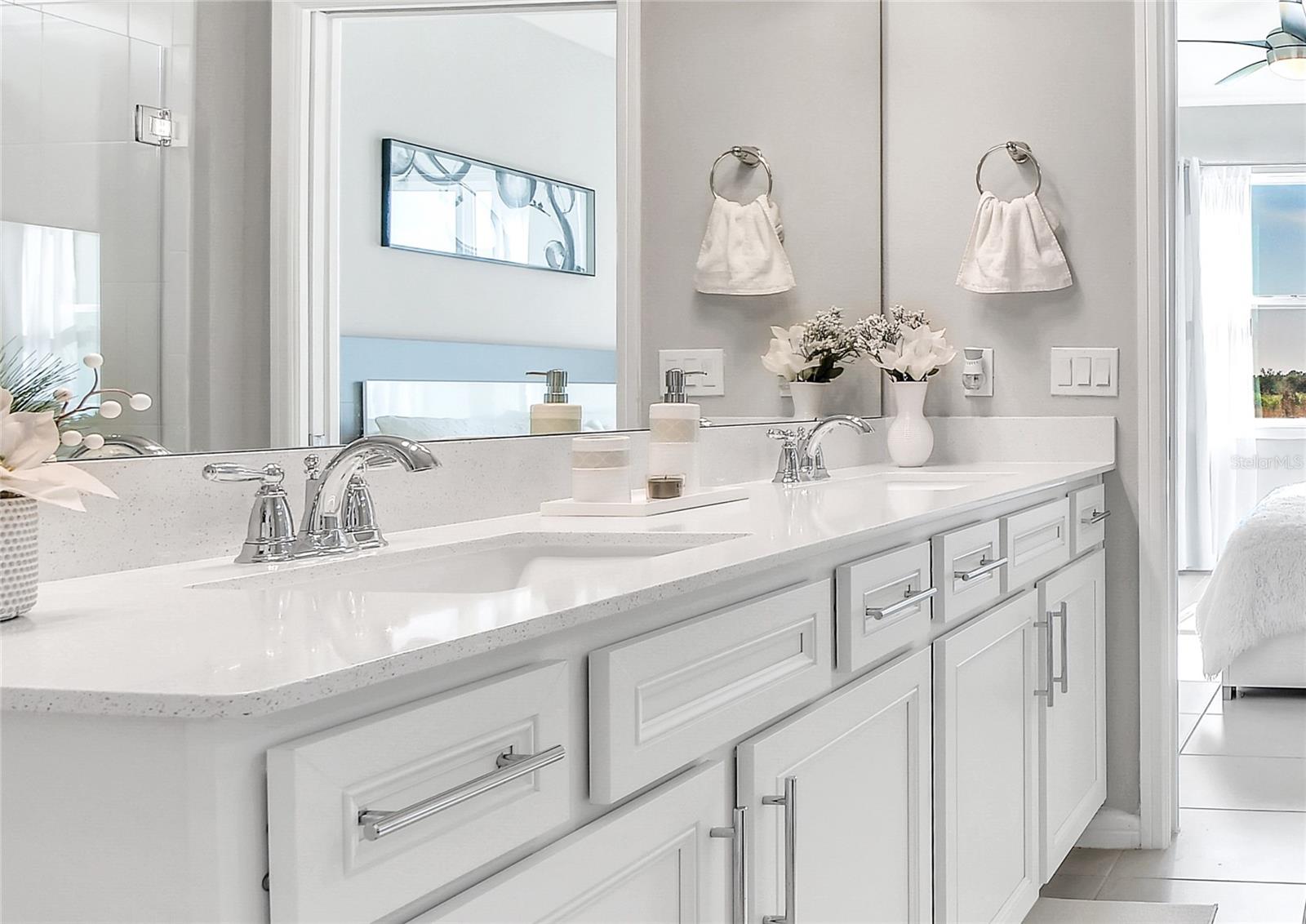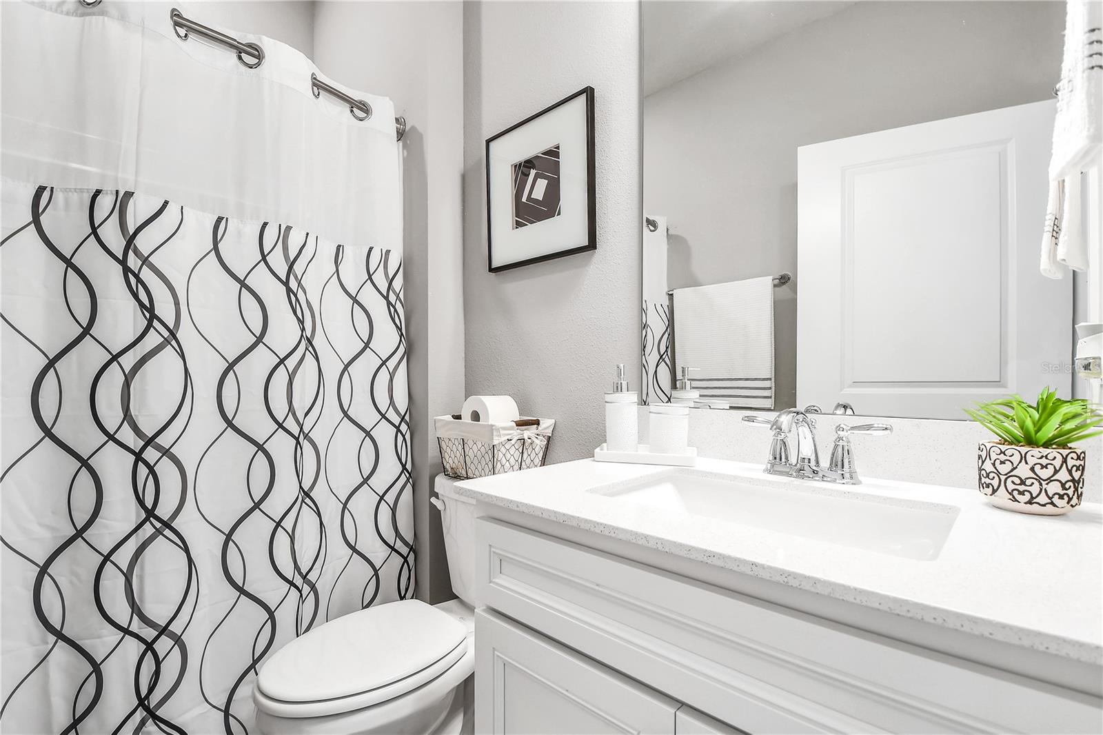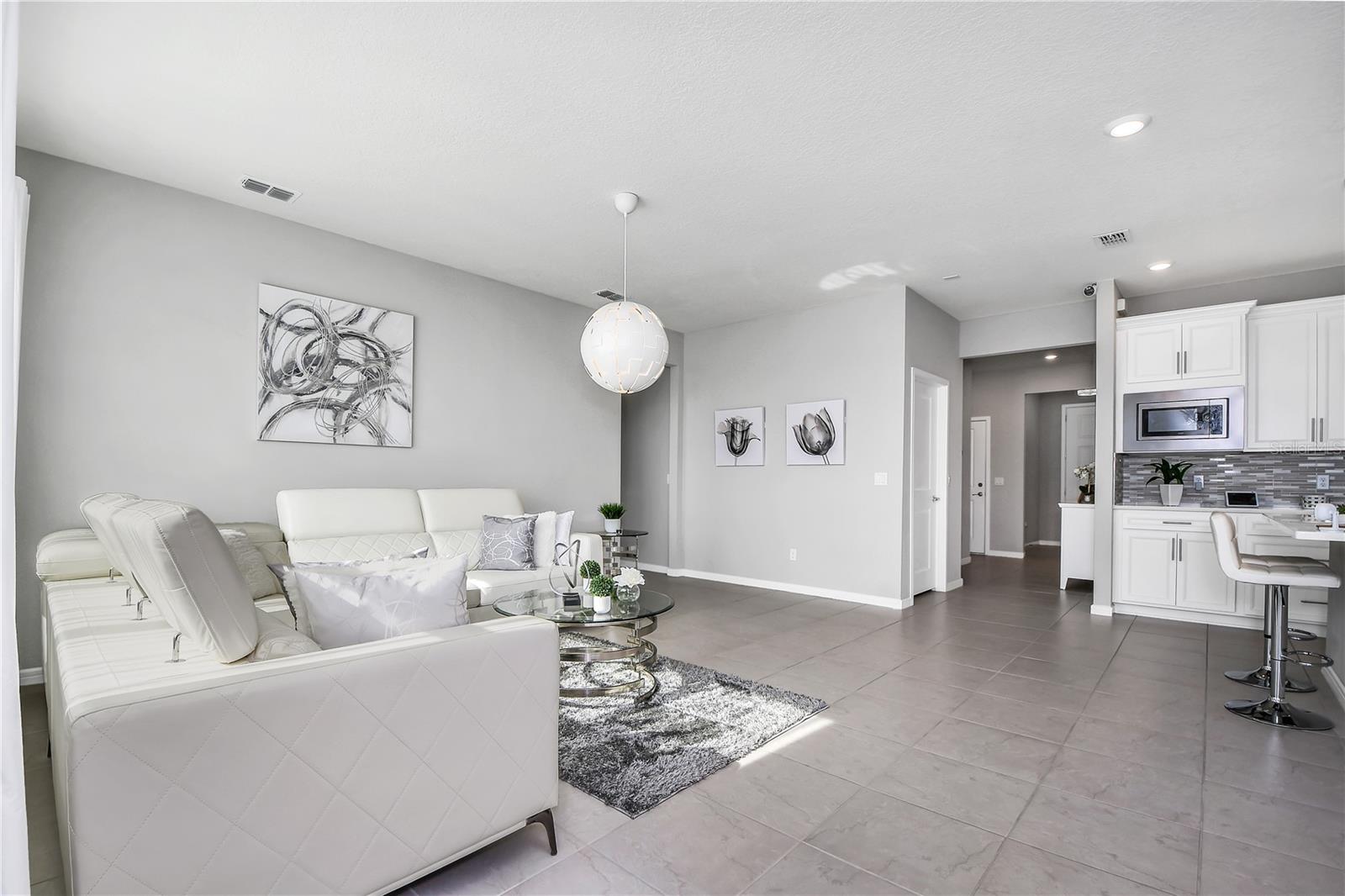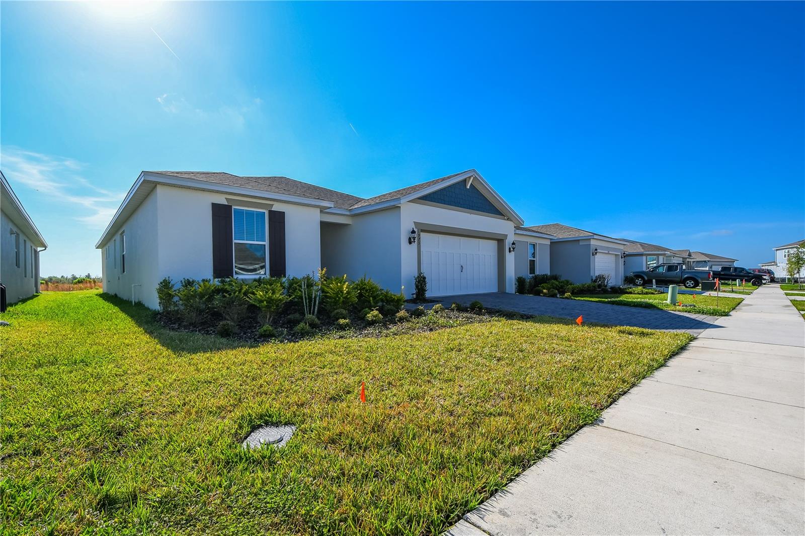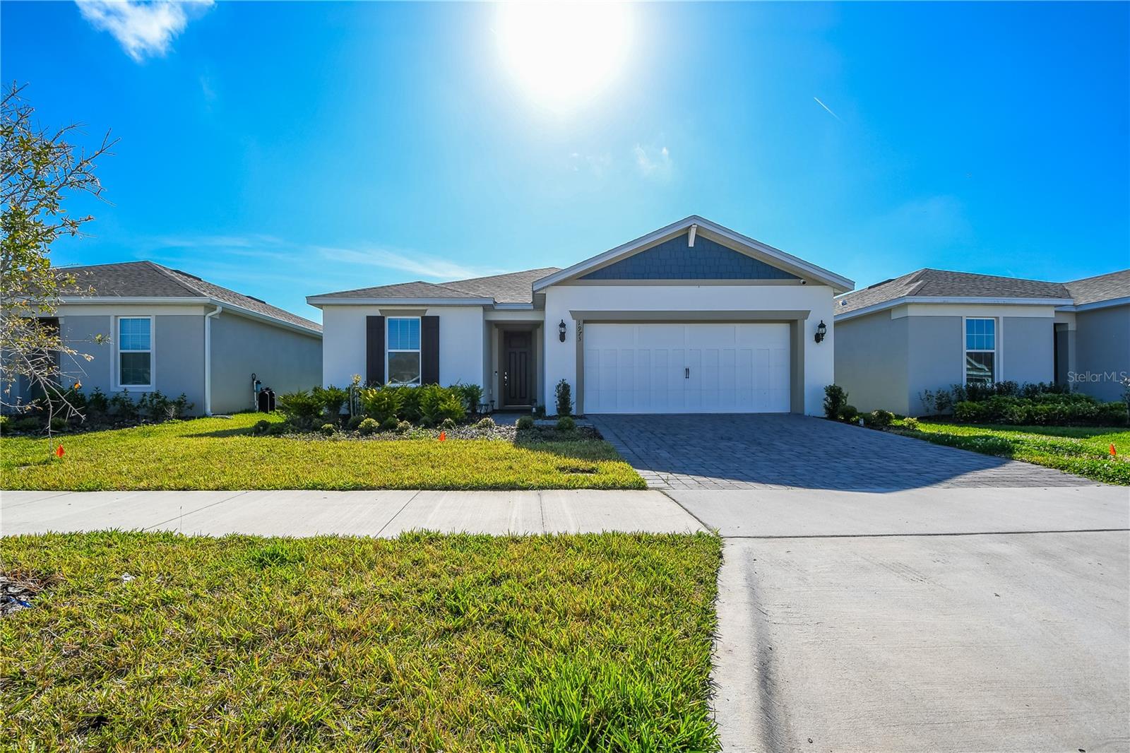 This beautiful home design is a single-story layout with an open plan, split bedrooms, and a spacious kitchen with plenty of storage. This new construction home features a Craftsman exterior, 3 bedrooms, 2 bathrooms, a large entertaining area, covered lanai, and a 2-car garage. The well-integrated kitchen, dining area, and gathering room lead to the covered lanai for easy indoor and outdoor entertaining. The kitchen includes a large island, walk-in pantry, white cabinets, quartz countertops, and pendant lighting. The Owner’s Suite has a private bathroom with dual sinks, a walk-in shower, and a walk-in closet. Additional features include guest bedrooms, a full bathroom, designer accents, and access to amenities like a pool, sports courts, and fitness center. Located in a 55+ gated neighborhood with easy access to major roadways and attractions in Orlando.