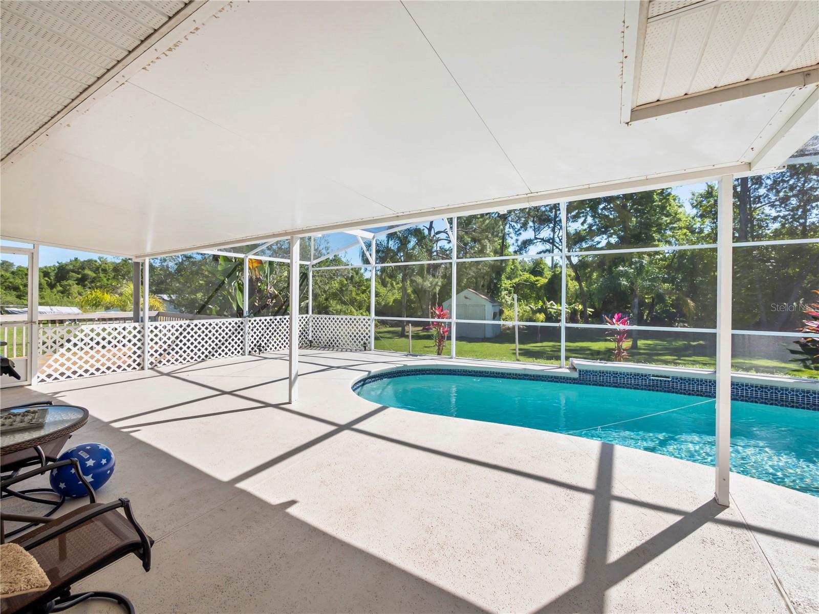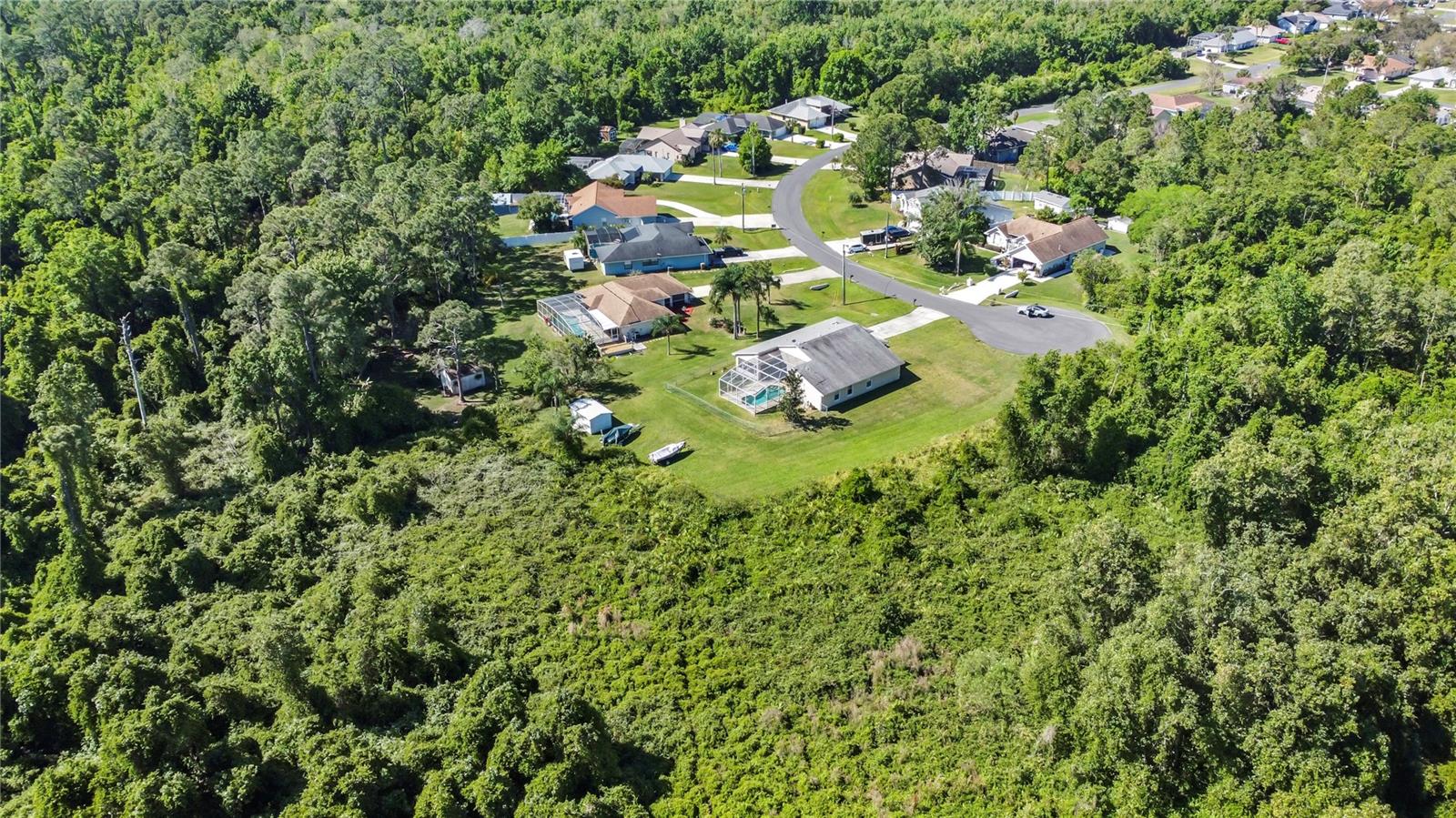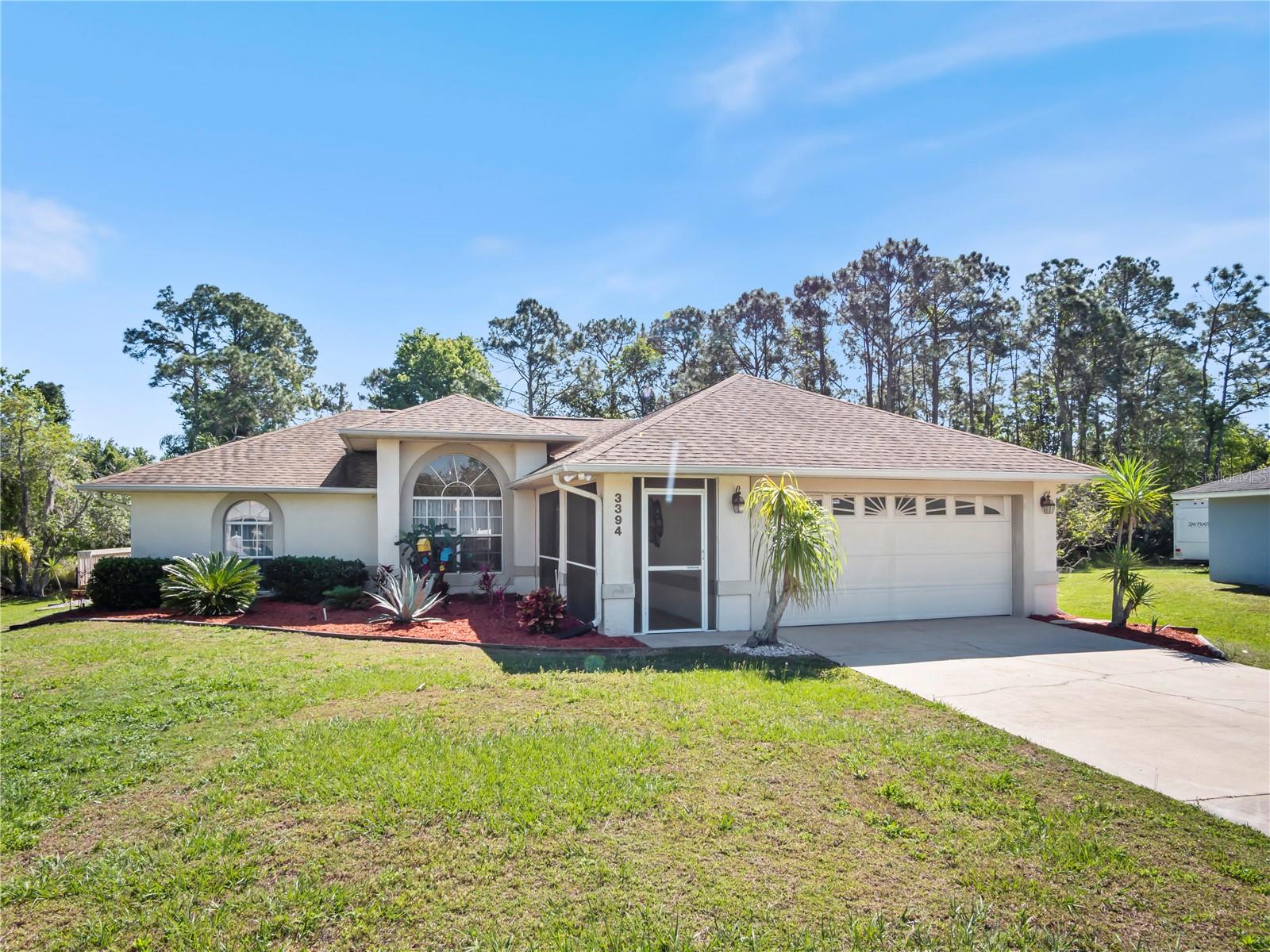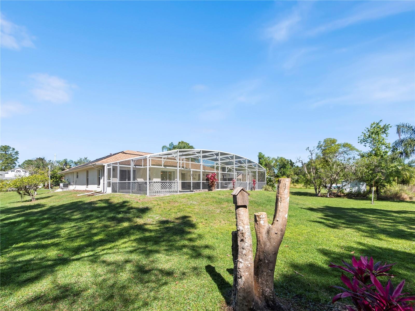BE SURE TO TAKE A LOOK AT VIRTUAL TOUR LINK 1 FOR YOUR PERSONAL WALKTHRU OF THE PROPERTY. A large, peaceful property, located at the end of a quiet cul-de-sac in the Wilderness. This cute 3 bedroom, 2 bathroom home offers privacy and space as there are no neighbors behind the property. The vault ceilings with an open concept floor plan allows you to feel connected with others in the home while being able to see the beautiful backyard from all central areas. Two of the bedrooms have sliding doors that lead to the solar heated pool as well as a pool bath. The screened in area at the pool has a large deck with sunny or shady places to sit while relaxing and overlooking the backyard. Two bedrooms and a bathroom can be separated from the rest of the house with a sliding pocket door. The spacious master bedroom has a walk-in closet and an en suite bathroom with two sinks, a shower, and a corner tub. The long driveway is wide enough to easily fit several. The air conditioner is a new unit (2024) and most of the appliances were replaced in 2023. The roof is only 8 years old. As a member of The Wilderness HOA, homeowners can take advantage of tennis/pickleball courts, a lovely screened in pavilion, beach volleyball, a little park area and a public pool. Located near shopping, restaurants, schools, churches and the Lynx bus stop. Whether you’re looking for a nice neighborhood to raise a family or a quiet place to retire in, this home has everything you need.