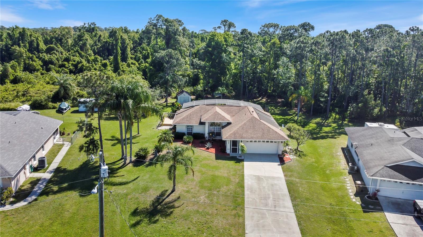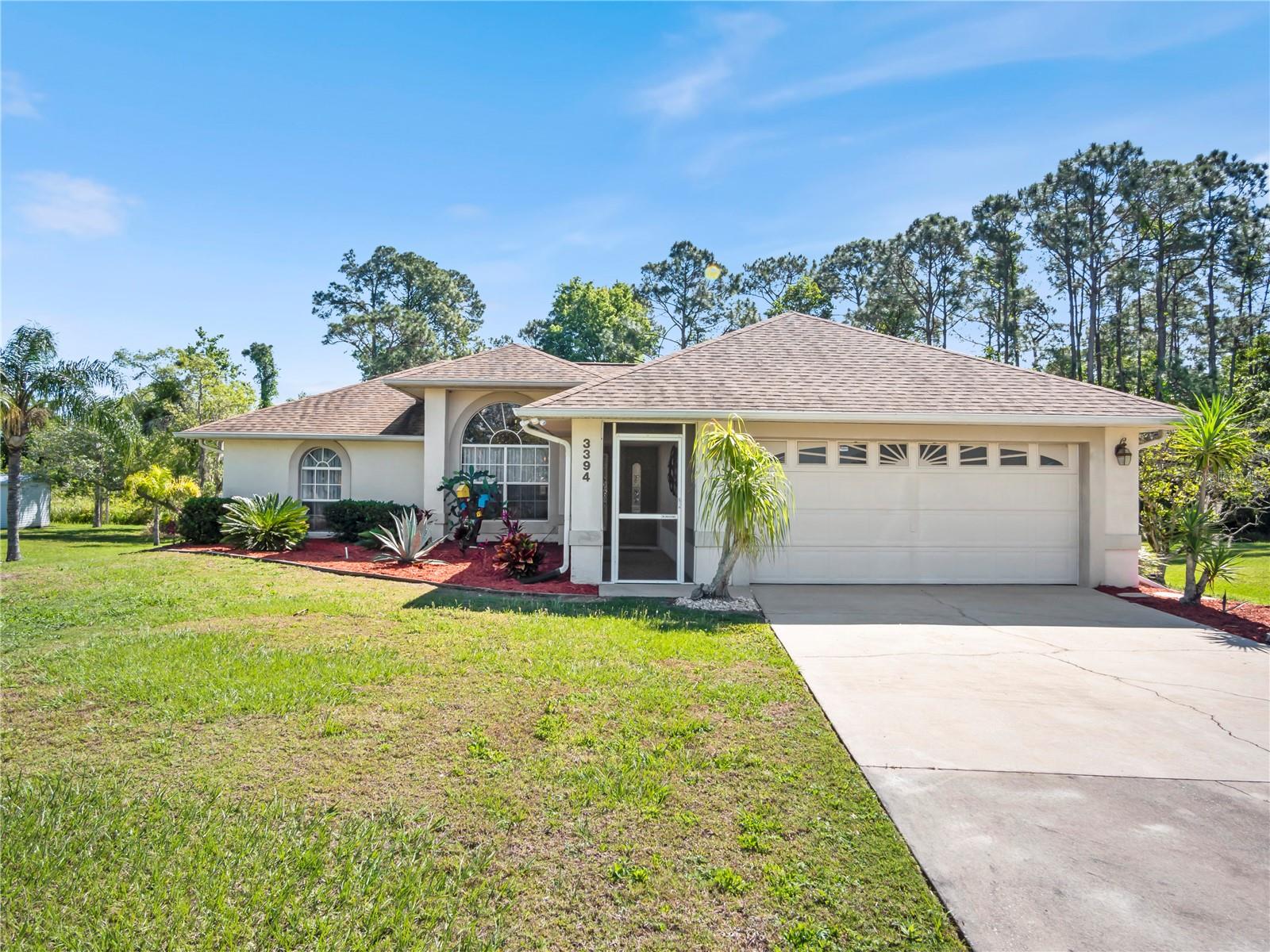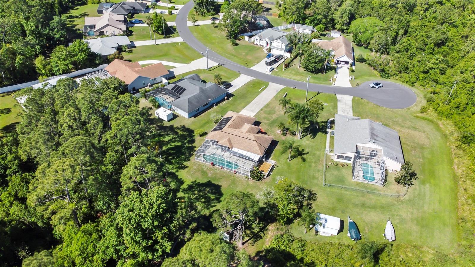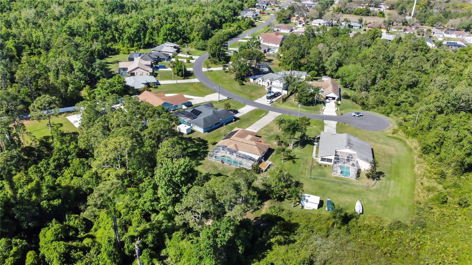 BE SURE TO TAKE A LOOK AT VIRTUAL TOUR LINK 1 FOR YOUR PERSONAL WALKTHRU OF THE PROPERTY. A large, peaceful property, located at the end of a quiet cul-de-sac in the Wilderness. This cute 3 bedroom, 2 bathroom home offers privacy and space as there are no neighbors behind the property. The vault ceilings with an open concept floor plan allows you to feel connected with others in the home while being able to see the beautiful backyard from all central areas. Two of the bedrooms have sliding doors that lead to the solar heated pool as well as a pool bath. The screened in area at the pool has a large deck with sunny or shady places to sit while relaxing and overlooking the backyard. Two bedrooms and a bathroom can be separated from the rest of the house with a sliding pocket door. The spacious master bedroom has a walk-in closet and an en suite bathroom with two sinks, a shower, and a corner tub. The long driveway is wide enough to easily fit several. The air conditioner is a new unit (2024) and most of the appliances were replaced in 2023. The roof is only 8 years old. As a member of The Wilderness HOA, homeowners can take advantage of tennis/pickleball courts, a lovely screened in pavilion, beach volleyball, a little park area and a public pool. Located near shopping, restaurants, schools, churches and the Lynx bus stop. Whether you’re looking for a nice neighborhood to raise a family or a quiet place to retire in, this home has everything you need.