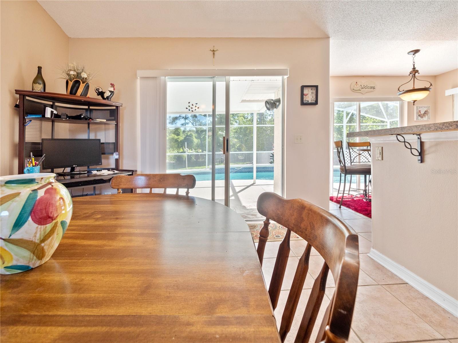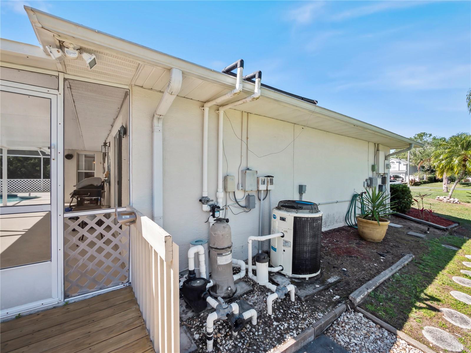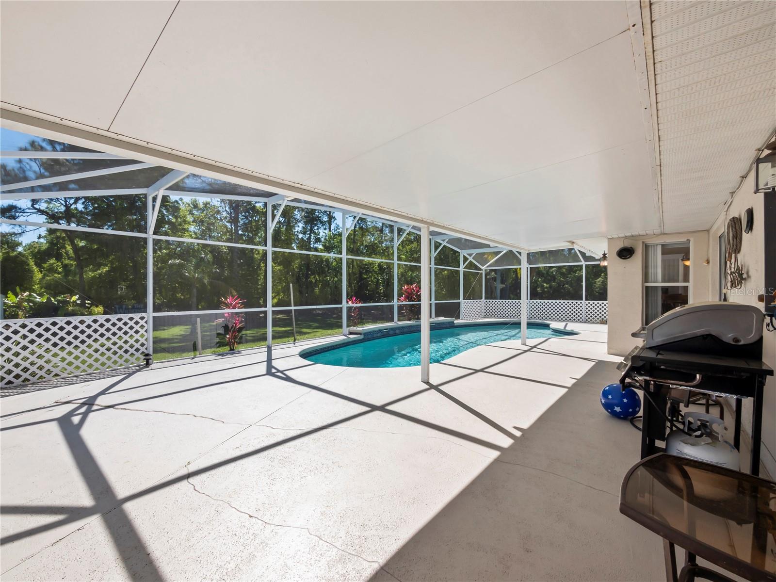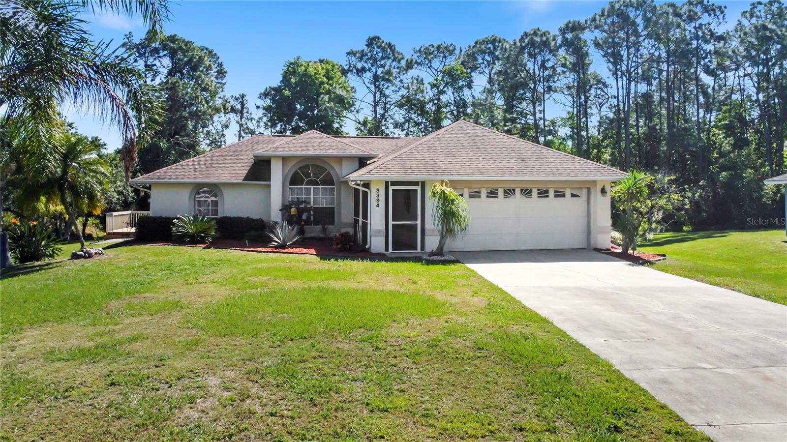 BE SURE TO TAKE A LOOK AT VIRTUAL TOUR LINK 1 FOR YOUR PERSONAL WALKTHRU OF THE PROPERTY. A large, peaceful property, located at the end of a quiet cul-de-sac in the Wilderness. This cute 3 bedroom, 2 bathroom home offers privacy and space as there are no neighbors behind the property. The vault ceilings with an open concept floor plan allows you to feel connected with others in the home while being able to see the beautiful backyard from all central areas. Two of the bedrooms have sliding doors that lead to the solar heated pool as well as a pool bath. The screened in area at the pool has a large deck with sunny or shady places to sit while relaxing and overlooking the backyard. Two bedrooms and a bathroom can be separated from the rest of the house with a sliding pocket door. The spacious master bedroom has a walk-in closet and an en suite bathroom with two sinks, a shower, and a corner tub. The long driveway is wide enough to easily fit several. The air conditioner is a new unit (2024) and most of the appliances were replaced in 2023. The roof is only 8 years old. As a member of The Wilderness HOA, homeowners can take advantage of tennis/pickleball courts, a lovely screened in pavilion, beach volleyball, a little park area and a public pool. Located near shopping, restaurants, schools, churches and the Lynx bus stop. Whether you’re looking for a nice neighborhood to raise a family or a quiet place to retire in, this home has everything you need.