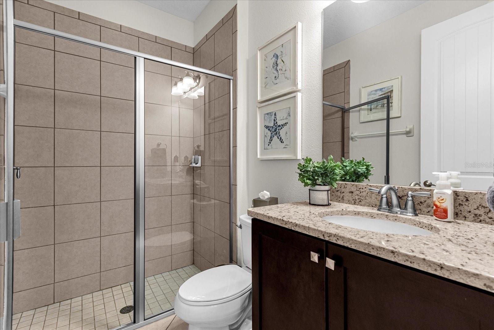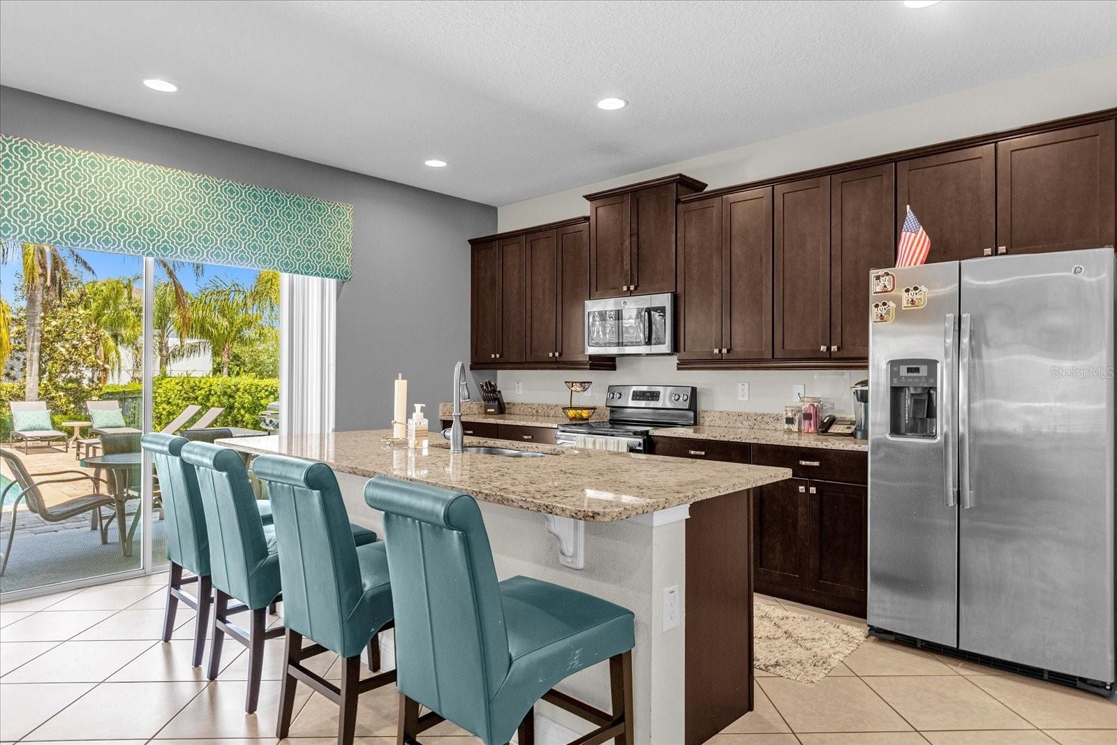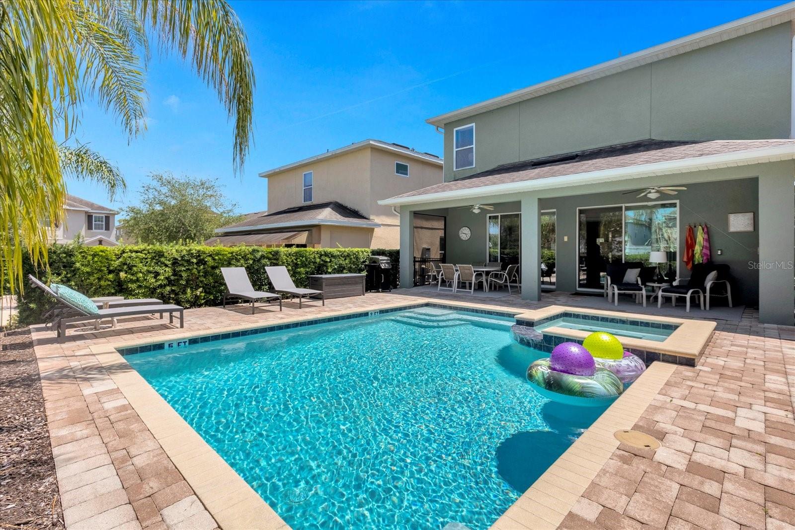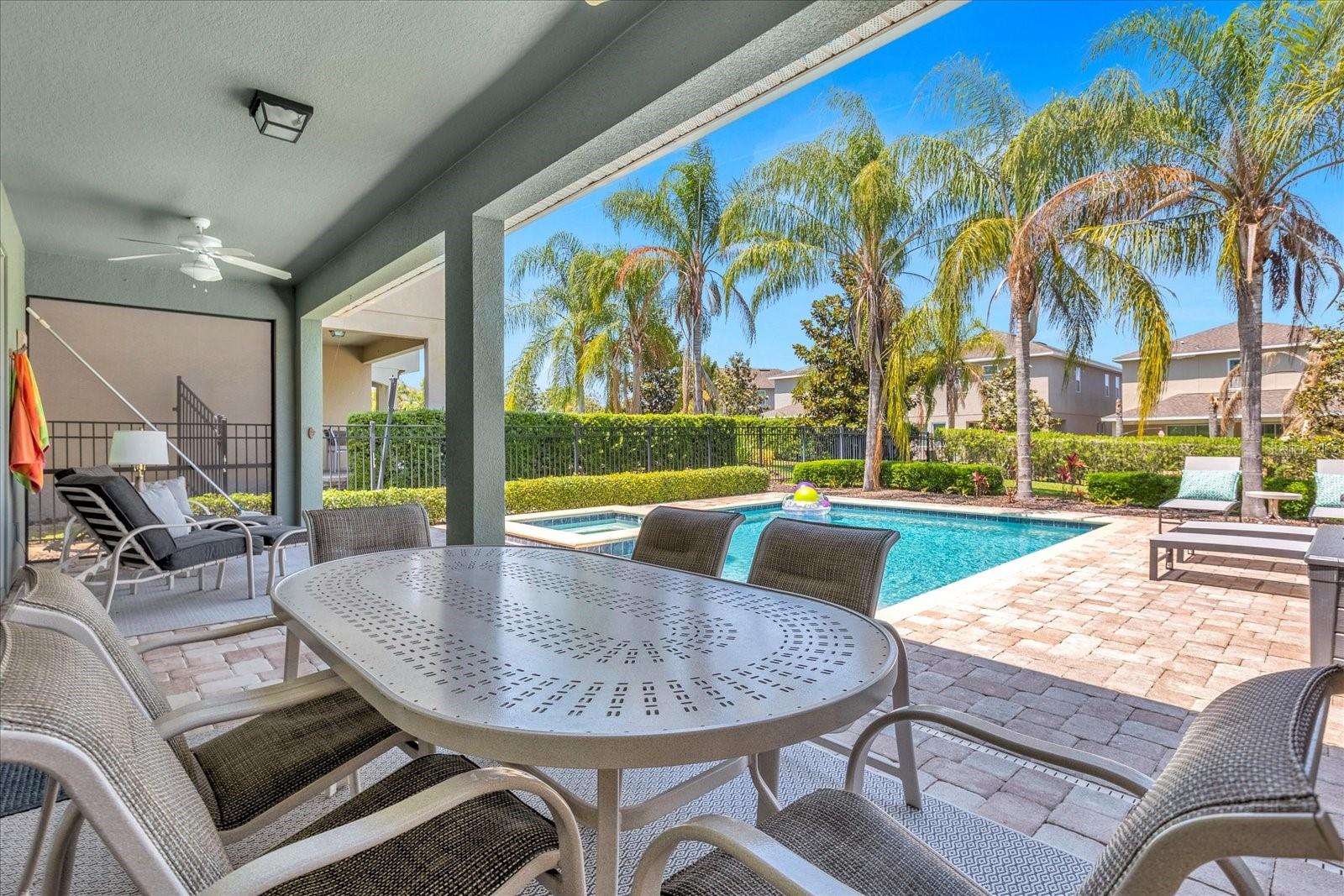 "This fully furnished, move-in ready home exceeds the quality of new construction. This home shows like a new model home come see for yourself. The owners have utilized it as a secondary residence for their family, exhibiting attention to detail throughout. Please note this is a short-term rental community and this home is ready to go as a turn-key investment home with the help of a manager. The Outside fenced are is an in-house mini resort beckons with a large covered lanai, paver decking, a sunning area, and a heated in-ground pool and spa. They have implemented rain gutters encircling the entire property, rare for this subdivision. An independent air conditioner surge protector providing $7,500 in equipment safeguarding that conveys with the house, and a cutting-edge carbon blue light UV A/C-Furnace system to combat mold and mildew. Additionally, the residence boasts upgraded furnishings and décor in pristine condition. Alongside an array of inclusions like a nearly new BBQ grill, lightly used Keurig coffee maker, bicycles for both children and adults, a pool deck box stocked with toys, and enhanced lounge chairs and cushions. Routine maintenance has been upheld with biannual servicing of the air conditioner, furnace, and pool heater." The kitchen boasts upgraded 42-inch dark espresso wood cabinets, stunning granite countertops, and stainless-steel appliances. Downstairs, a spacious guest bedroom, full bathroom, and a transformed garage - turned kid cave with Disney-themed decor and an epoxy-coated floor - await. Upstairs, three guest suites with dark wood vanities and granite tops, an upstairs laundry area, and a generous master suite can be found. The master bedroom includes a sizable walk-in closet and a master bath with double sinks, a garden tub, and a walk-in shower. The HOA fees cover a comprehensive list of services, such as Satellite TV, wireless internet, phone, lawn maintenance (including tree and shrub trimming, landscape re-mulching), bi-weekly pool upkeep, frequent trash collection, pest control, as well as 24-hour gate guard and security patrols. "The Encore Resort Water park, a prominent feature of the Encore, occupies a sprawling 10-acre space located at the core of the resort, adjacent to the Encore Resort clubhouse. Additionally, onsite restaurants are available at the clubhouse. A modern fitness center, equipped with cardio and toning machines, free weights, and more, caters to the fitness needs of guests. Encore Resort members have privileged access to two hard-surface tennis courts, three sand volleyball courts, 1.5 basketball courts, and a soccer pitch, providing a haven for sports enthusiasts. Shuttle service to Disney is also provided. This resort has it all and too much to mention.