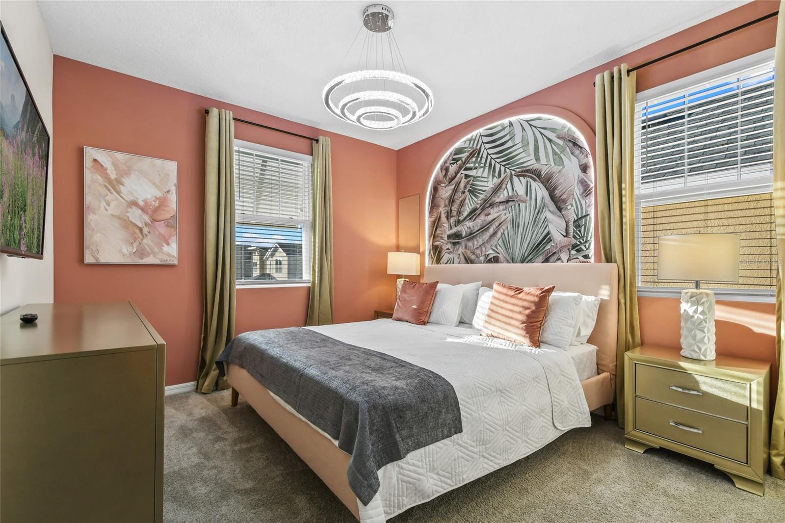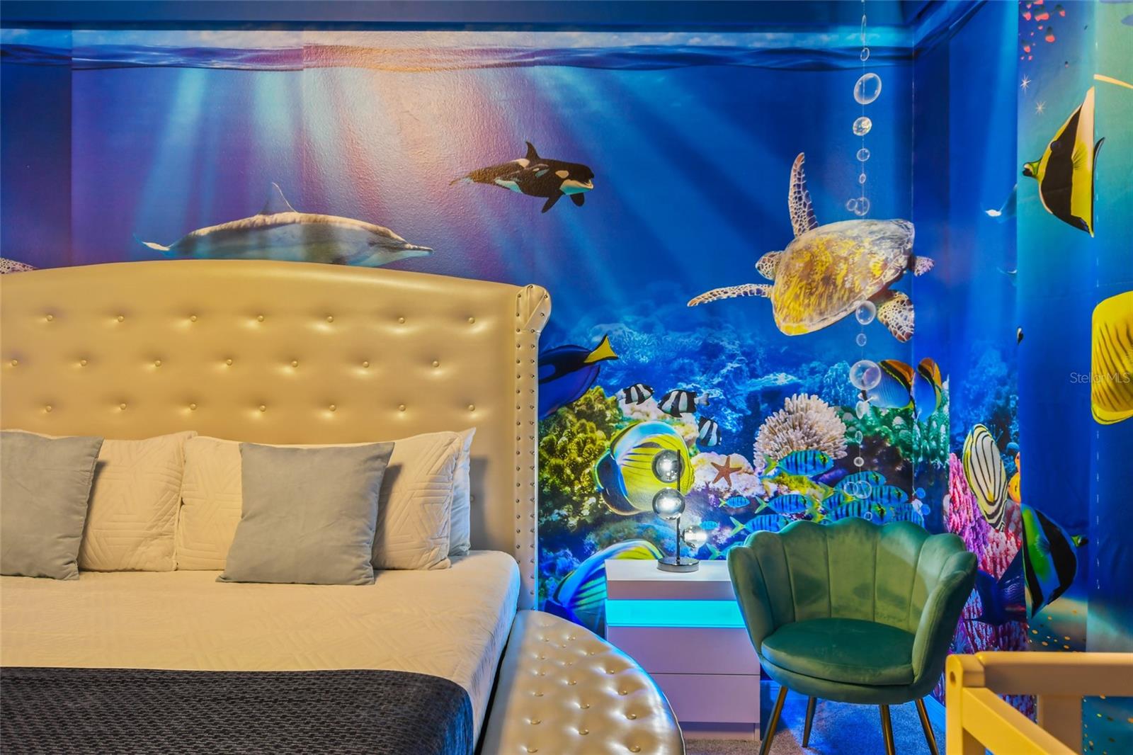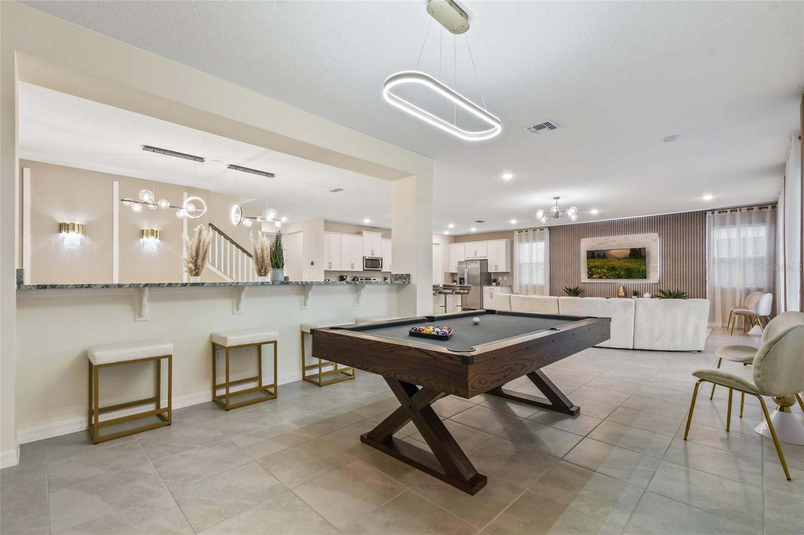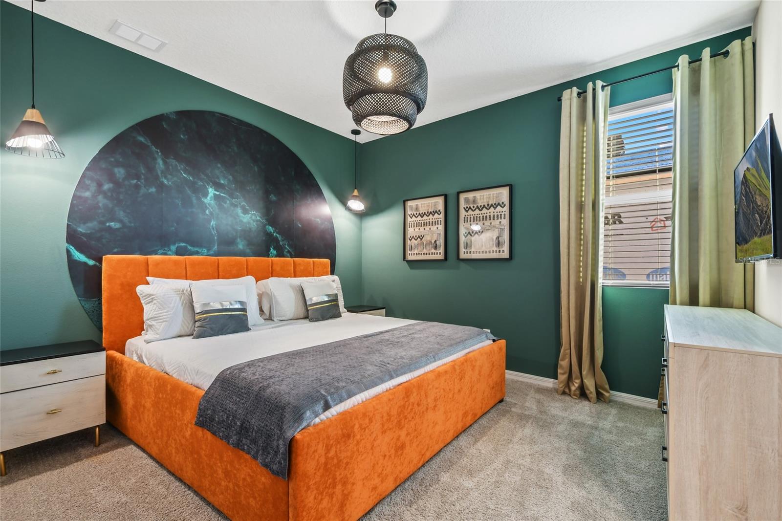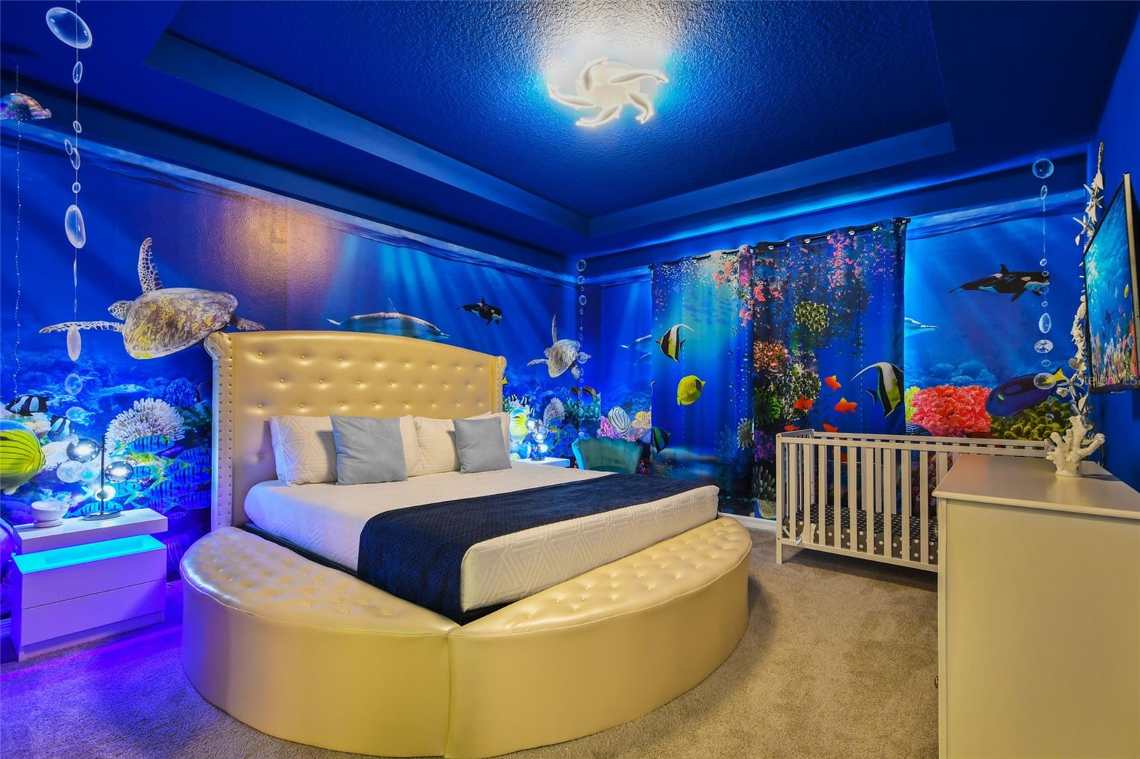 Priced to sell! TURNKEY INCOME PRODUCING SHORT-TERM RENTAL HOME! You are sure to be impressed by this stunning 9-bedroom, 6.5-bathroom property located in the sought-after Solara Resort community. Built in 2022, the home is beautifully decorated with themed and customized furniture, making it popular for rentals with high occupancy rates and daily rate. Upon entry, you're welcomed by a spacious, brightly lit living room with high ceilings and large windows that flood the space with natural light. The open floor plan seamlessly connects the living area to the dining space and kitchen, creating an ideal setting for entertaining. The kitchen boasts modern appliances, granite countertops, and ample storage, with a large island and breakfast bar perfect for morning coffee or interacting with guests while cooking. The primary bedroom with a ocean theme, located on the first floor, includes a walk-in closet and an en-suite bathroom with dual sinks, a soaking tub, and a separate shower. Upstairs, discover eight additional bedrooms, five bathrooms, and a large loft converted into a media room, providing ample space for family and guests. The two-car garage has been transformed into a game room, offering endless entertainment options for guests. Outside, the spacious backyard provides plenty of room for outdoor activities. The house is equipped with solar panels, offering savings on utility bills. Solara Resort features a state-of-the-art clubhouse with a full-service restaurant, ice cream parlor, and coffee bar. Fitness enthusiasts can enjoy the gym, while outdoor lovers can take advantage of the basketball, beach volleyball, and soccer facilities. The zero-entry pool, surrounded by cabanas, a poolside tiki bar, and a splash pad, offers endless recreation options. HOA fees include Basic Cable & Internet, Landscaping Maintenance, Valet Trash Service, and Common Area Maintenance. Located approximately 8 miles from Walt Disney World and a short drive to Universal, SeaWorld, and International Drive, Solara Resort offers convenience and luxury for vacation home or investment property buyers. Don't miss this opportunity!