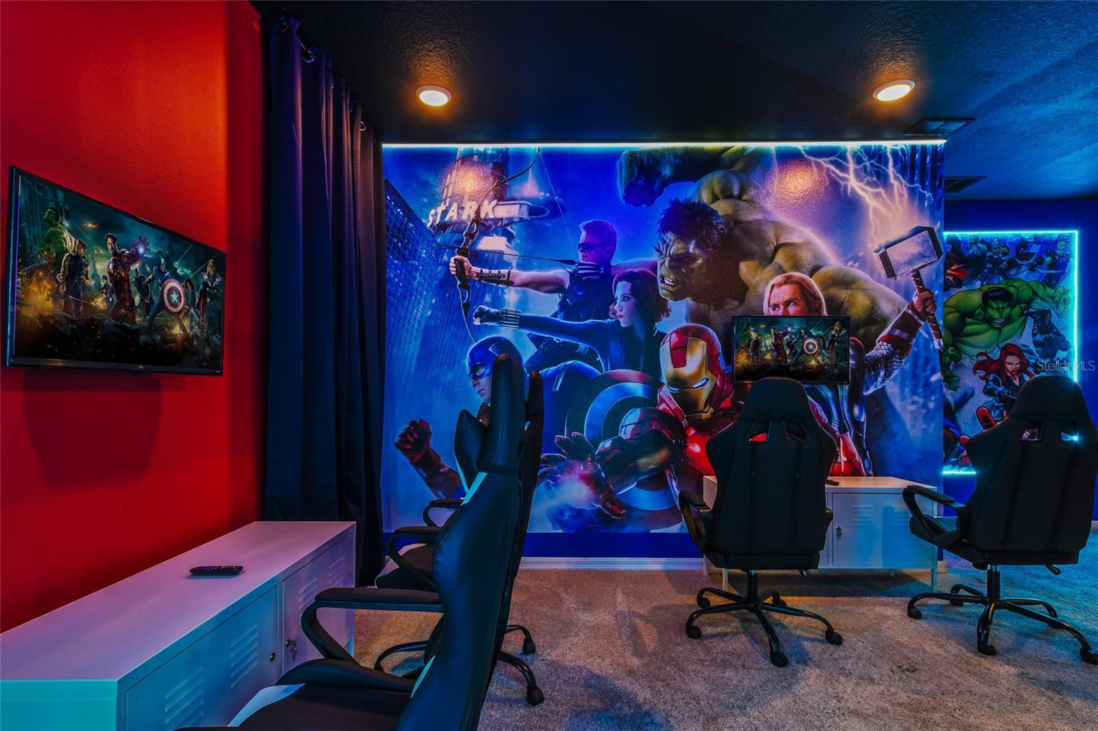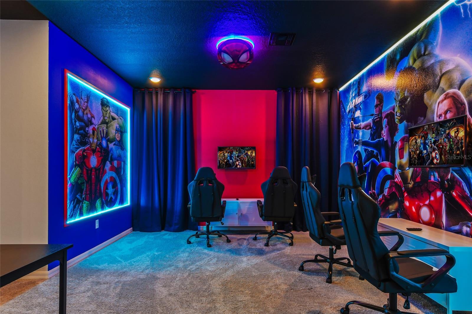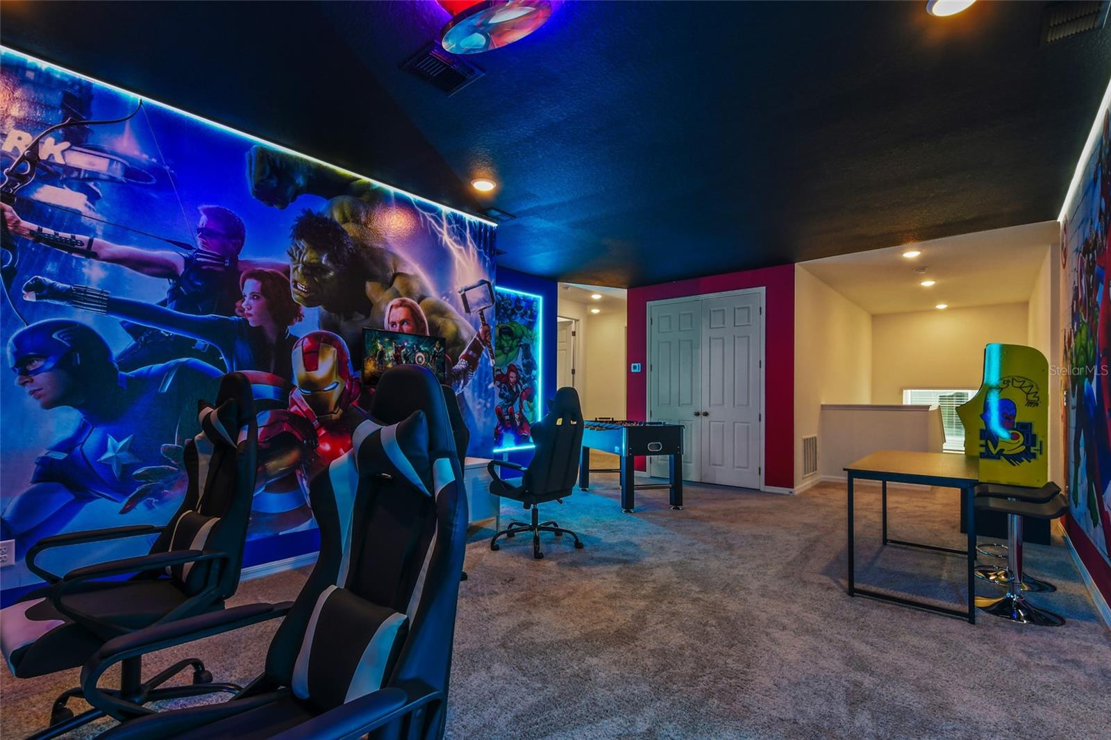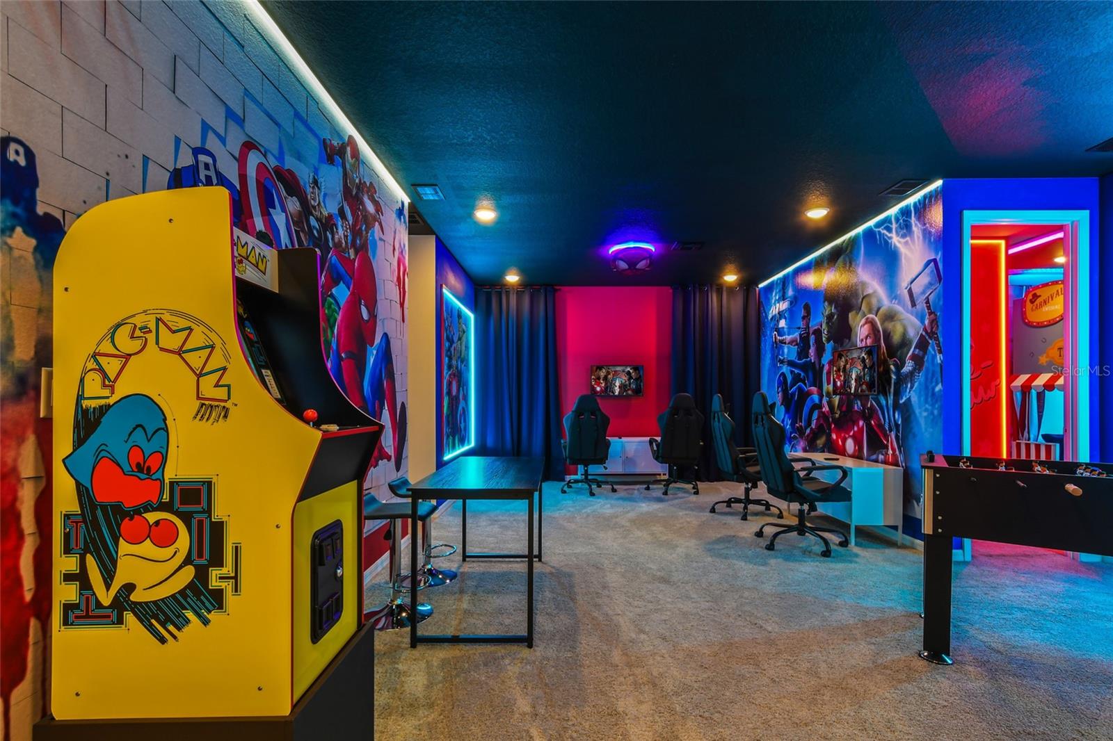 PRICED TO SELL! TURNKEY INCOME PRODUCING SHORT-TERM RENTAL HOME! This property generated approximately $80k in gross rental income so far in 2024 with more future bookings, presenting a lucrative opportunity for investors looking to capitalize on the thriving rental market in the area! Welcome to the resort-style paradise at Solara Resort, where luxury living and vacationing blend seamlessly. Nestled approximately 8 miles from Walt Disney World and within a short drive to Universal, SeaWorld, and the popular I-Drive, this gated resort community is your gateway to the heart of all the magic Orlando and Central Florida has to offer. This stunning 9-bedroom, 6.5-bathroom property, built in 2022, is tastefully decorated and features a private pool. The interior boasts tile flooring with an elegant, resort-like charm and upgraded lighting. Every corner of the house is designed with meticulous attention to detail, making it feel like a page from a designer magazine brought to life. The home features two primary suites, one on each floor, offering flexibility and privacy for every member of your party. The first floor includes an additional guest bedroom suite, while the second floor, with a few themed bedrooms, transports you to different worlds of wonder. The kitchen's stunning granite countertops and gleaming stainless steel appliances are a chef's dream. Upstairs, you'll find more bedrooms and a large loft turned into a media room, providing plenty of space for family and guests. Additionally, the two-car garage has been converted into a game room, offering endless fun for guests. Open the sliders, and you'll find a covered patio and a screen-enclosed private heated pool, providing a serene backdrop for your relaxation. Solara Resort's amenities seem endless: a heated grand pool, surf simulator, a fantastic bar and grill, a coffee bar, and a sundries store. For those who enjoy exercise and the outdoors, the fitness center and outdoor fitness lawn allow you to keep up your daily exercise routines. Other exciting amenities include a sand volleyball court, soccer field, full-sized basketball court, indoor and outdoor lounges, workstations, a tween/teen hangout center, and a playground. And let's not forget the pool bar and poolside cabanas. Your dream vacation home awaits at Solara Resort. Here, you'll find all the elements of a perfect getaway: luxury, adventure, and a home that embraces you with warmth and style.