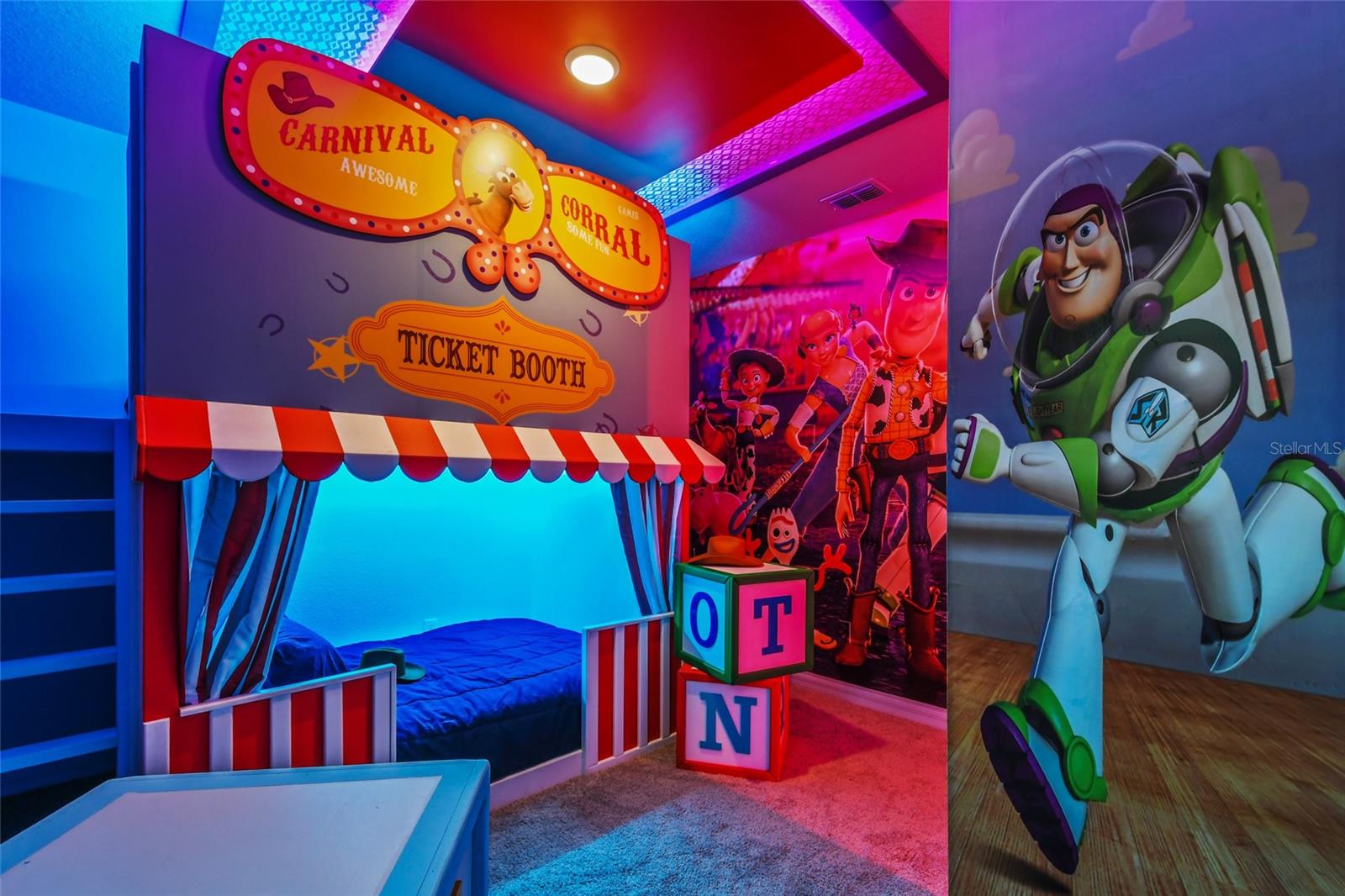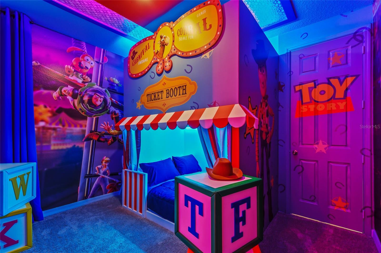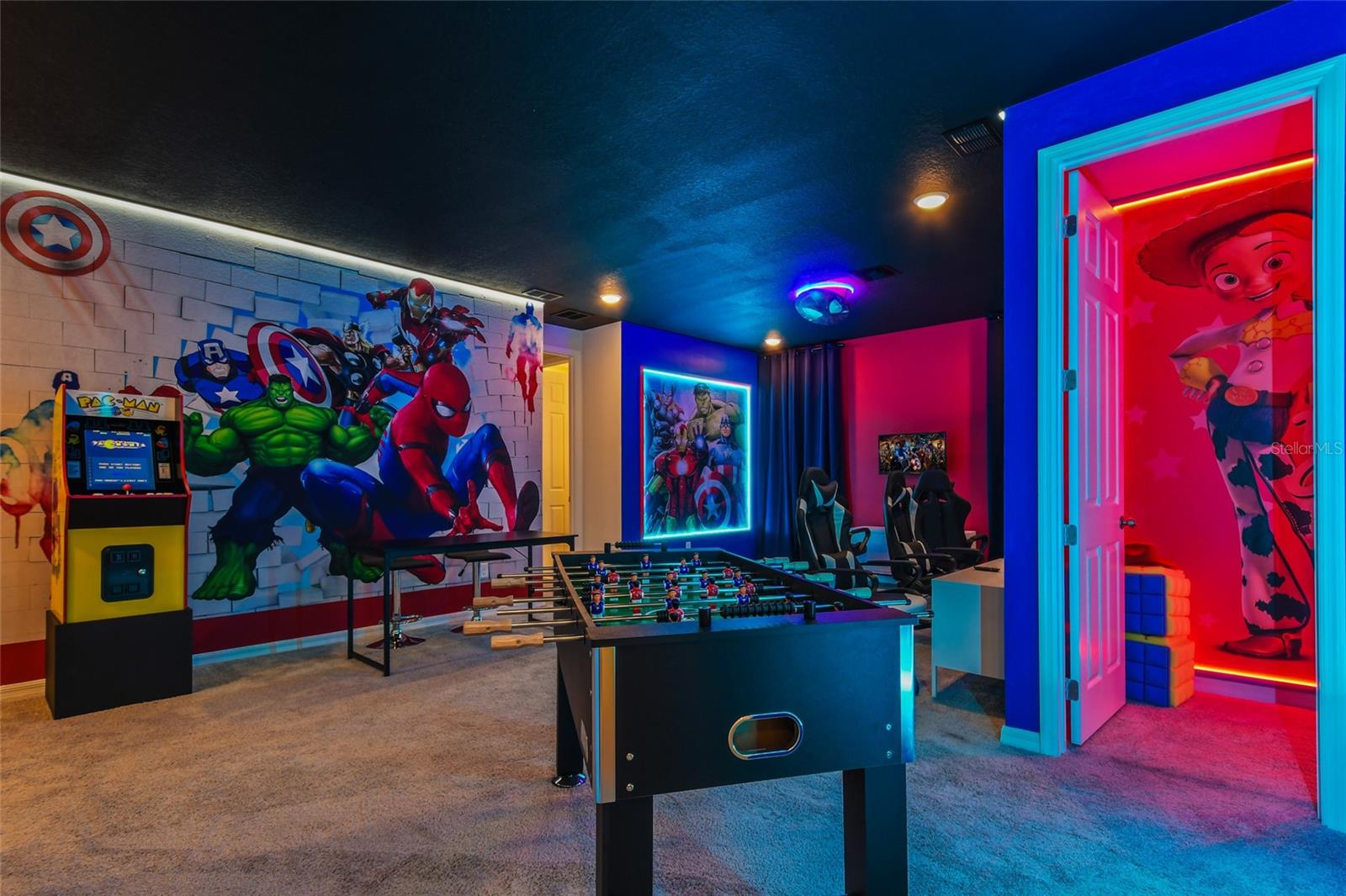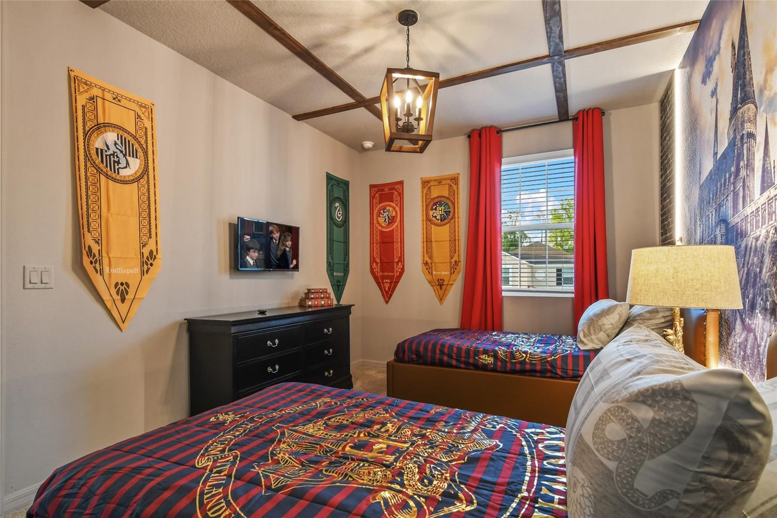 PRICED TO SELL! TURNKEY INCOME PRODUCING SHORT-TERM RENTAL HOME! This property generated approximately $80k in gross rental income so far in 2024 with more future bookings, presenting a lucrative opportunity for investors looking to capitalize on the thriving rental market in the area! Welcome to the resort-style paradise at Solara Resort, where luxury living and vacationing blend seamlessly. Nestled approximately 8 miles from Walt Disney World and within a short drive to Universal, SeaWorld, and the popular I-Drive, this gated resort community is your gateway to the heart of all the magic Orlando and Central Florida has to offer. This stunning 9-bedroom, 6.5-bathroom property, built in 2022, is tastefully decorated and features a private pool. The interior boasts tile flooring with an elegant, resort-like charm and upgraded lighting. Every corner of the house is designed with meticulous attention to detail, making it feel like a page from a designer magazine brought to life. The home features two primary suites, one on each floor, offering flexibility and privacy for every member of your party. The first floor includes an additional guest bedroom suite, while the second floor, with a few themed bedrooms, transports you to different worlds of wonder. The kitchen's stunning granite countertops and gleaming stainless steel appliances are a chef's dream. Upstairs, you'll find more bedrooms and a large loft turned into a media room, providing plenty of space for family and guests. Additionally, the two-car garage has been converted into a game room, offering endless fun for guests. Open the sliders, and you'll find a covered patio and a screen-enclosed private heated pool, providing a serene backdrop for your relaxation. Solara Resort's amenities seem endless: a heated grand pool, surf simulator, a fantastic bar and grill, a coffee bar, and a sundries store. For those who enjoy exercise and the outdoors, the fitness center and outdoor fitness lawn allow you to keep up your daily exercise routines. Other exciting amenities include a sand volleyball court, soccer field, full-sized basketball court, indoor and outdoor lounges, workstations, a tween/teen hangout center, and a playground. And let's not forget the pool bar and poolside cabanas. Your dream vacation home awaits at Solara Resort. Here, you'll find all the elements of a perfect getaway: luxury, adventure, and a home that embraces you with warmth and style.