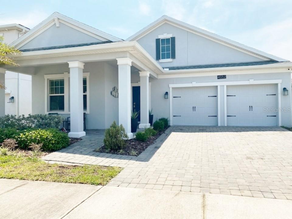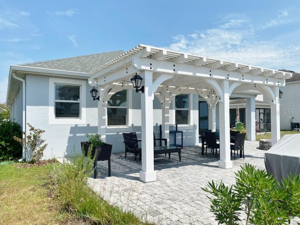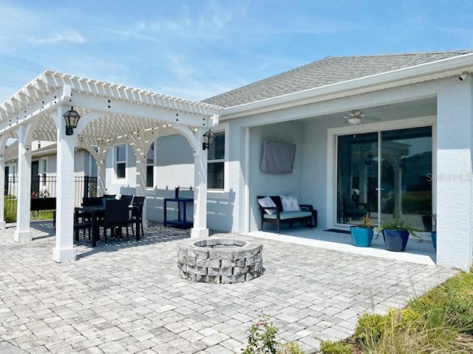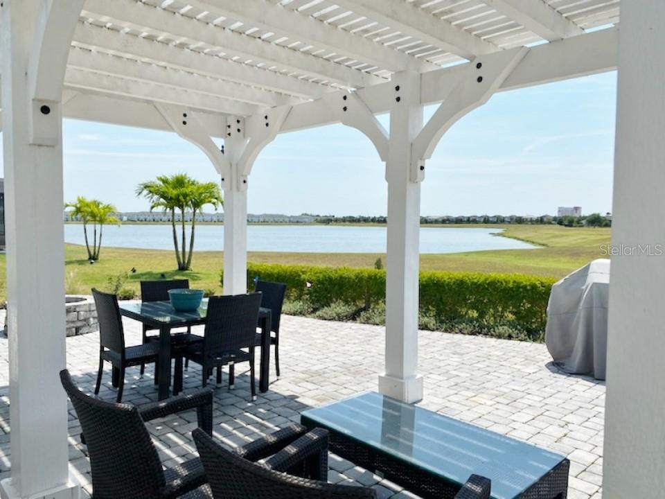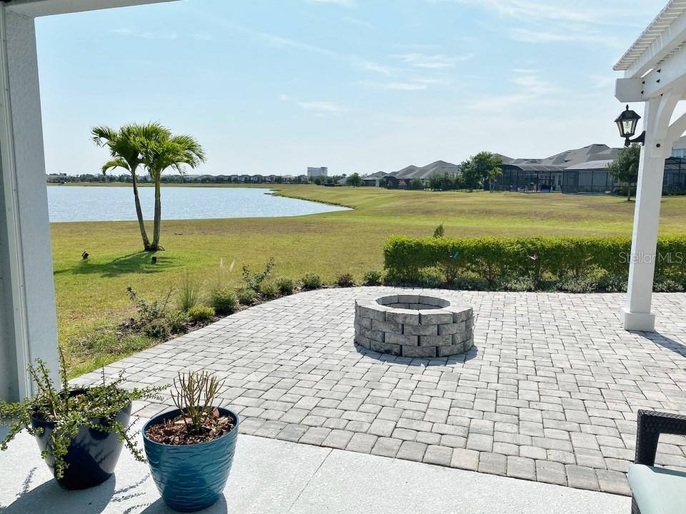 Enjoy a beautifully maintained single story home that also has a large flex room and spectacular water views! The kitchen is open concept and has granite countertops, plenty of cabinet space, a center island, and a pantry. The Bonus/Flex room offers additional flexibility to use as desired. The home has a finished garage with slat walls and overhead hanging storage. There is a walk in closet in the primary bedroom and an additional walk in closet in another bedroom. The patio has stone pavers and a stone fire pit with a wood pergola. The laundry room has recently installed cabinets. Both bathrooms have granite countertops. It is well situated in the community near the amenities including pool, playgrounds, gym, dog park and clubhouse Nearby you will find multiple options for grocery stores, shops, restaurants, and entertainment venues.