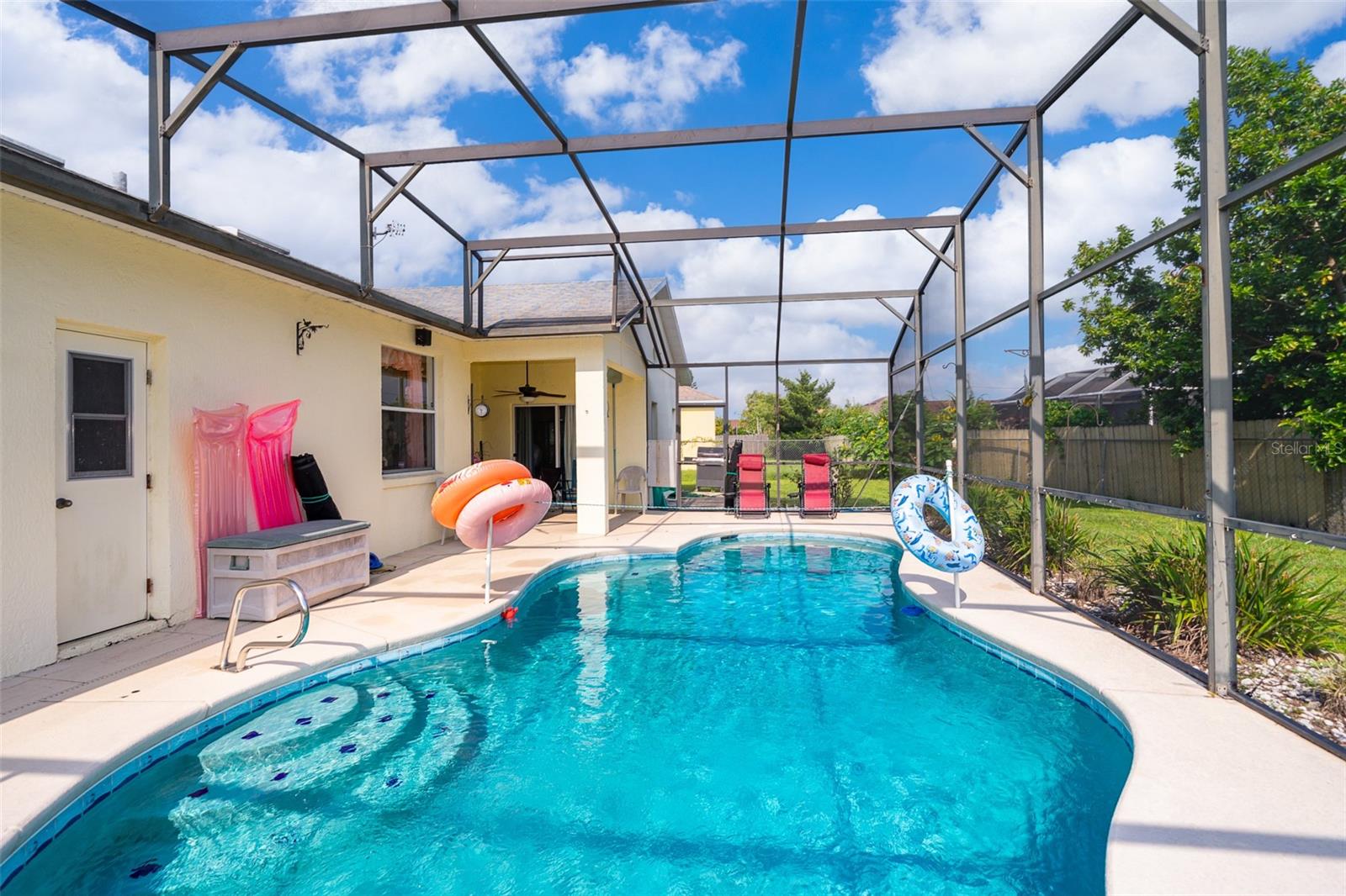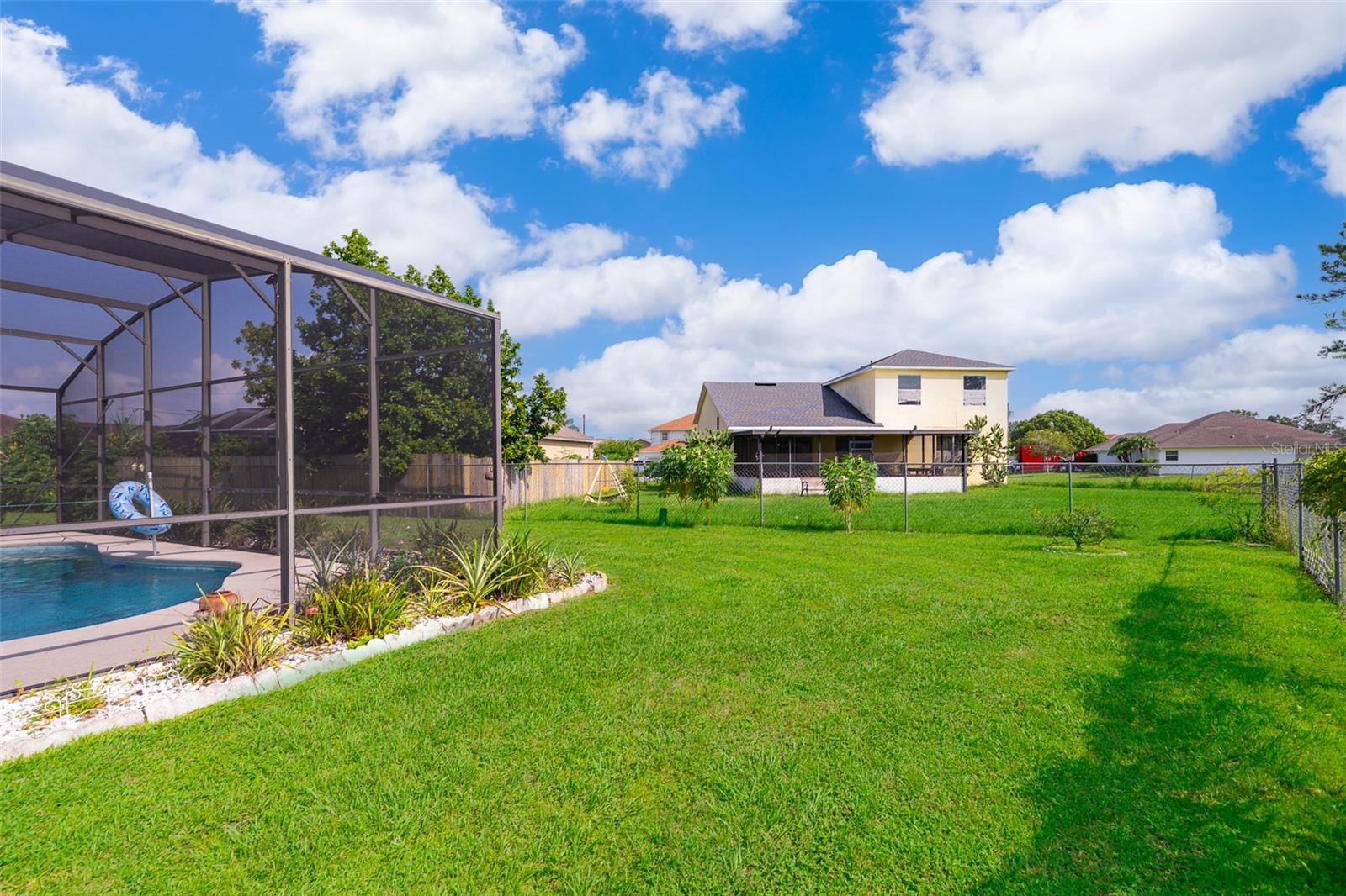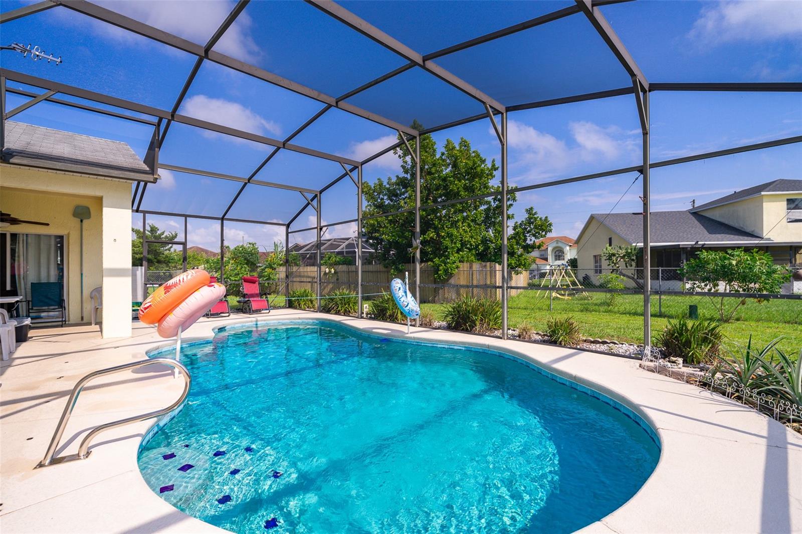 Welcome to your new home in the serene and vibrant community of Poinciana! Nestled on a quiet street with only one side neighbor, 329 Alegriano Court offers a perfect blend of comfort and privacy. This well-maintained single-family residence features 4 bedrooms and 2 bathrooms, designed with modern living in mind. As you step inside, you'll be greeted by an open-concept living area bathed in natural light, creating a warm and inviting atmosphere. The kitchen is a chef's dream, boasting stainless steel appliances, ample counter space, and plenty of cabinets, making it ideal for both everyday cooking and entertaining guests. Plus, the washer and dryer convey with the sale, adding extra convenience to your move. The master suite is a true retreat, complete with a spacious walk-in closet and an en-suite bathroom featuring dual vanities and a soaking tub, perfect for unwinding after a long day. Additional bedrooms with plenty of space for family or guests, with flexibility for a home office or hobby room. Step outside to your private backyard oasis, where a beautiful pool with a screen enclosure awaits. Whether you're enjoying a morning swim or hosting a summer barbecue, this outdoor space is perfect for year-round enjoyment. Located in the heart of Poinciana, this home is just 30 minutes away from the magic of Disney World, making it an ideal location for both everyday living and vacationing. You'll also find local parks, schools, shopping, and dining just minutes away. With easy access to major highways, commuting to nearby cities like Kissimmee or Orlando is a breeze. Whether you're a first-time homebuyer or looking for your next investment property, 329 Alegriano Court is a must-see. Don’t miss this opportunity to own a piece of Poinciana’s charm!